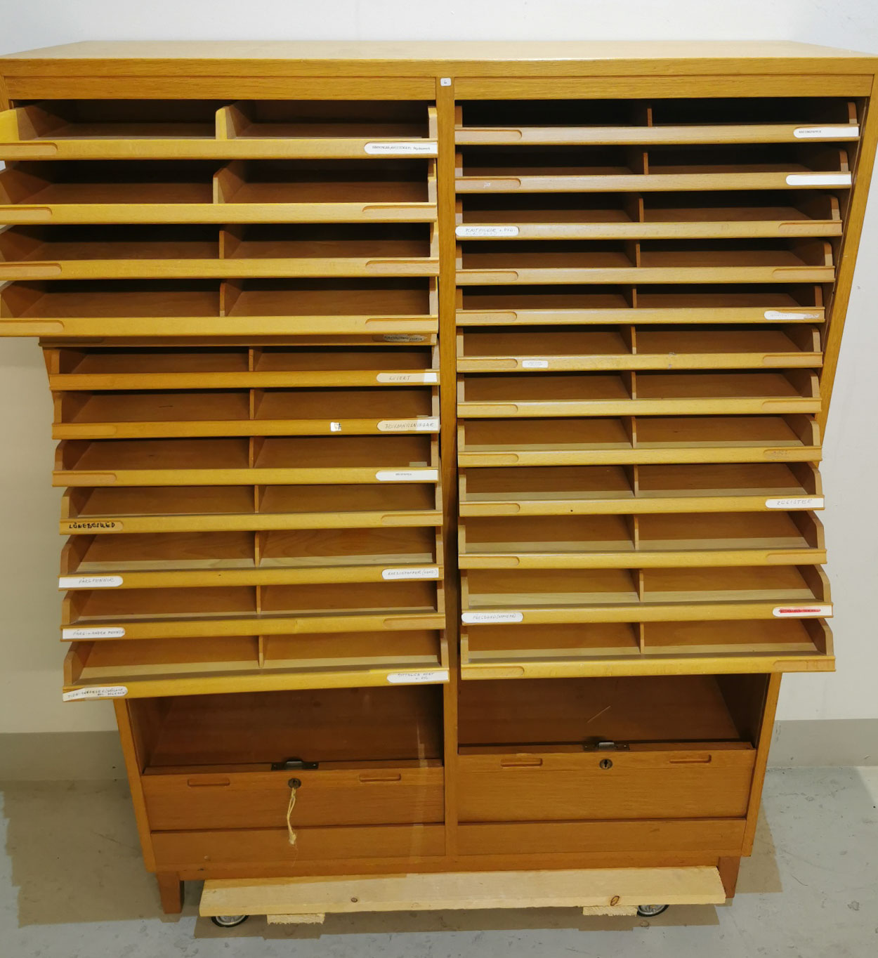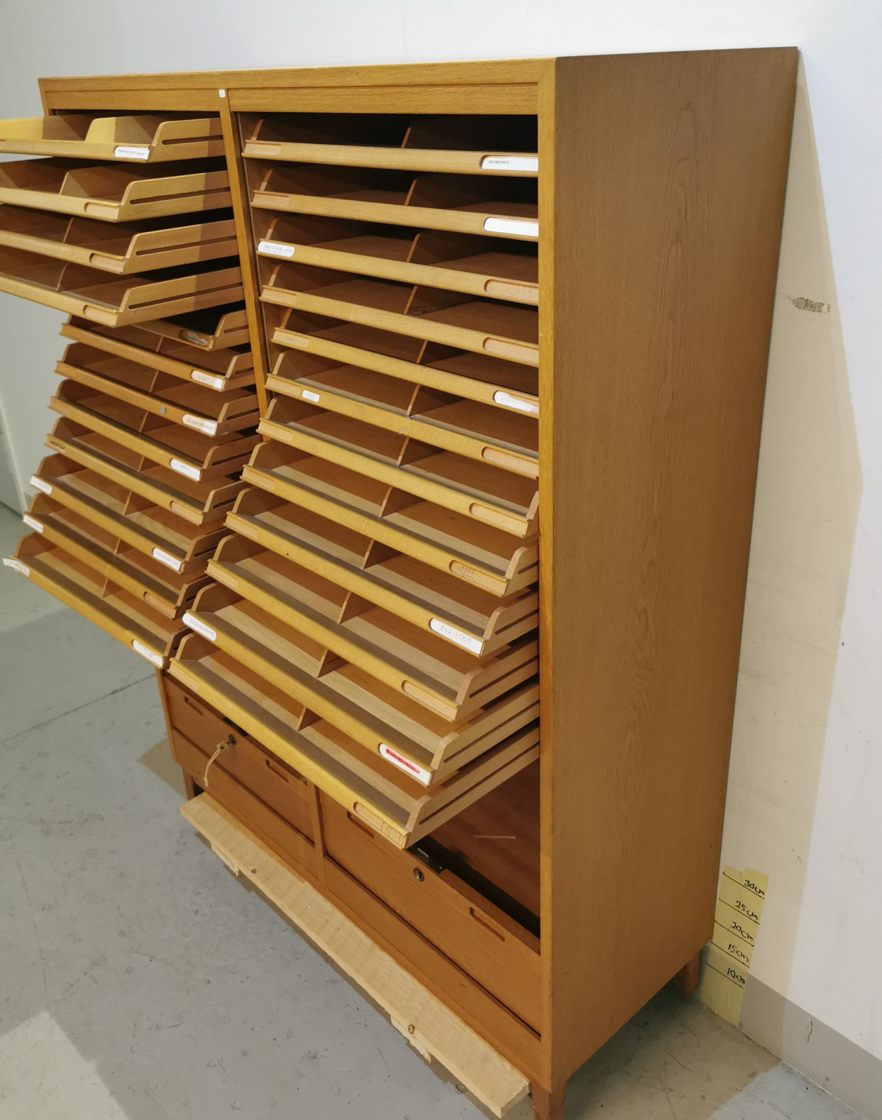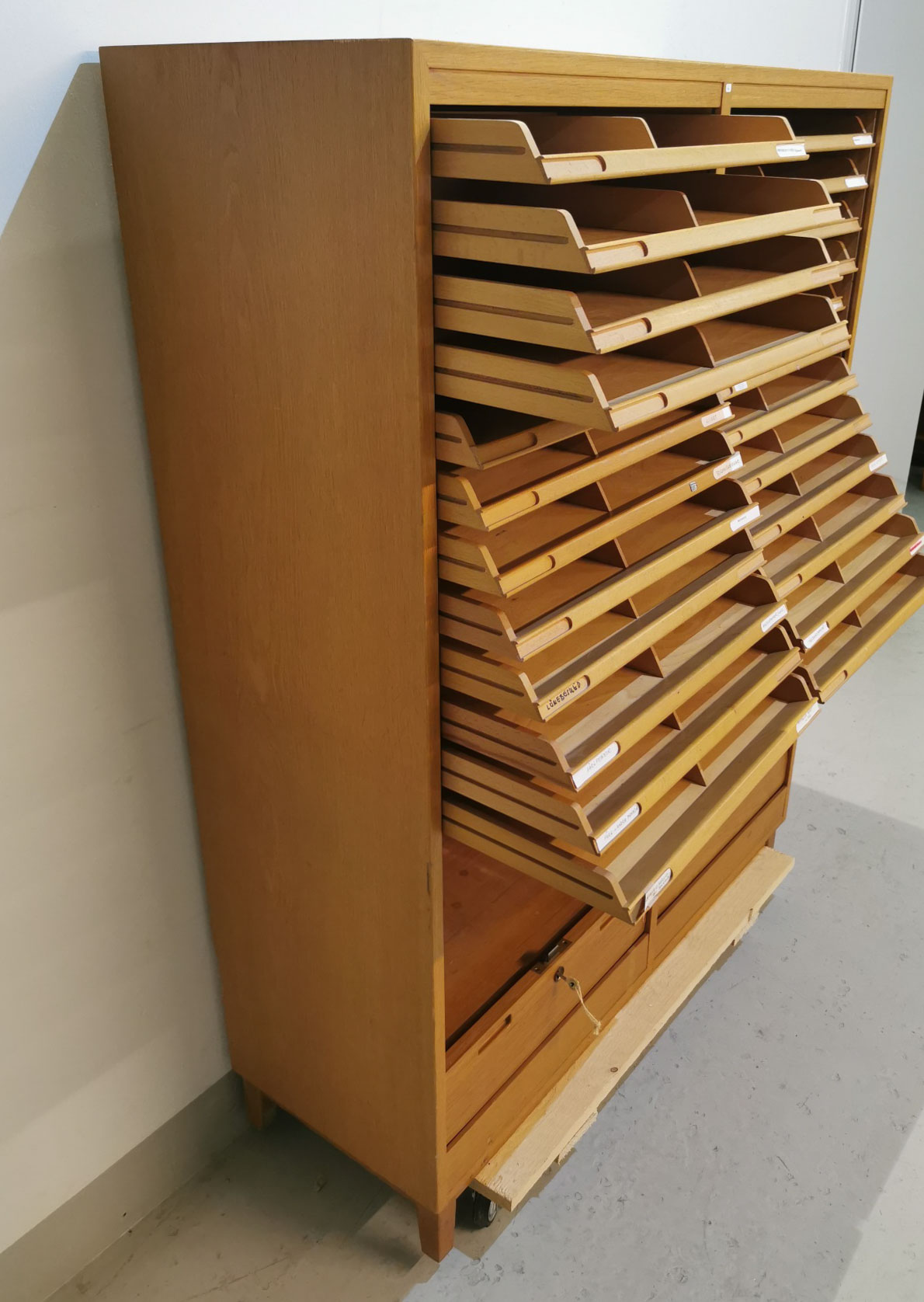 Tamminen arkistokaappi, kahdella lukollisella rulo-ovella, reilusti tilaa kansioille ja papereille, noin 1940-luvulta
