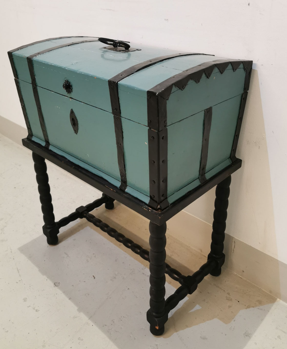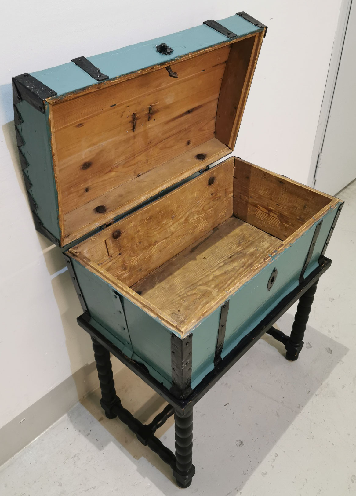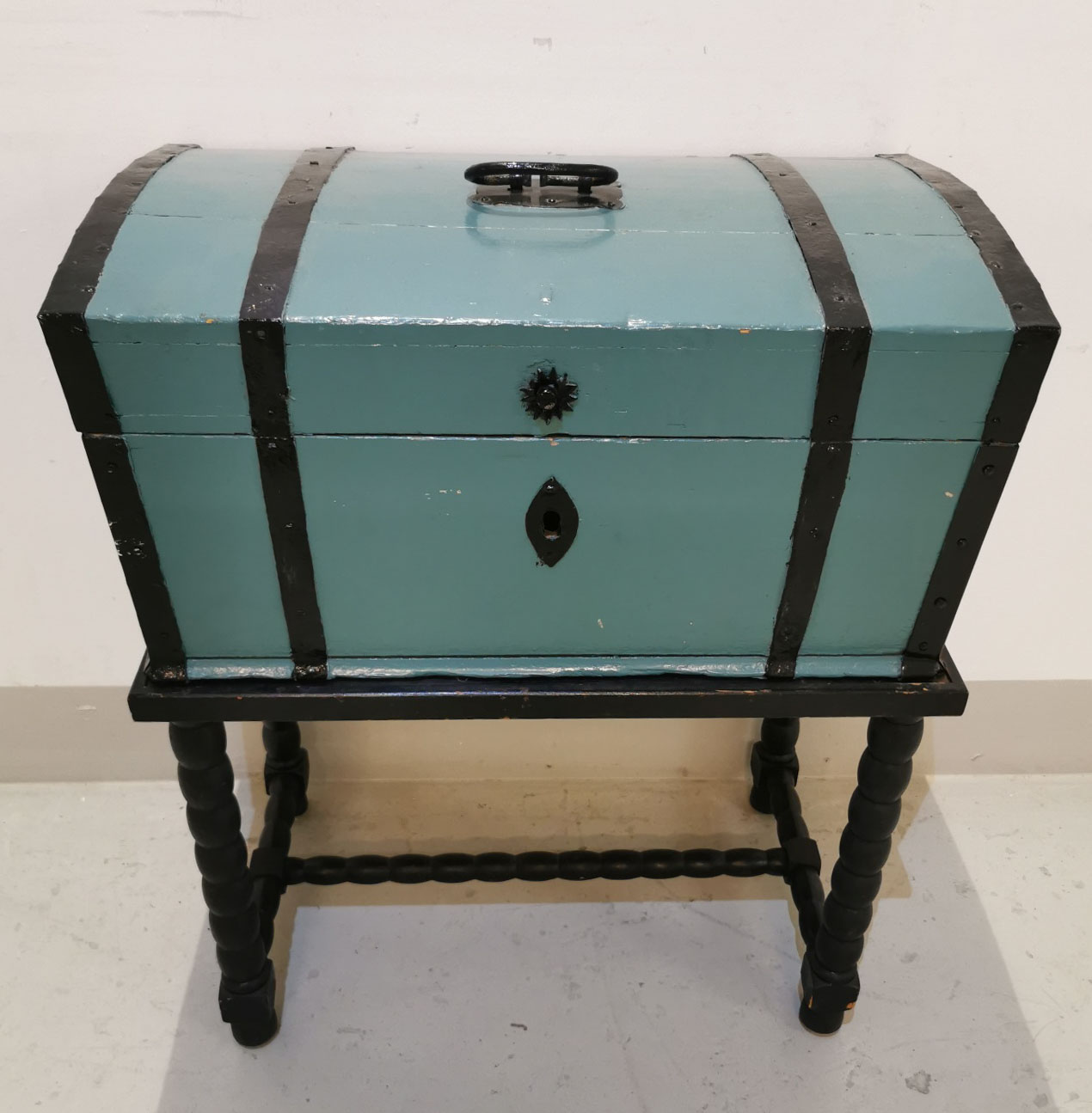 Pienempi arkku jalustalla, 2 – osainen, arkku sininen, jalusta musta, 1800 luvulta,