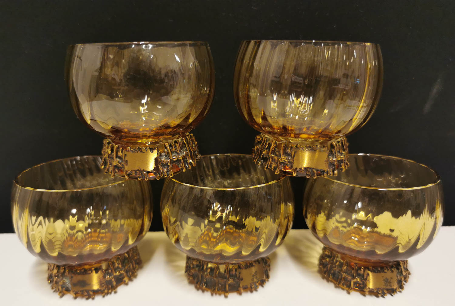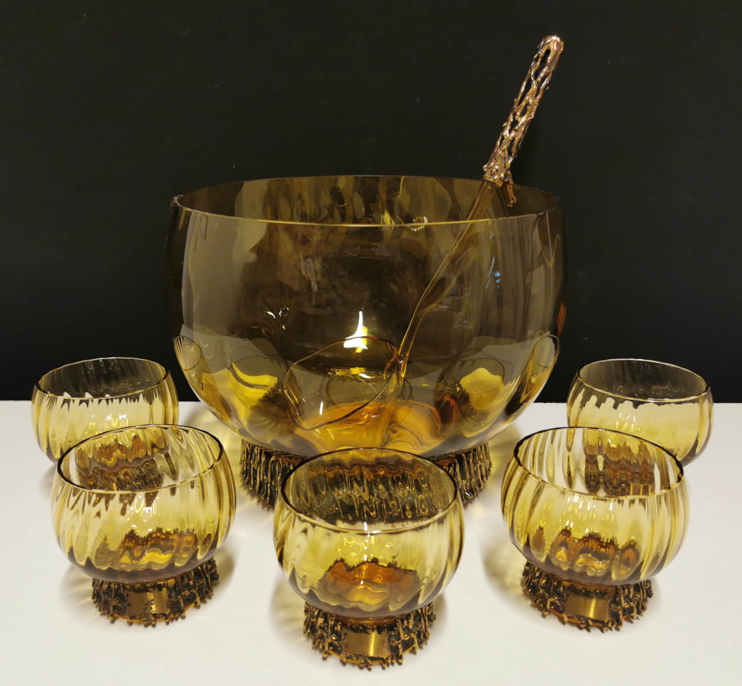Boolisetti. T. Sarpaneva, Iso kulho, lasinen kauha, mukeja 5 kpl, kauhassa pientä nirhaumaa. 7 osaa.
