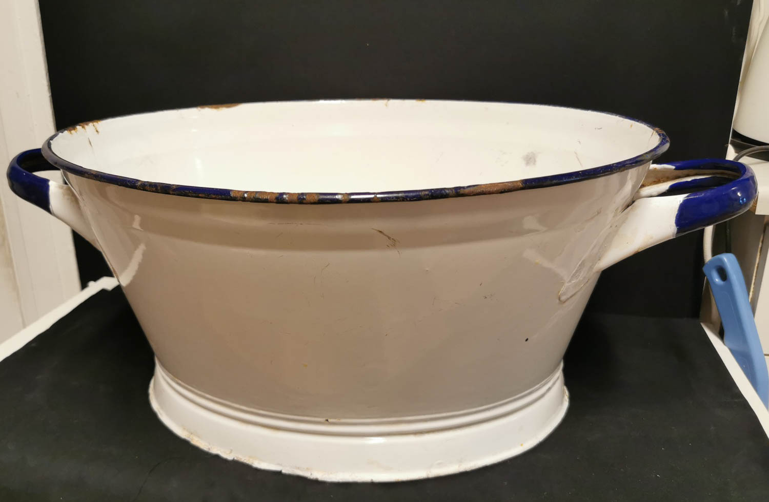 Valkoinen, emaalinen palju, siniset kahvat, 50 x 40 cm + kahvat, korkeus 24 cm