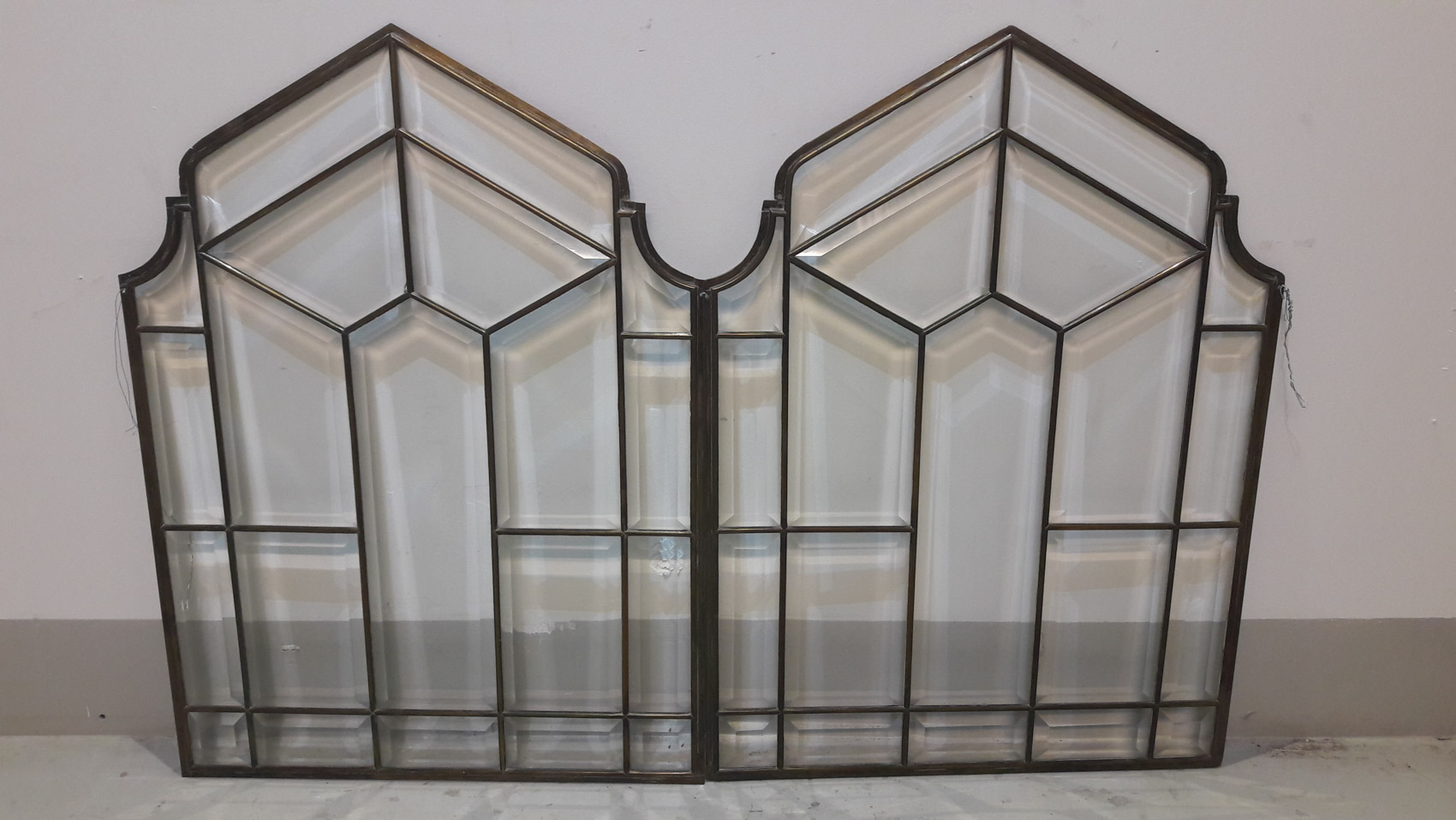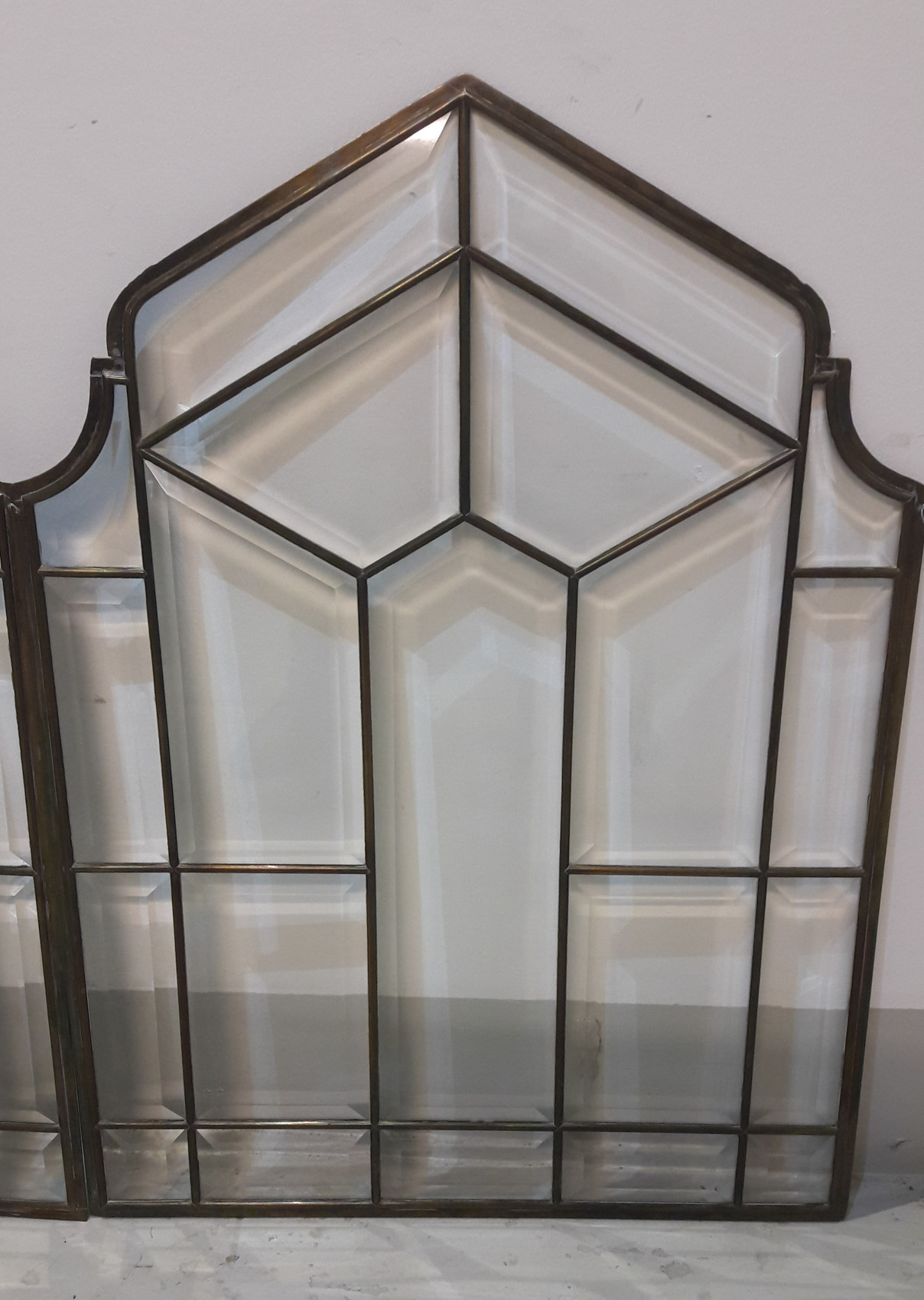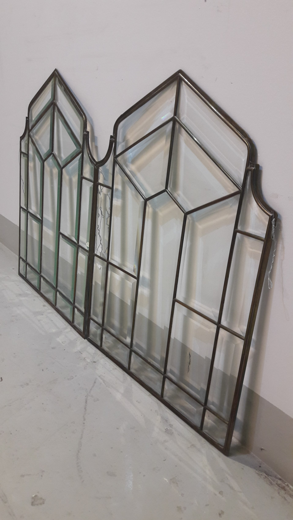 Fasettihiotut lasit, messinkikehyksissä, 1900 luvun alku, 2kpl, myydään parina, korkeus 68cm leveys 50cm. Hinta 395€ pari.