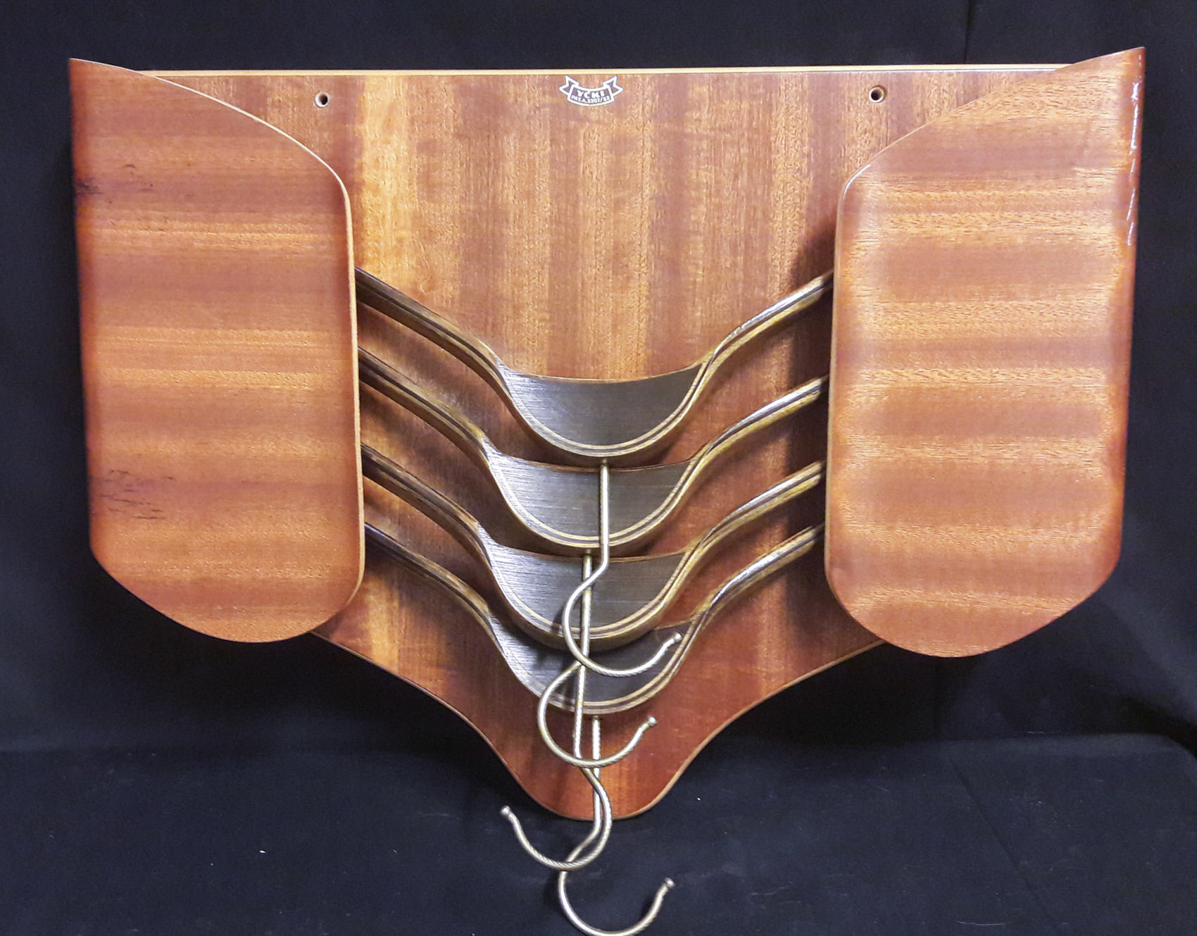 Retro henkariteline, sekä 4 kpl henkareita, teline kiinnitetään seinään kahdella ruuvilla, 1950-luku, leveys 49cm korkeus 38 cm.