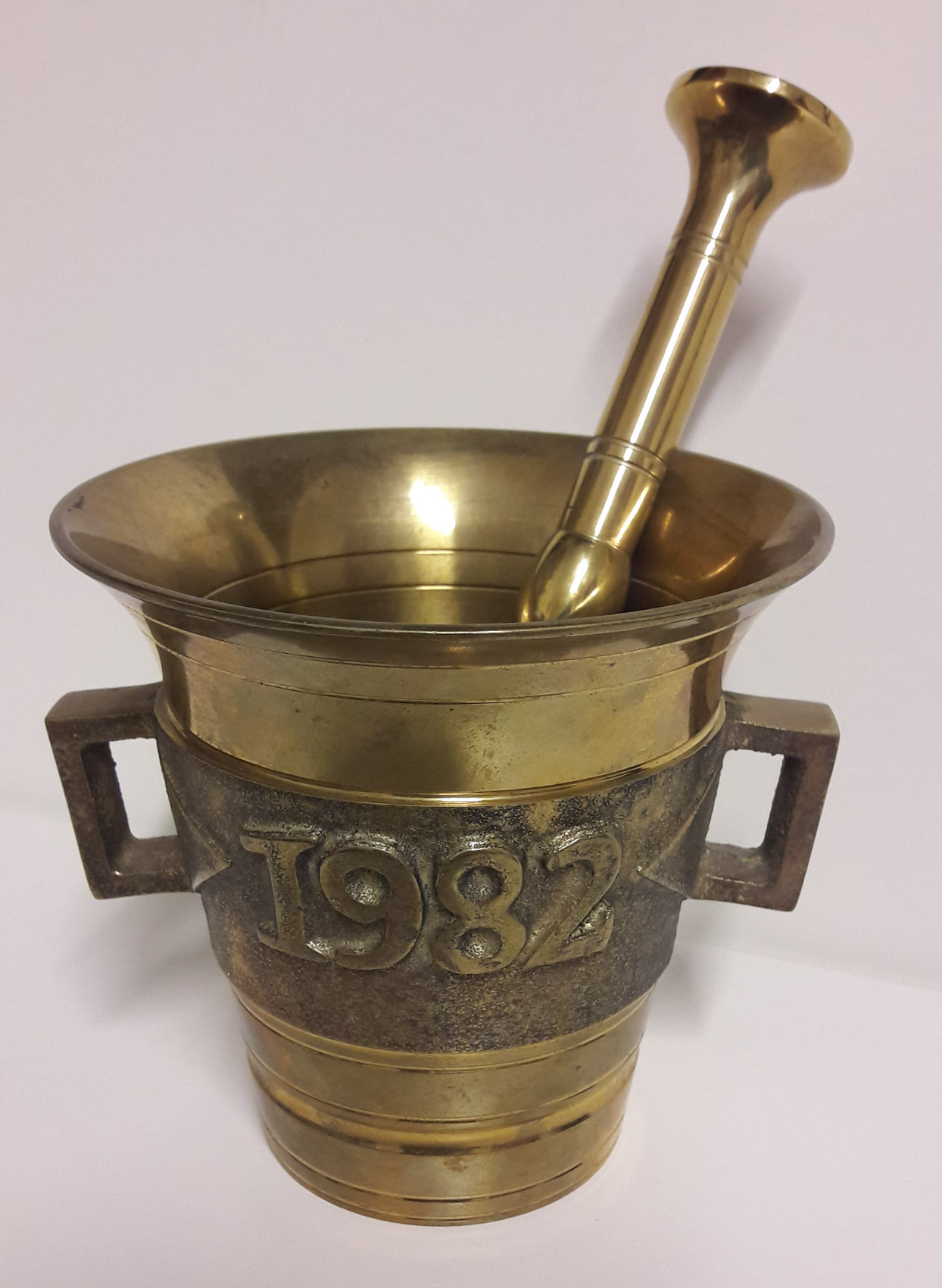 Messinkinen huhmare, vuosiluvulla 1982, valmistaja Skultuna Ruotsi, halkaisija 11.5 cm, korkeus 11cm