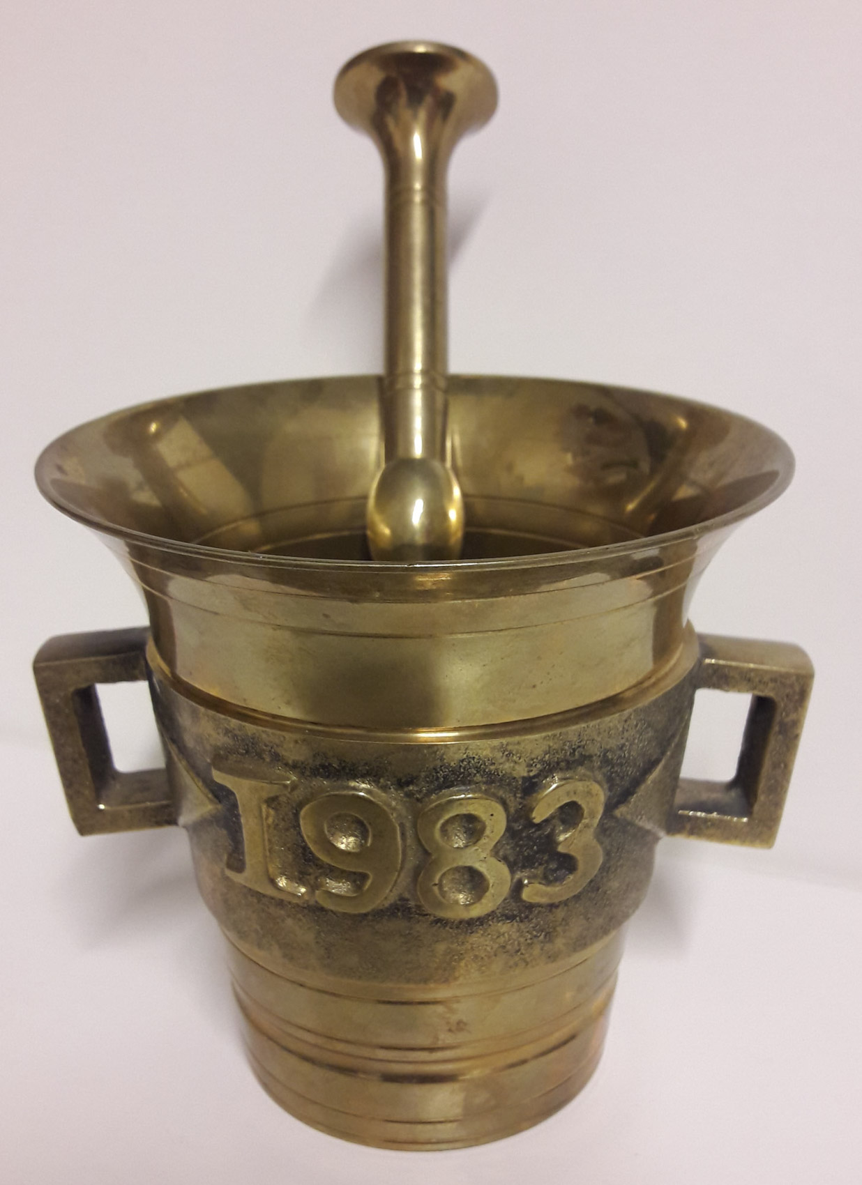 Messinkinen huhmare, vuosiluvulla 1983, valmistaja Skultuna Ruotsi, halkaisija 12cm korkeus 12cm