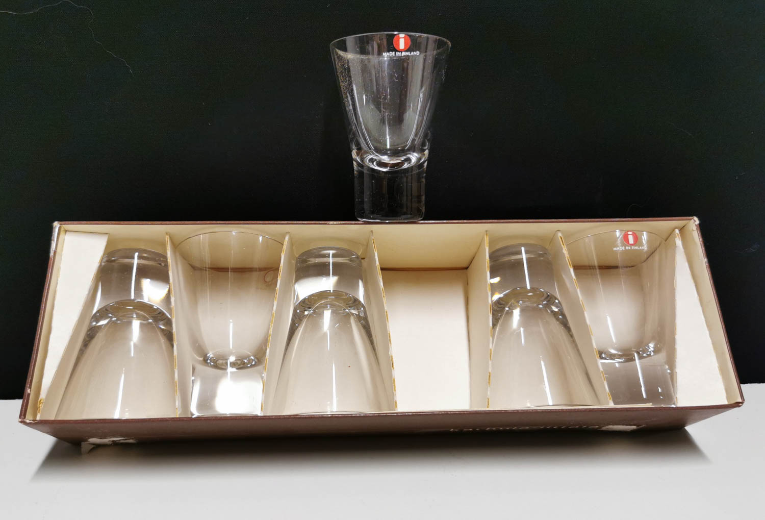 Karhula-Iittala, snapsilasit 6kpl, korkeus 7.3 cm halk 5 cm, alkuperäisessä laatikossa 59€ 6kpl