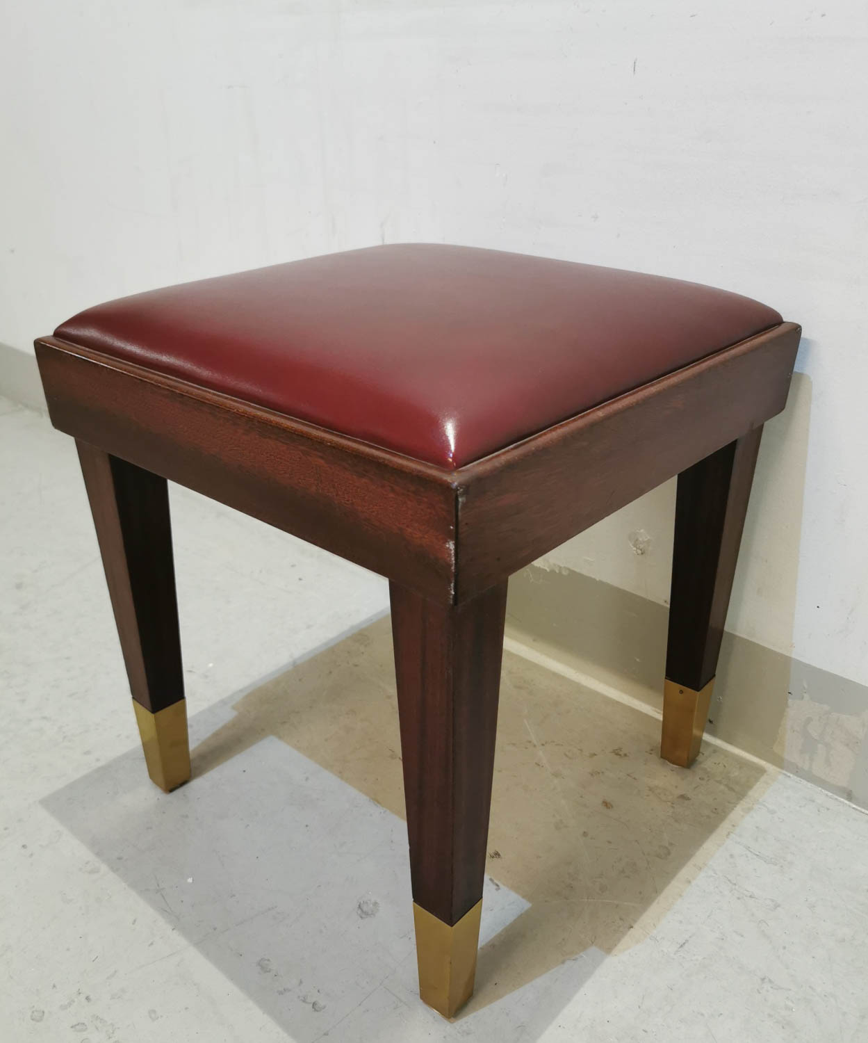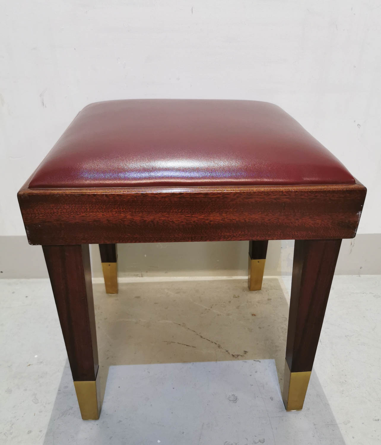 Mahonkinen jakkara, nahkaistuimella, messinkiset hylsyt jaloissa, erittäin laadukas jakkara 1930-luvulta, 43 x 43 cm korkeus 46 cm.