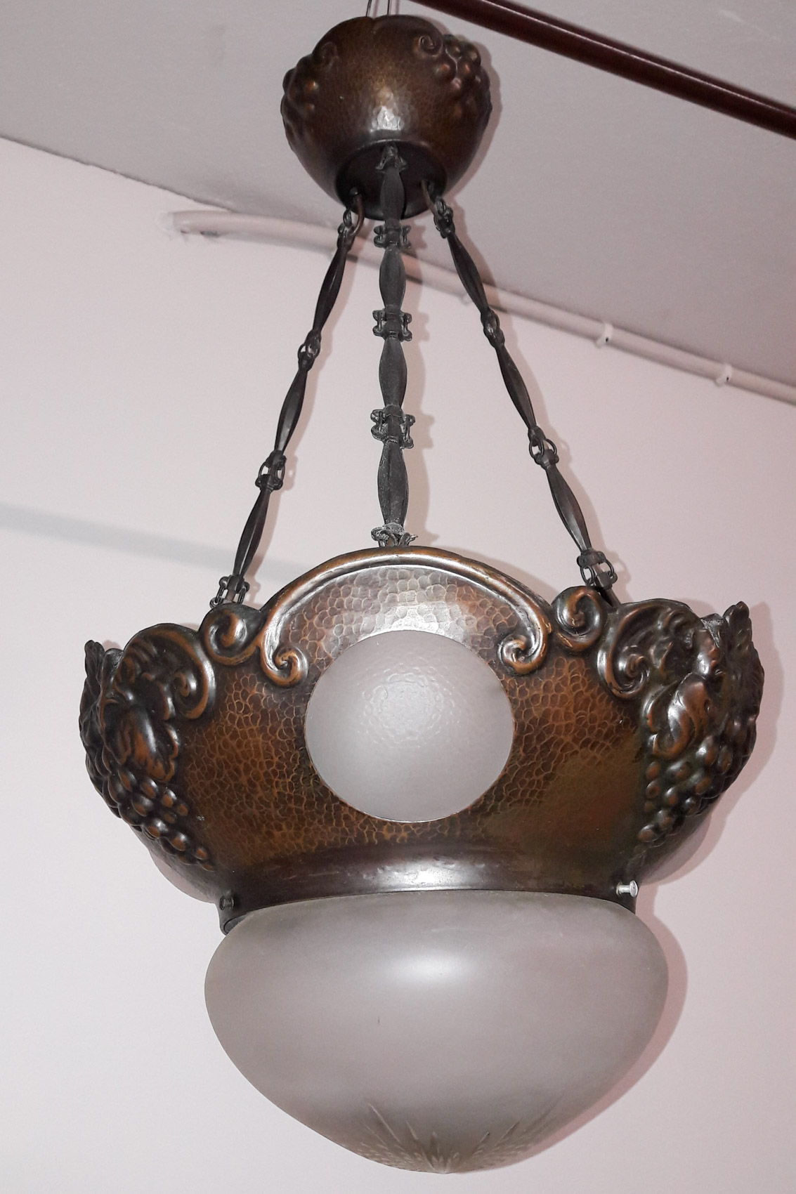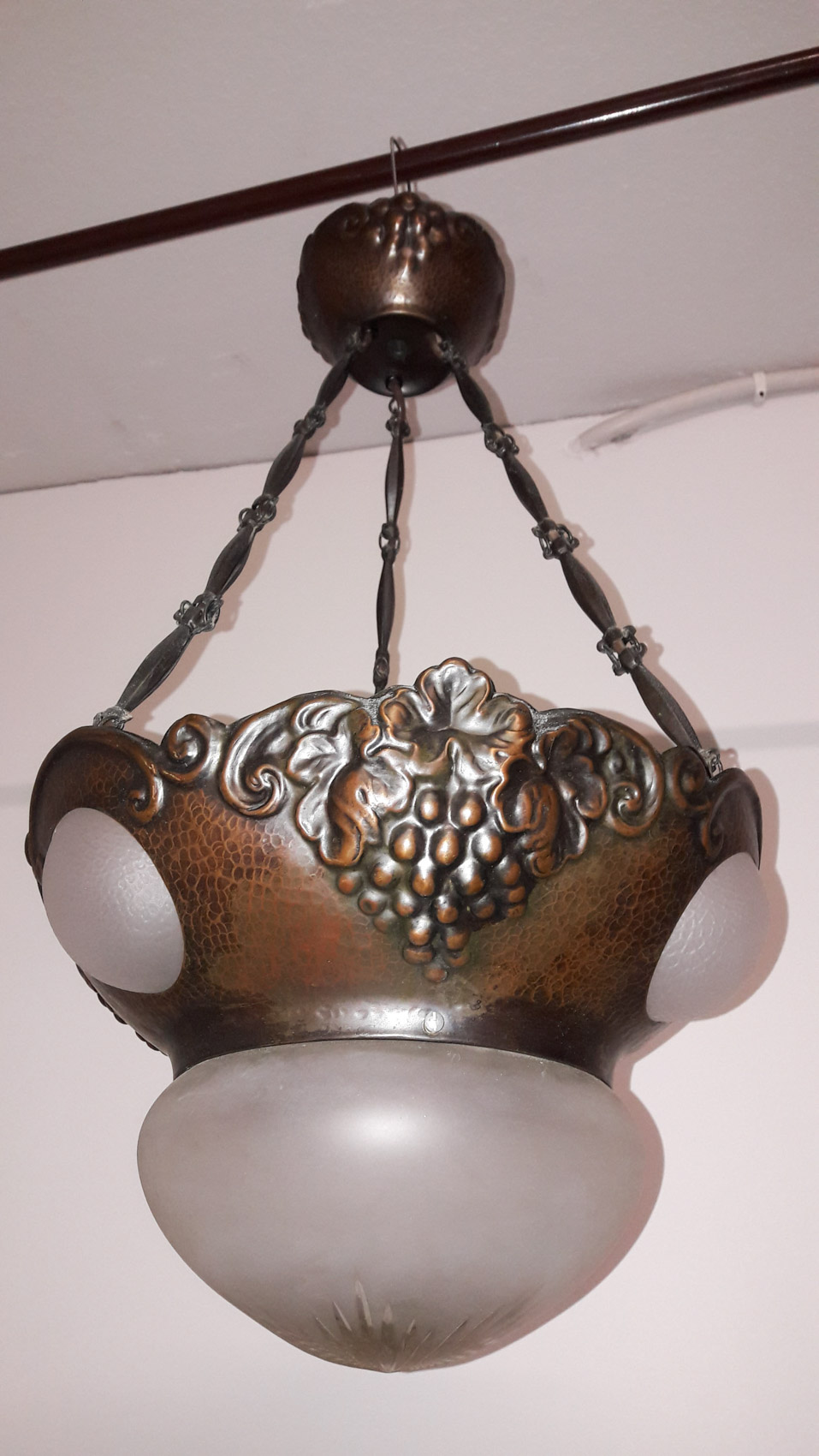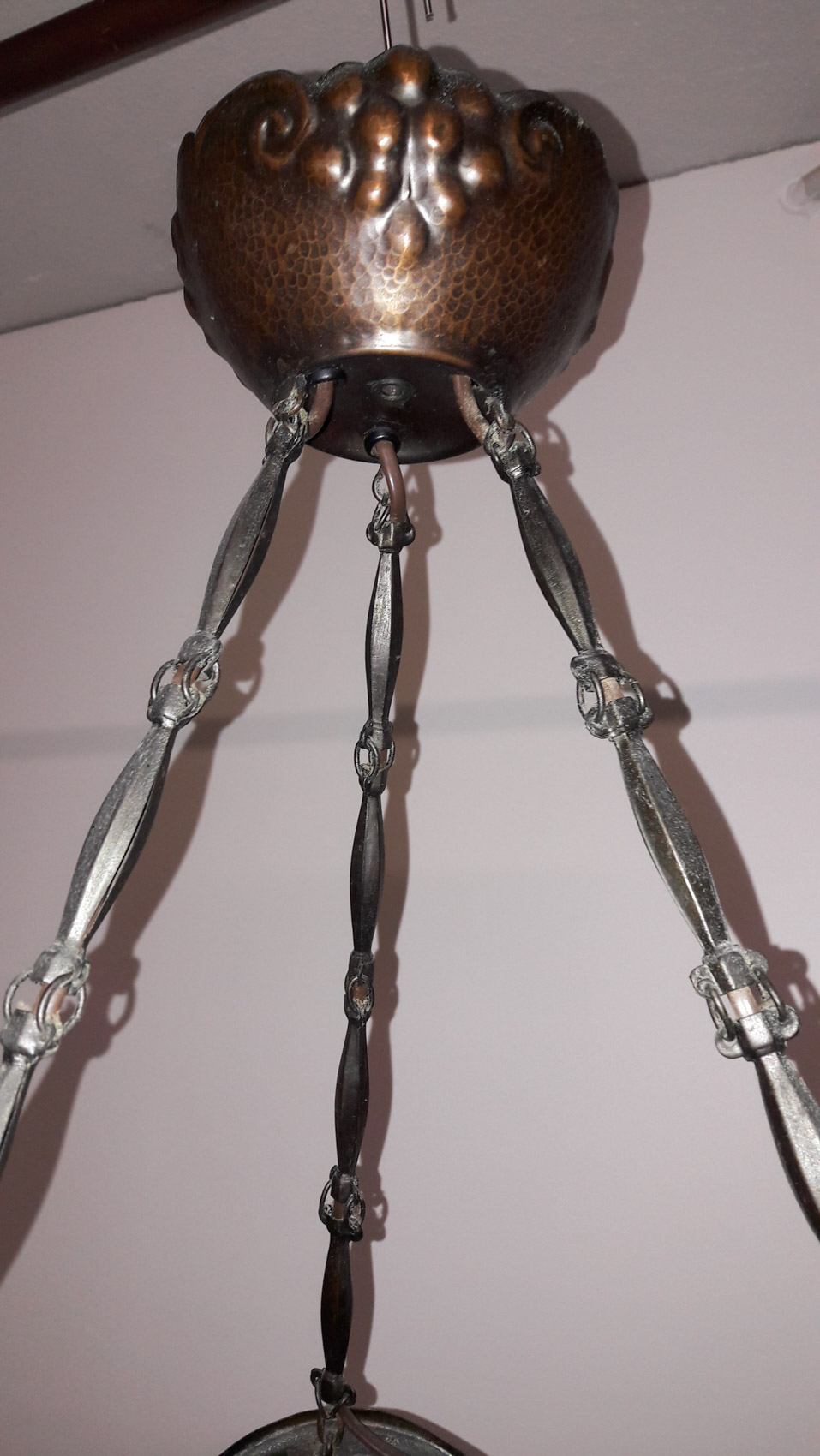 Kuparinen todella näyttävä jugendvalaisin, 1900 luvun alku, 4 valopistettä, ns kilpikonnaketjuilla, rypälekuvioinen runko.