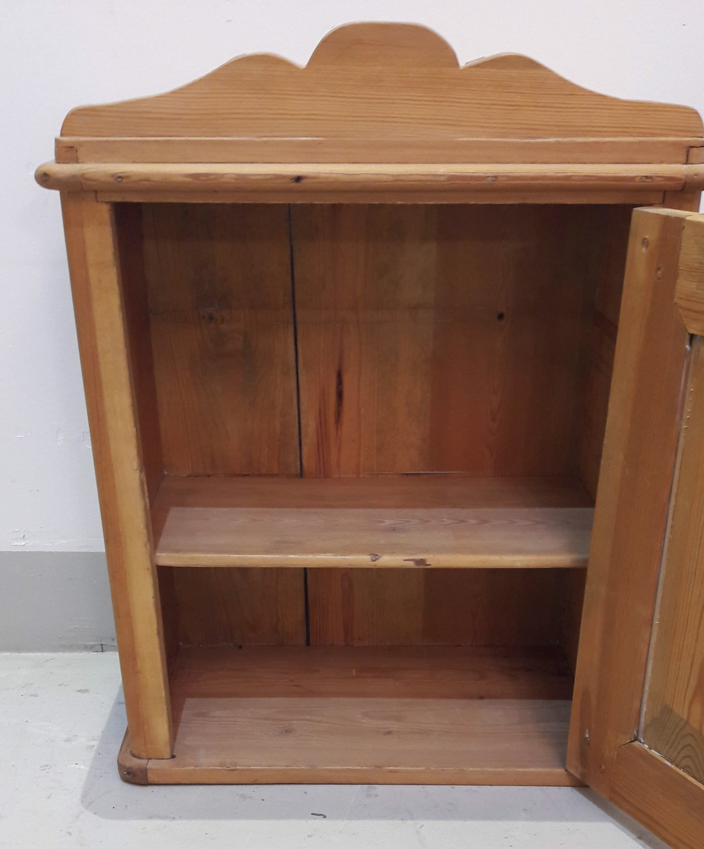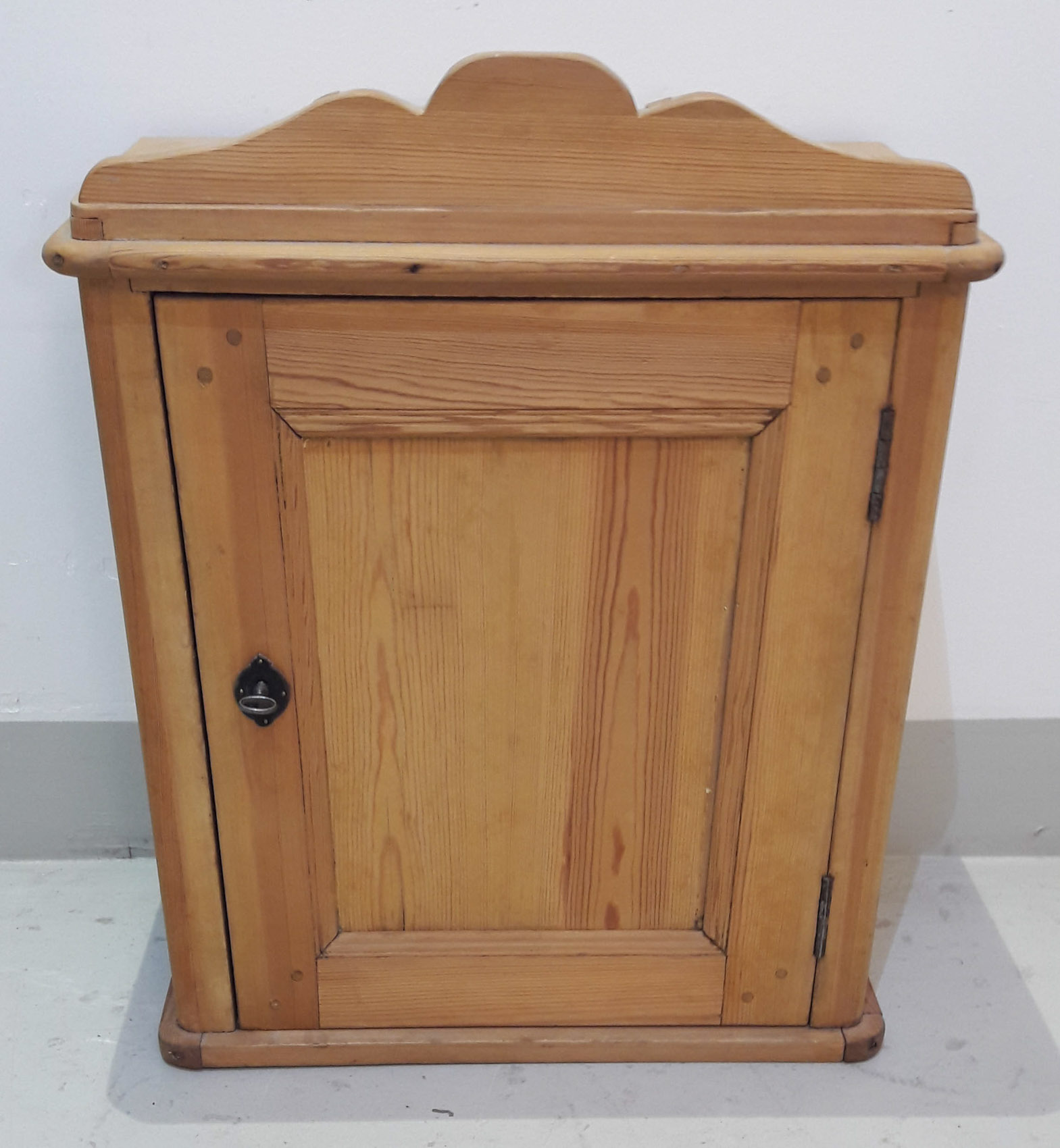 Puupuhdas 1800 luvun seinäkaappi, lukollinen ovi sisällä hylly, siisti.