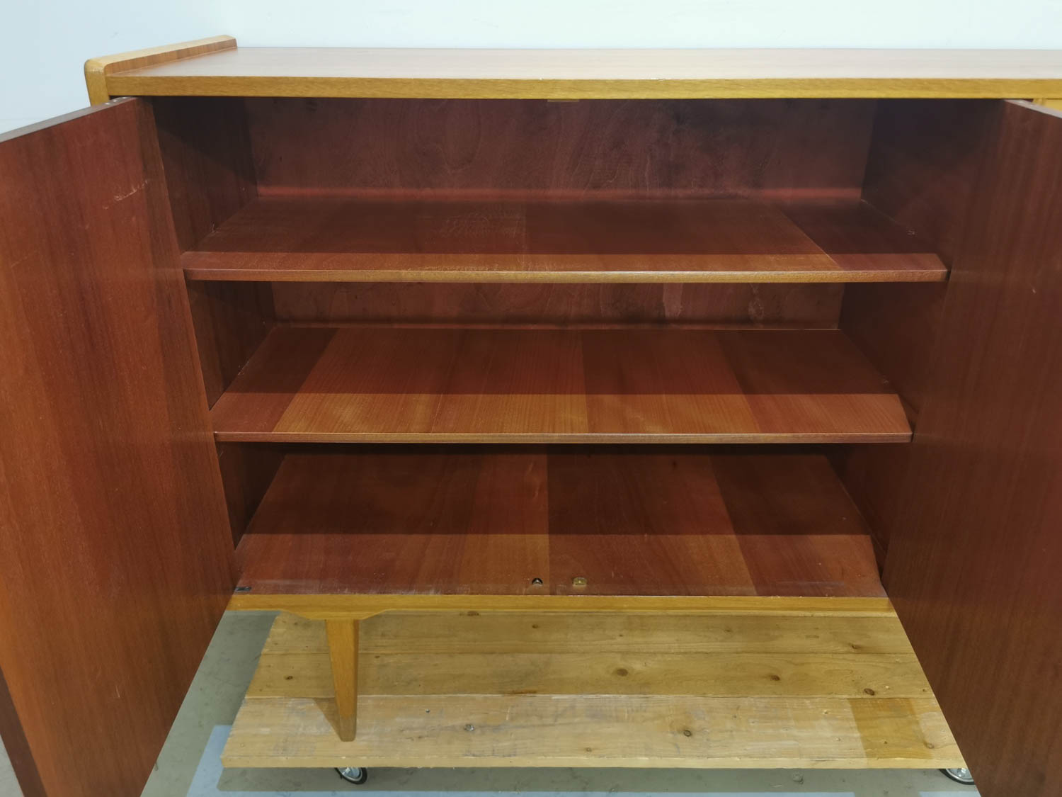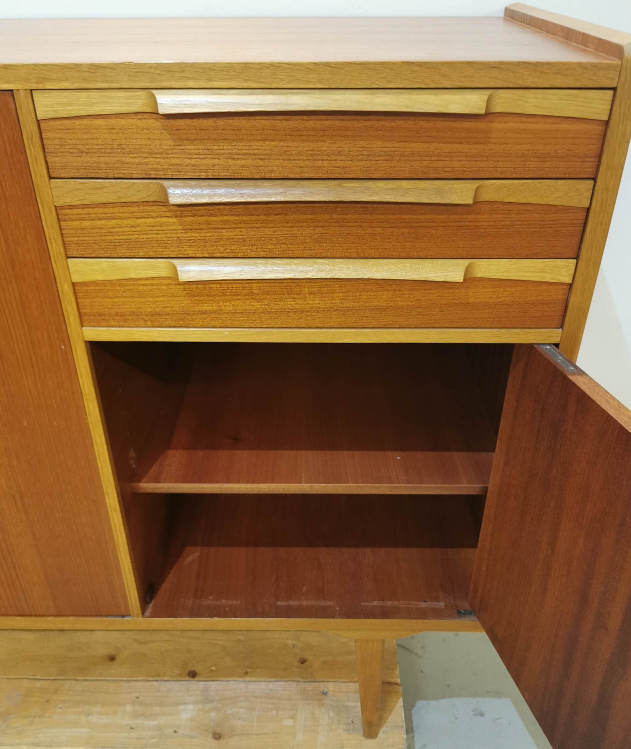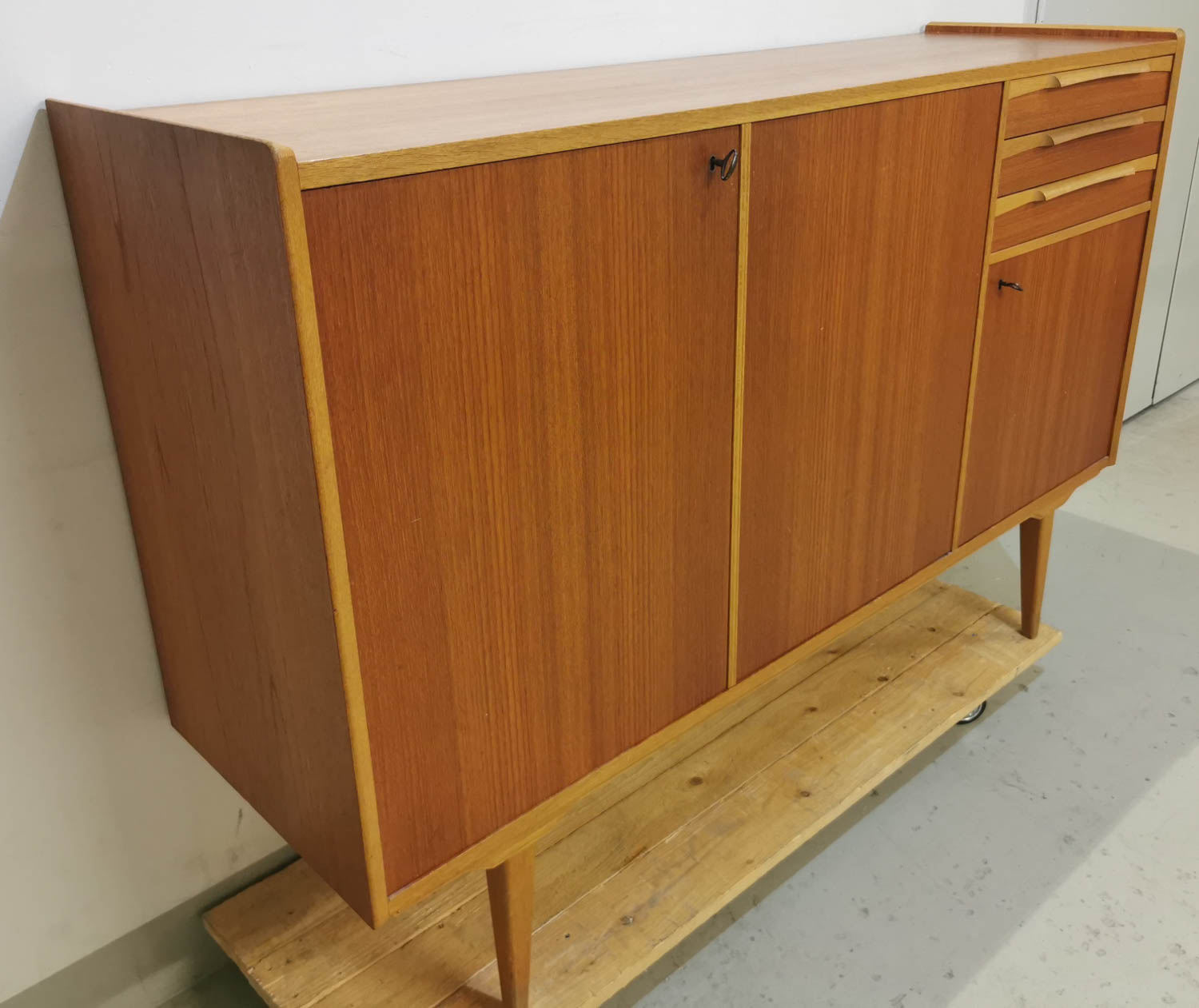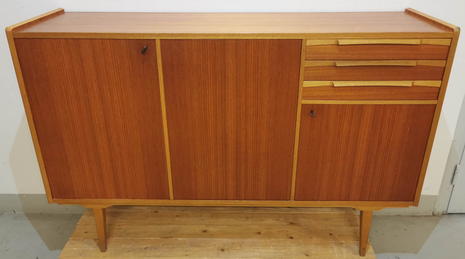 Astia tai liinavaatekaappi, teak, 1950-60 -luvulta, hajuton, puhdas, siisti ja hyväkuntoinen, laatikoita 3 kpl, lukolliset kaapit, 153 x 45 cm korkeus 102 cm