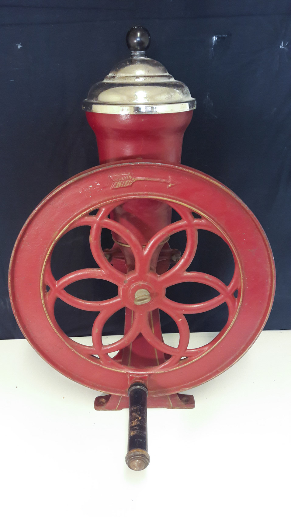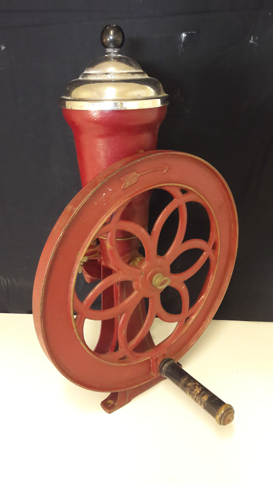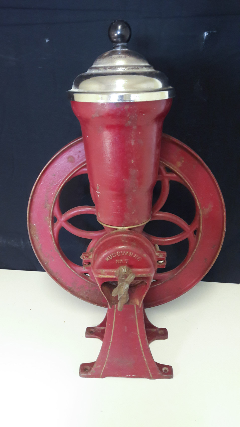Valurautainen kahvimylly, 1900 luvun alku, Korkeus 65cm Halkaisija 42cm, väri punainen, puinen kahva, Huskvarna no 7