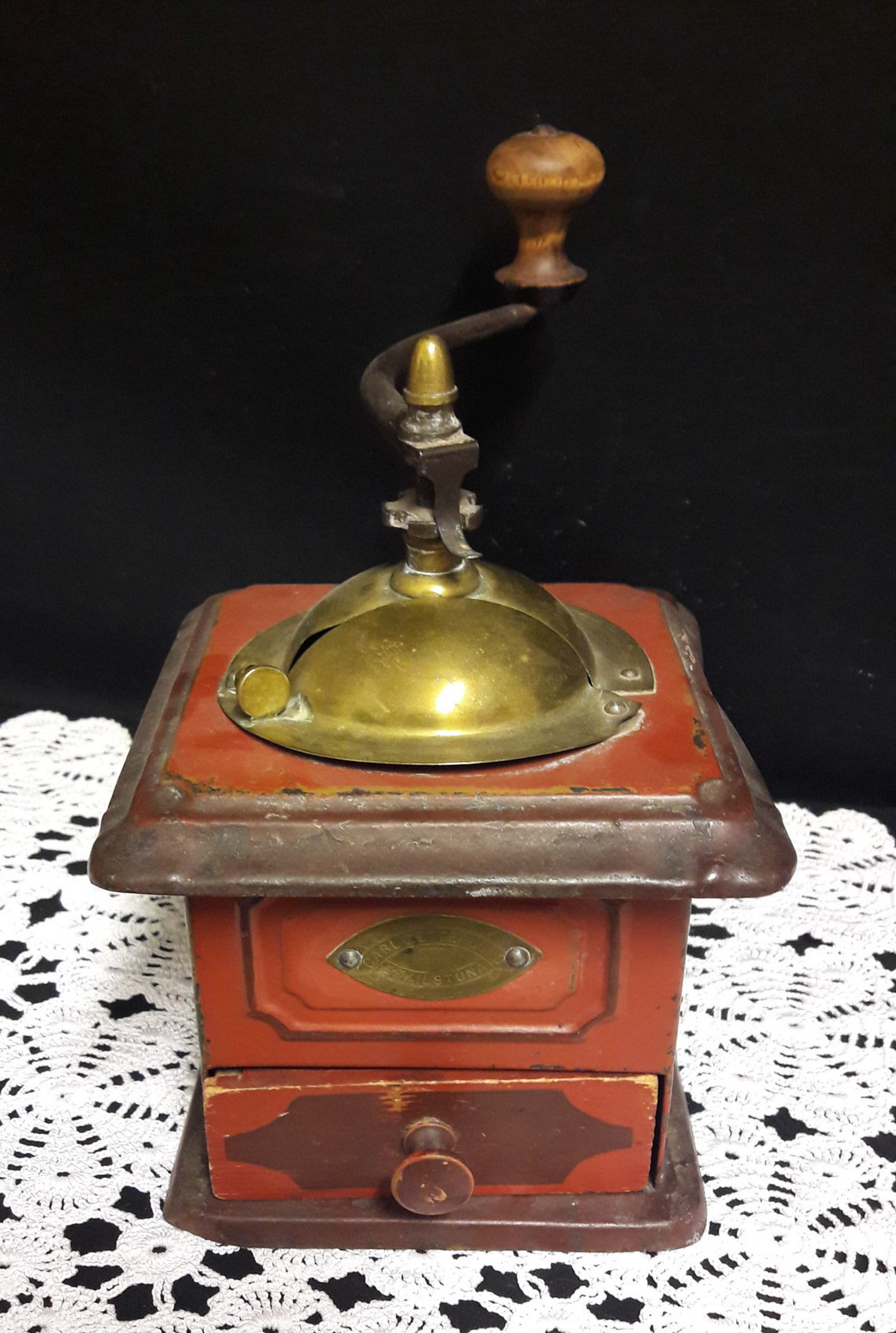 Pienempi peltinen kahvimylly, 1900 luvun ensimmäiseltä puolelta, Carl Zetterlund Eskilstuna, 14×14 korkeus kahvaan 22cm, täyttöaukon sisäosa posliinia.