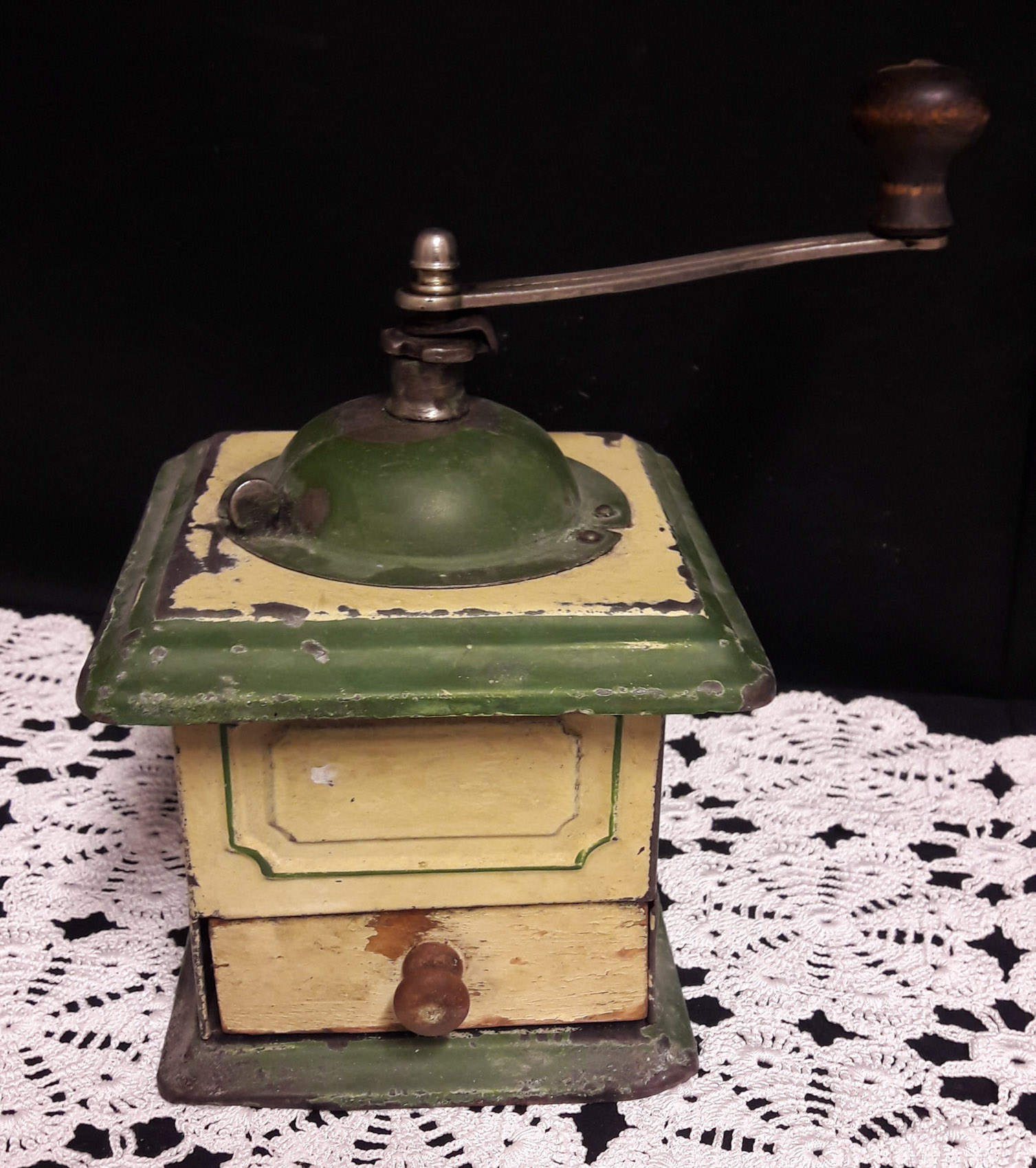 Pääosin peltinen kahvimylly, noin 1940 luvulta, 13x13cm korkeus 21cm.