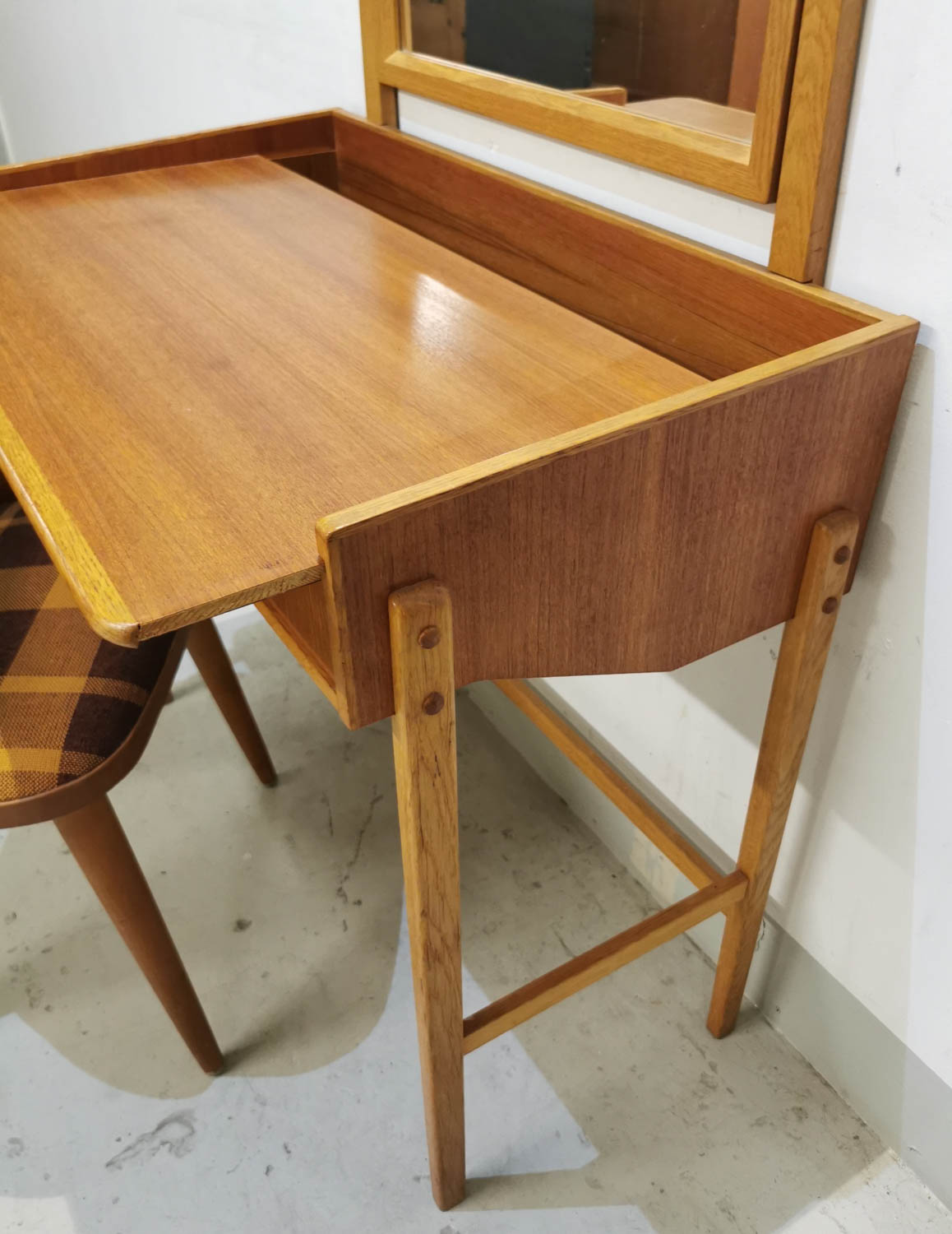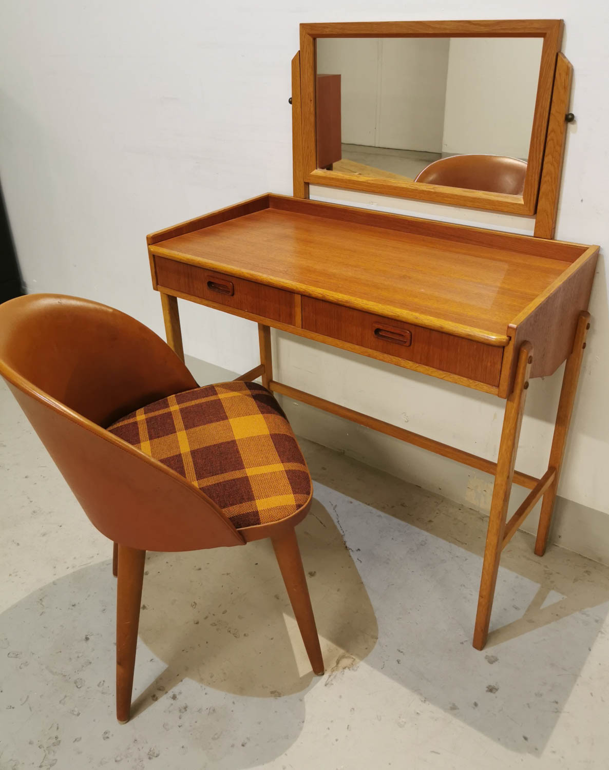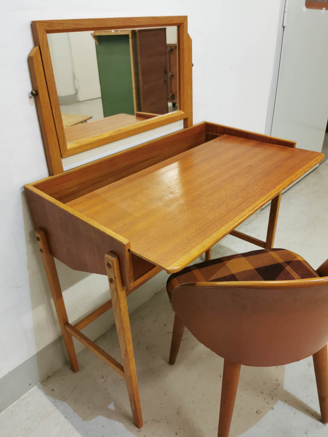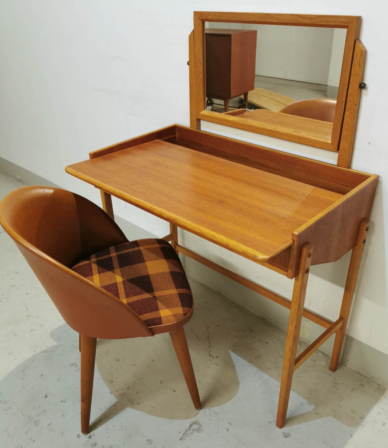 Kampauspöytä teak, kääntyvällä peilillä, 1950-60 -luvulta, ulosvedettävää työtaso, laatikoita 2 kpl, 82 x 41cm korkeus 68/110cm, tuoli myydään erikseen, katso osio tuolit