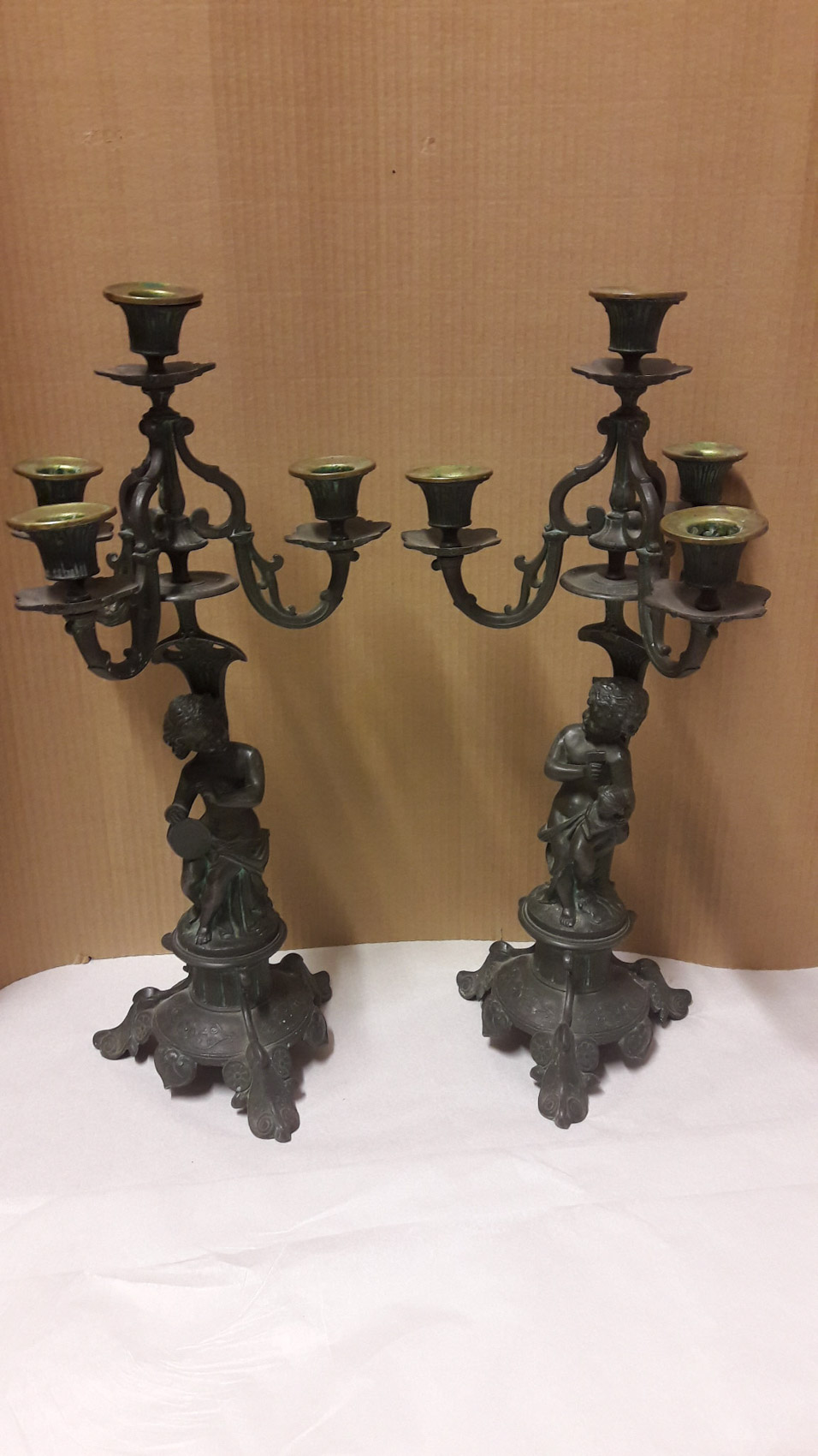Kandelaaperit 3 haaraiset 1800 luvun lopulta, patinoitunut metallia, lapsihahmo kummassakin. Hinta per pari.