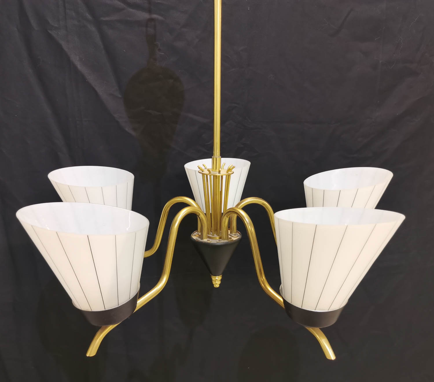 Kattovalaisin, 5 haarainen, lasikuvut mustat raidat, messinkinen runko, musta alaosa, noin 1950-luvulta, Halkaisija 53cm, Korkeus 70cm