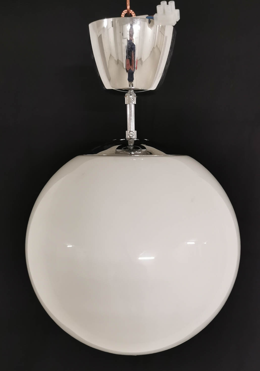 Kattovalaisin, valkoinen lasi, ripustin ja sähköt uusittu, korkeus noin 35cm, halkaisija noin 25cm.