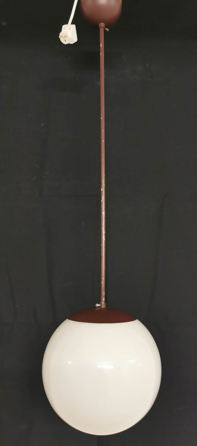 Kattovalaisin, valkoinen lasipallo, teräsrunko ruskea, ajanmukaista kulumaa rungossa, korkeus noin 100cm, halkaisija noin 24cm.