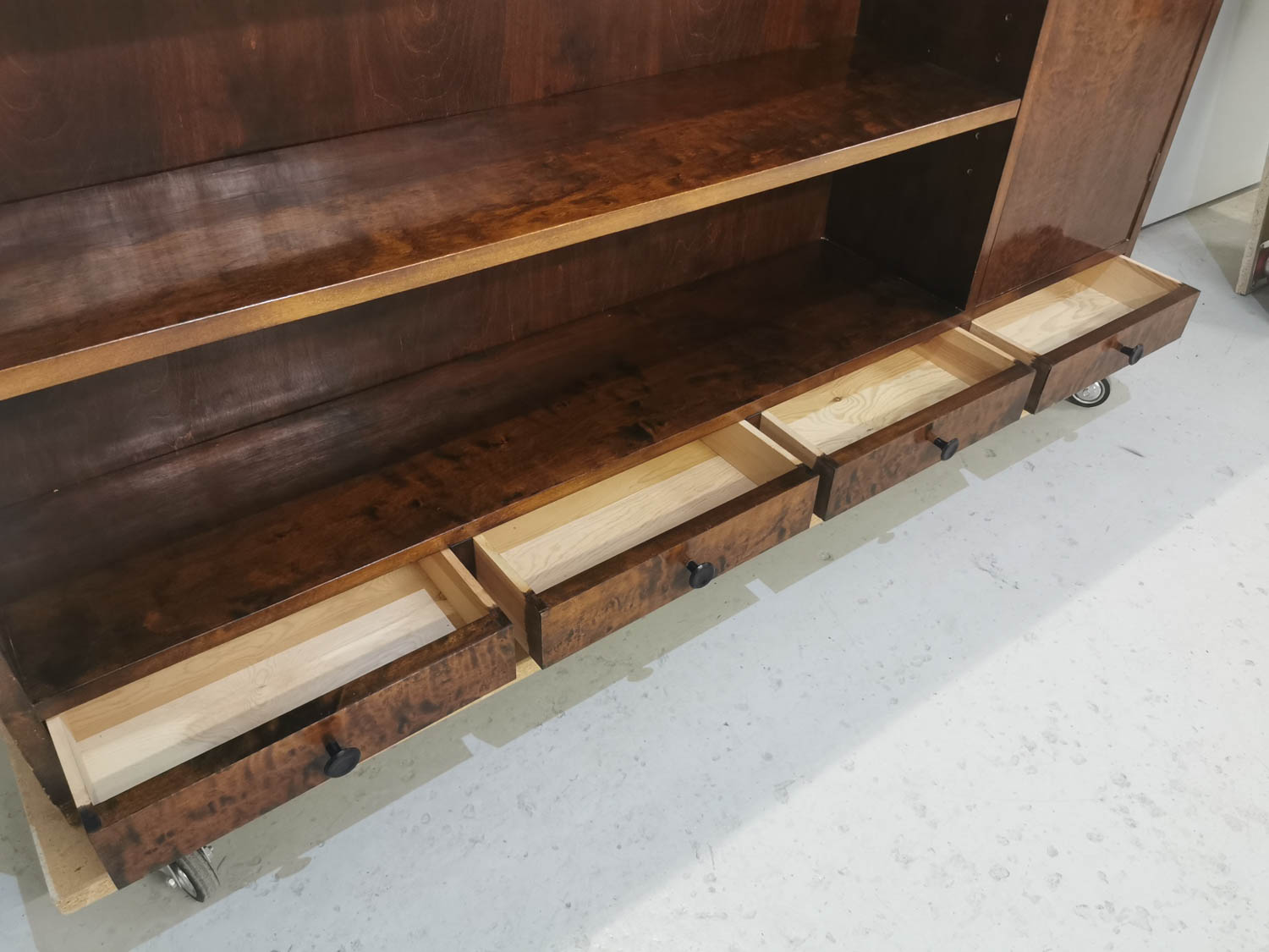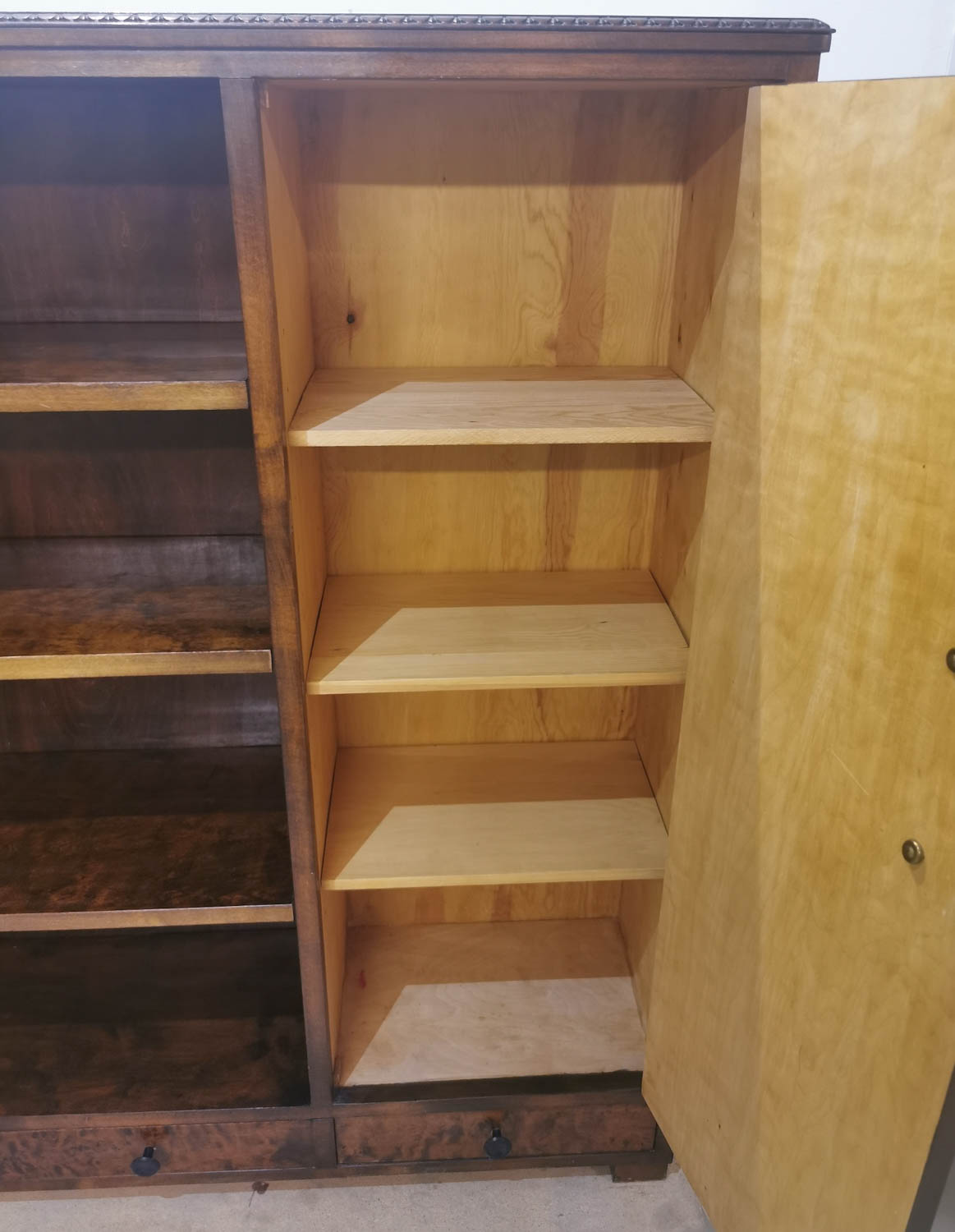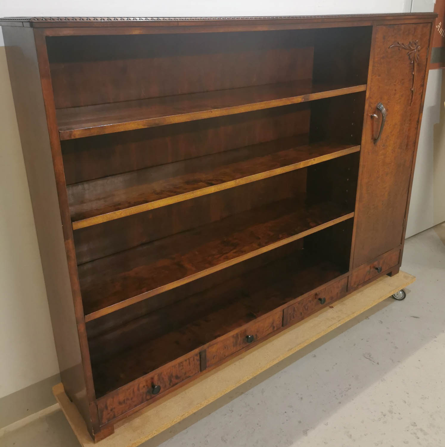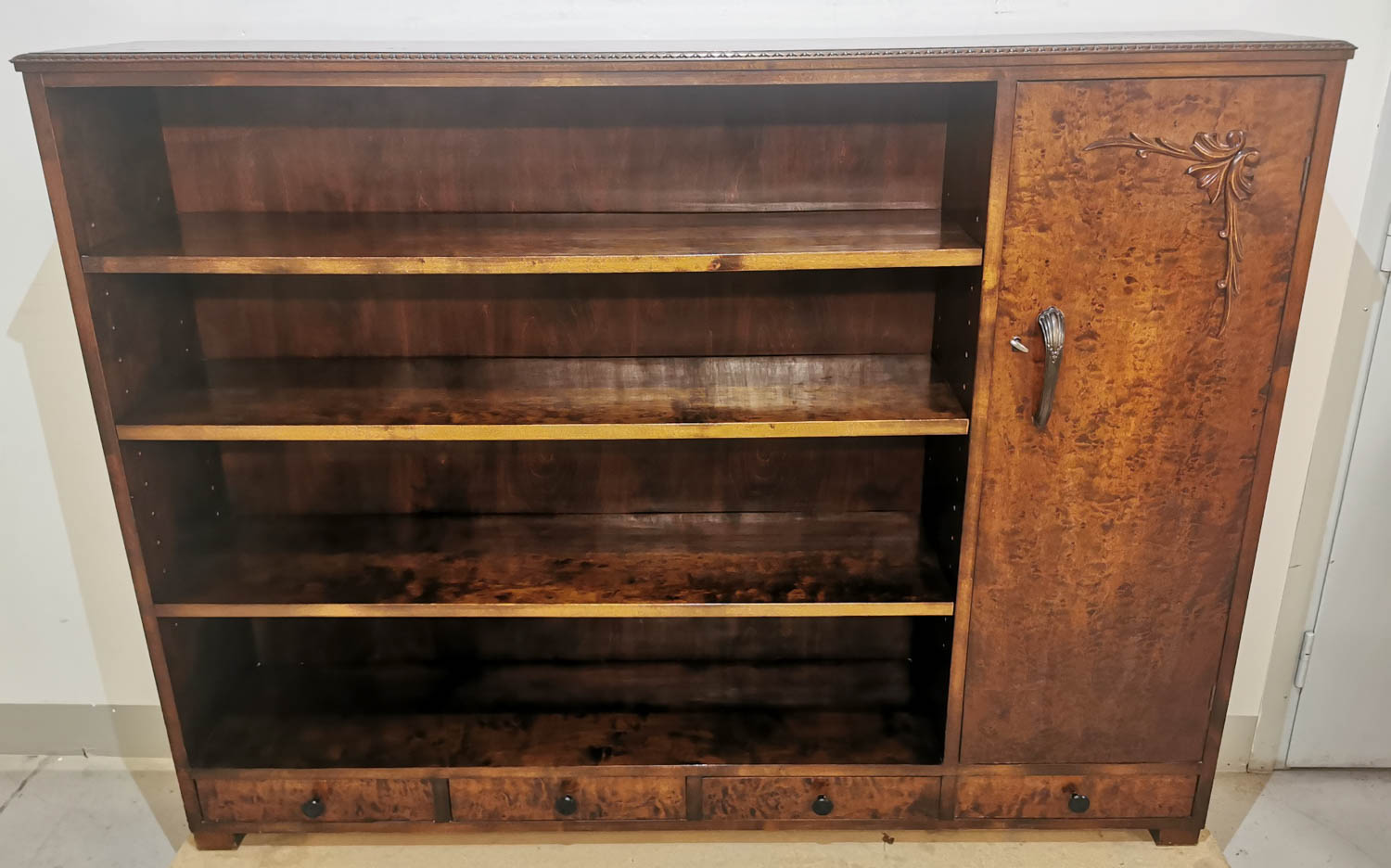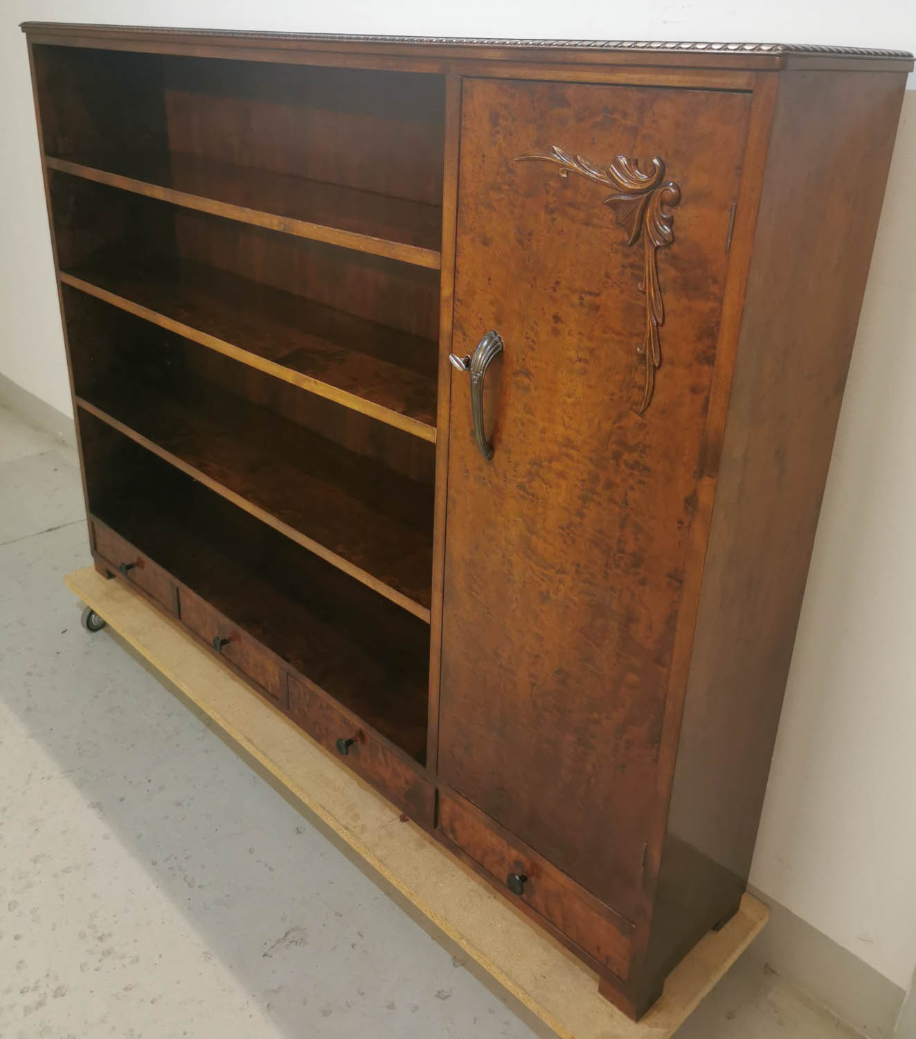 Koivuinen kirjahylly lukolisella sivukaapilla, ja neljällä laatikolla, noin 1930-luvulta, vähäistä ajanmukaista kulumaa, 171x30cm korkeus 129cm