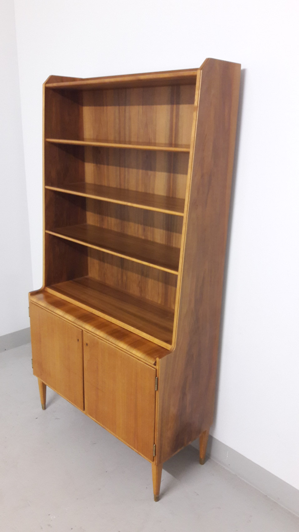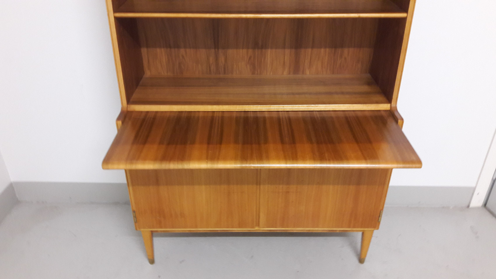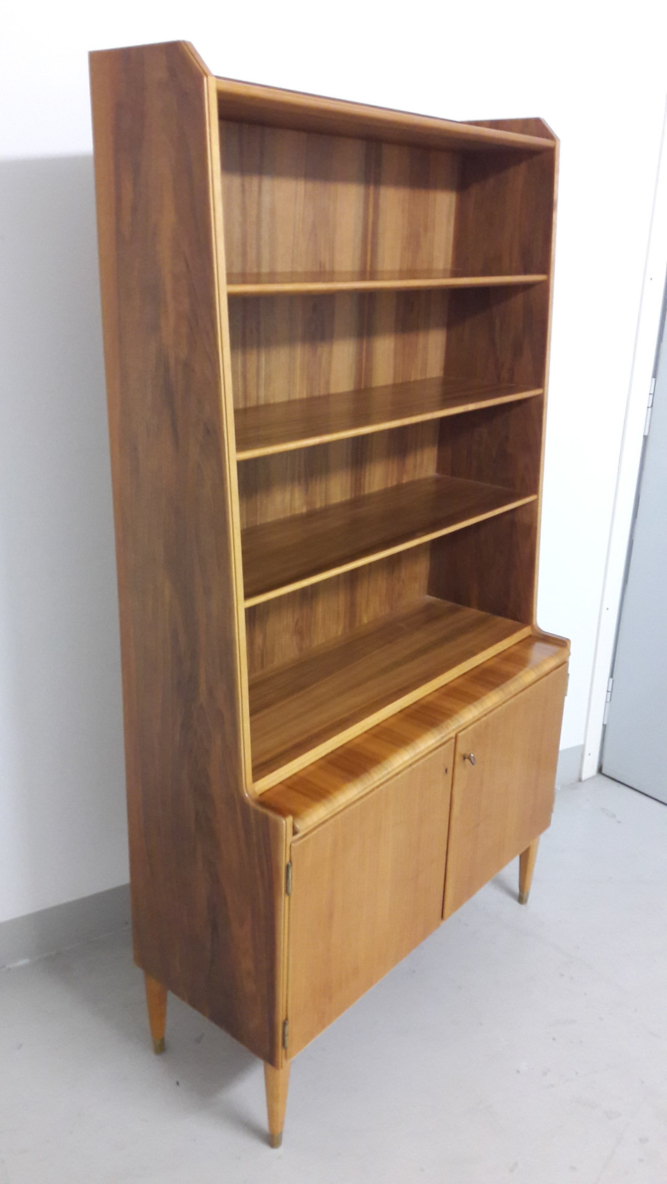Pähkinäpuinen kirjahylly, 1950-60 luvun vaihde, lukollinen kaappi, vasemmalla 2 laatikkoa, oikealla hylly, ulosvedettävä työtaso, säädettävät hyllyt