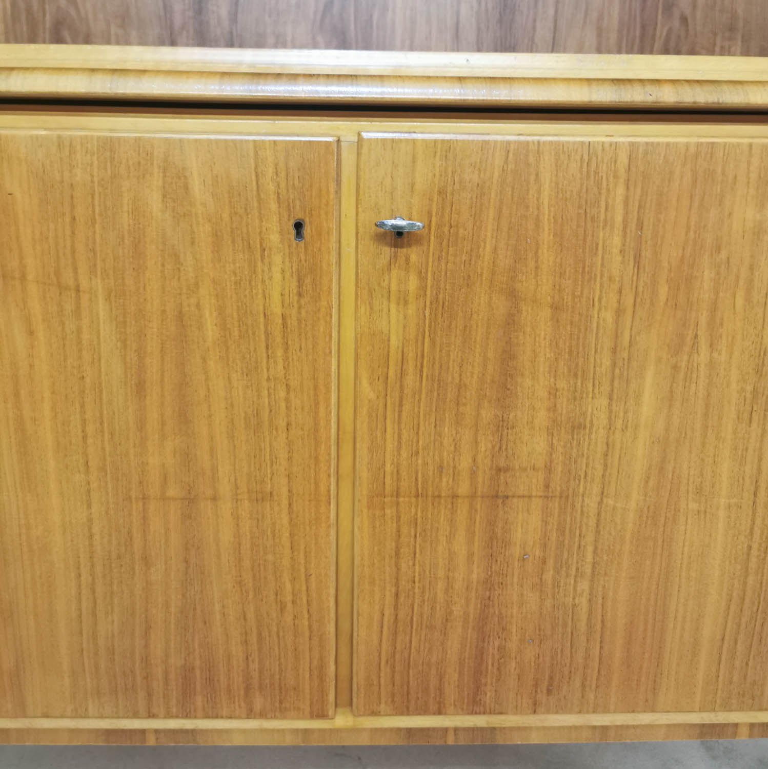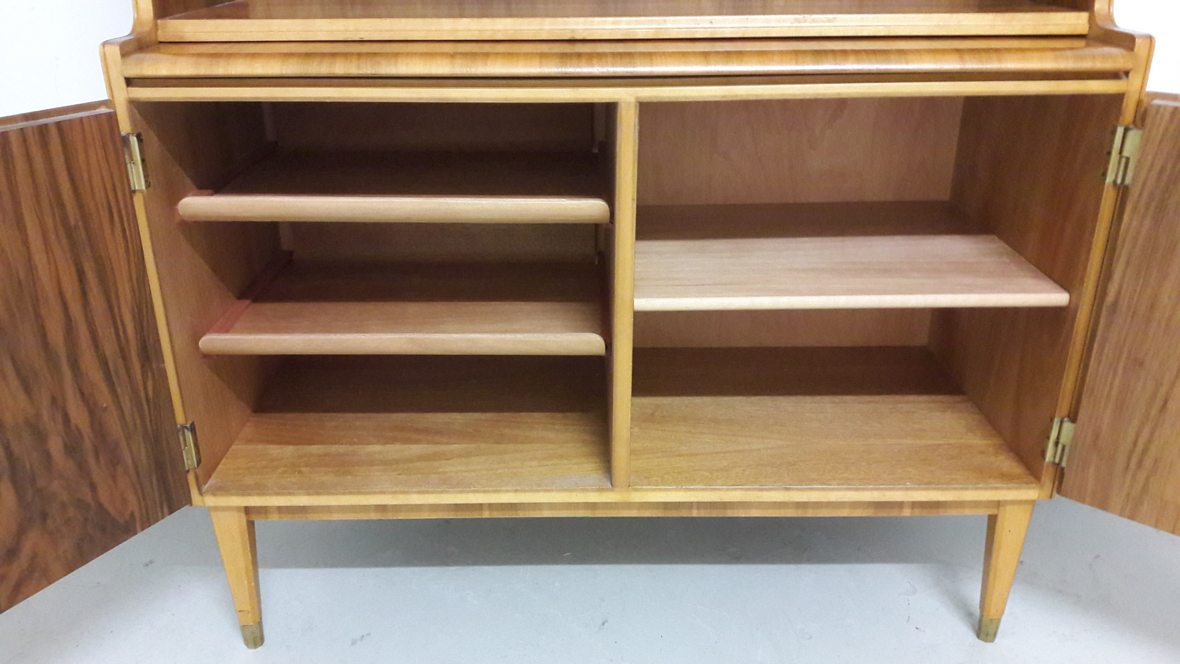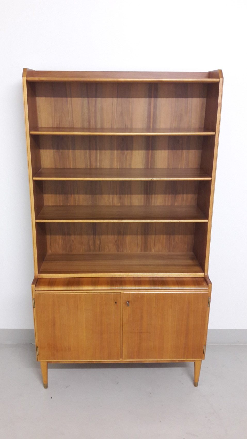 Pähkinäpuinen kirjahylly, 1950-60 luvun vaihde, lukollinen kaappi, vasemmalla 2 laatikkoa, oikealla hylly, ulosvedettävä työtaso, säädettävät hyllyt