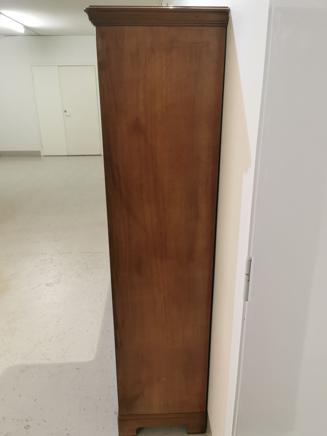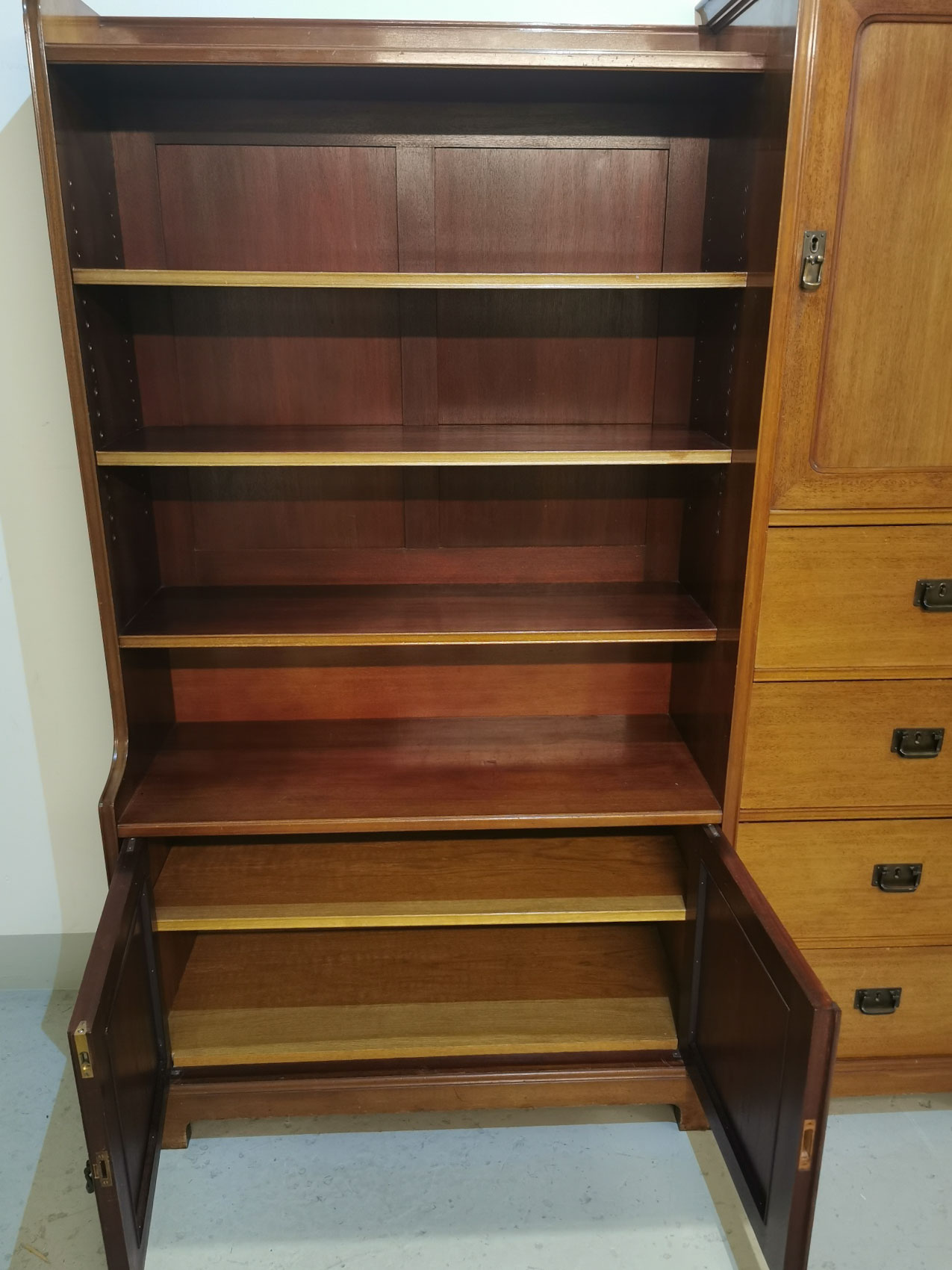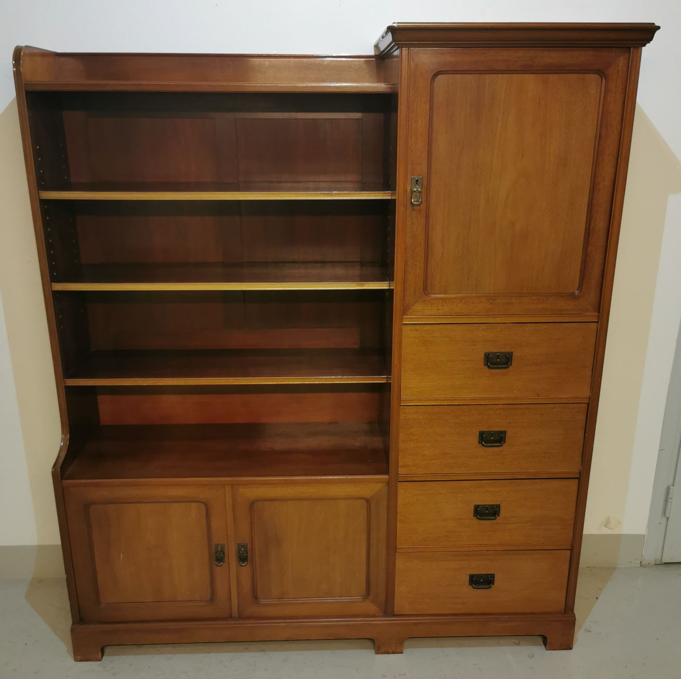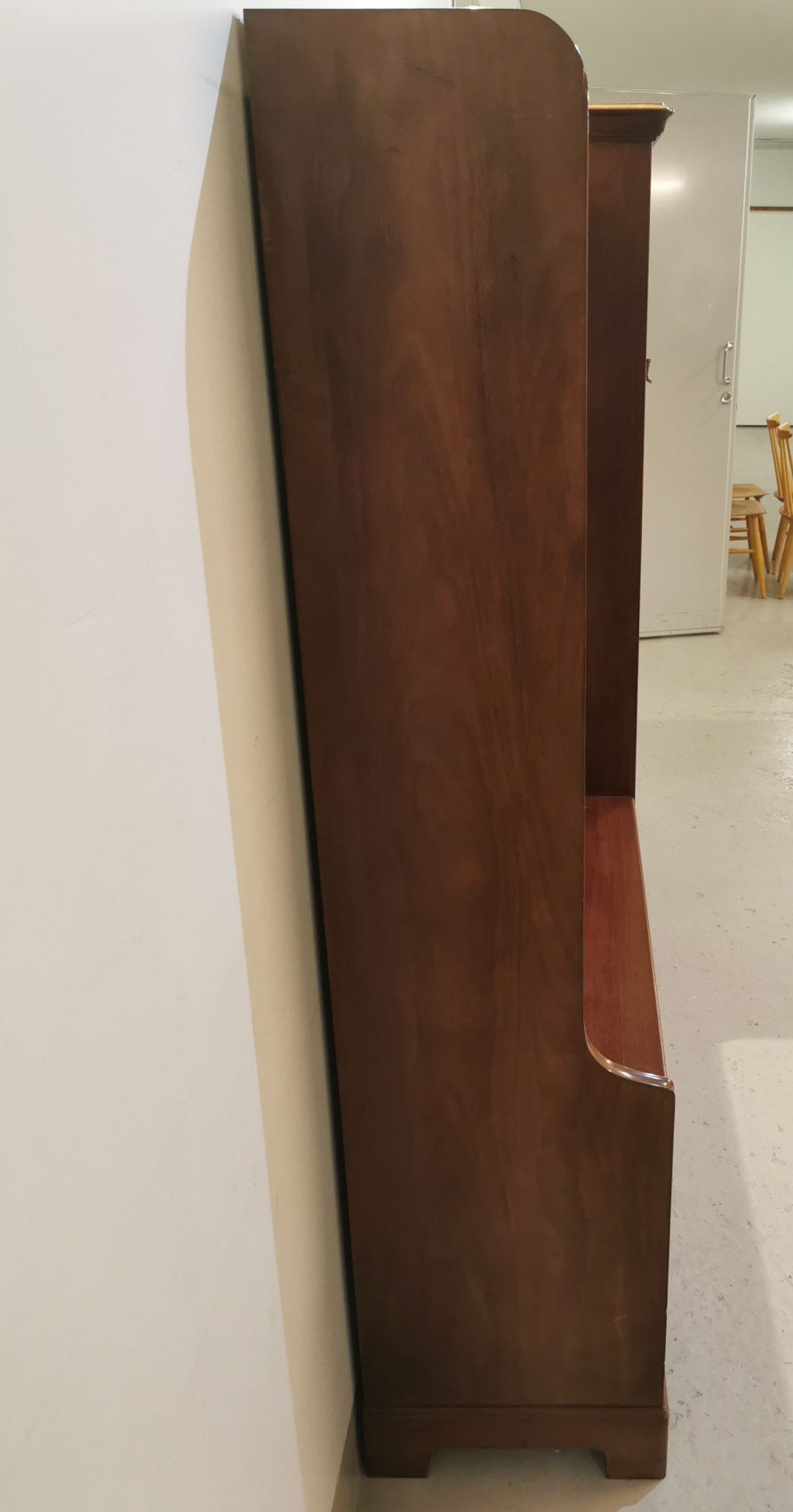 Mahonkinen kirjahylly, 2 kaappia, 4 laatikkoa, noin 1920-luvulta, siisti ja hyväkuntoinen tilava kaappi, 152 x 42cm korkeus 176cm