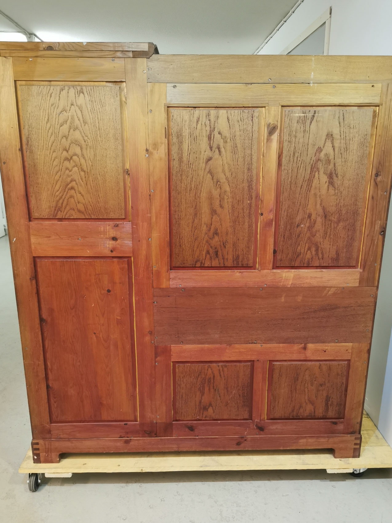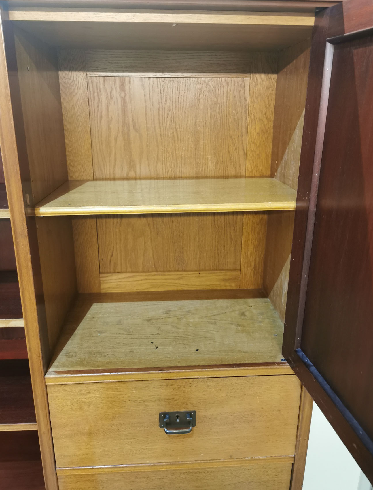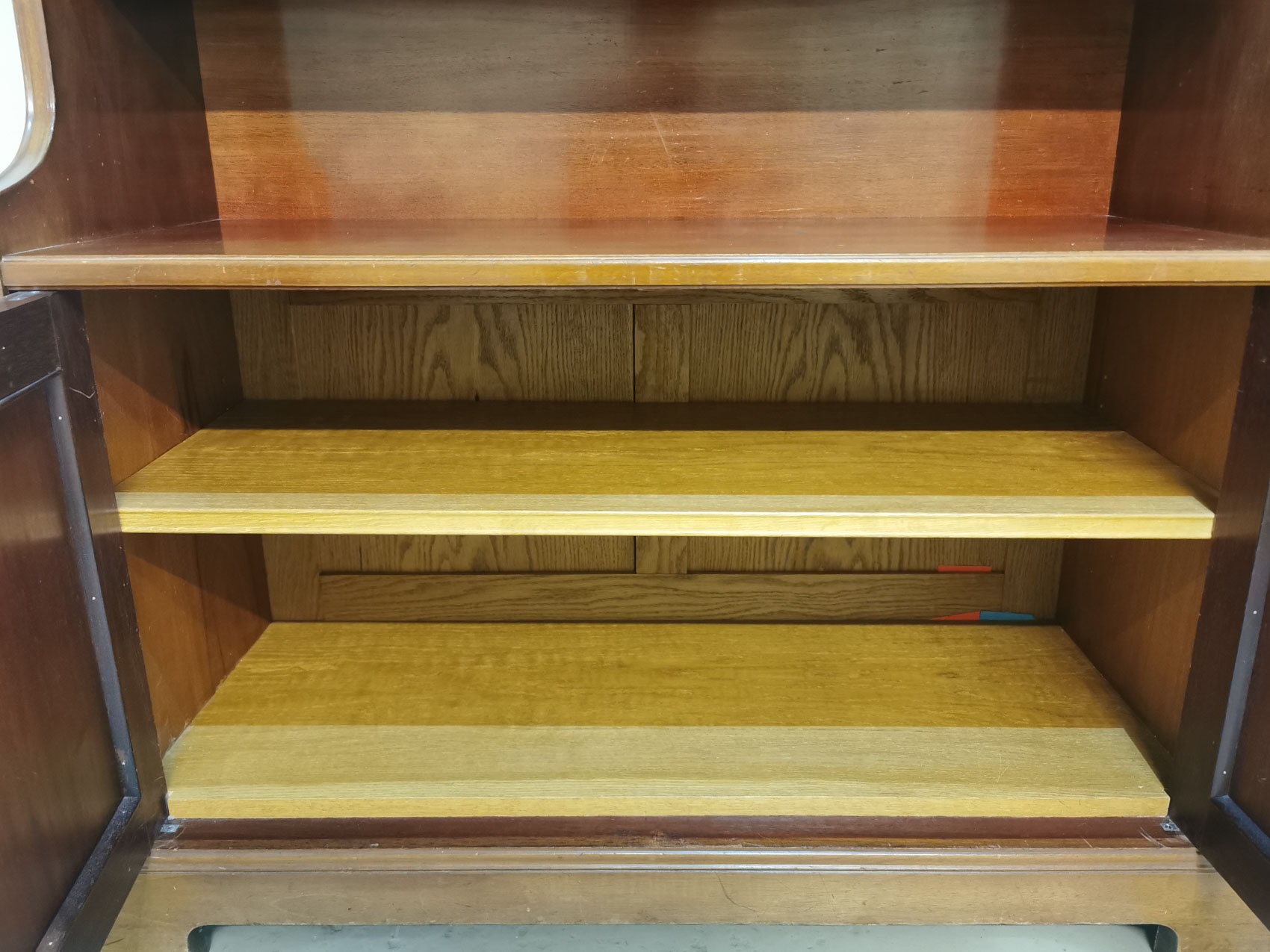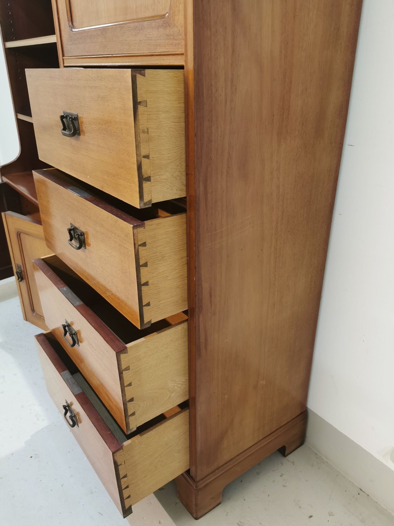 Mahonkinen kirjahylly, 2 kaappia, 4 laatikkoa, noin 1920-luvulta, siisti ja hyväkuntoinen tilava kaappi, 152 x 42cm korkeus 176cm