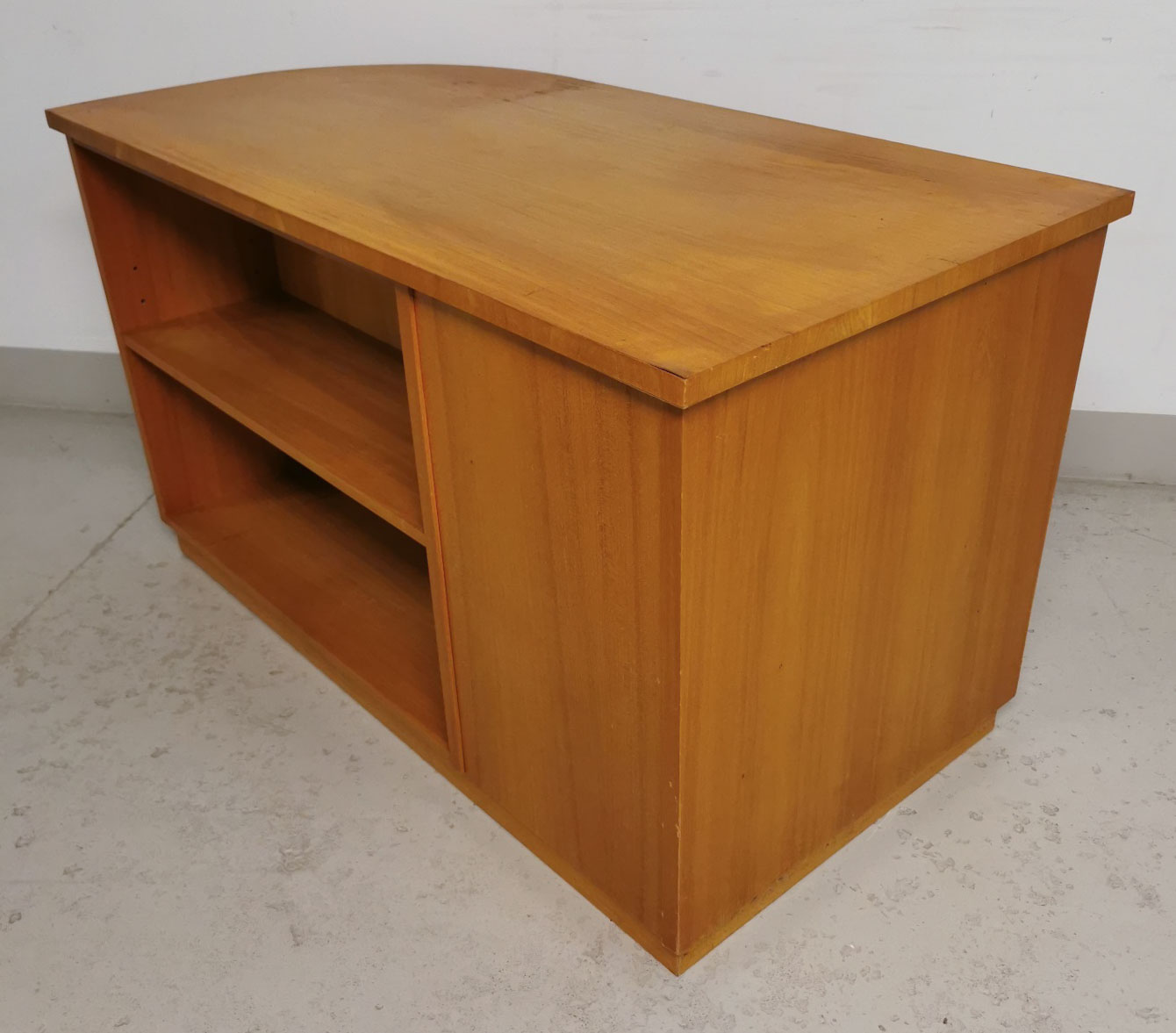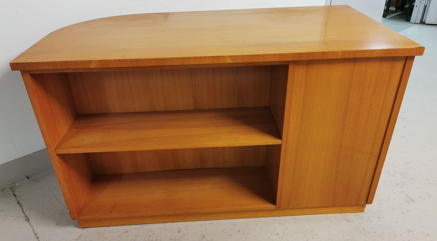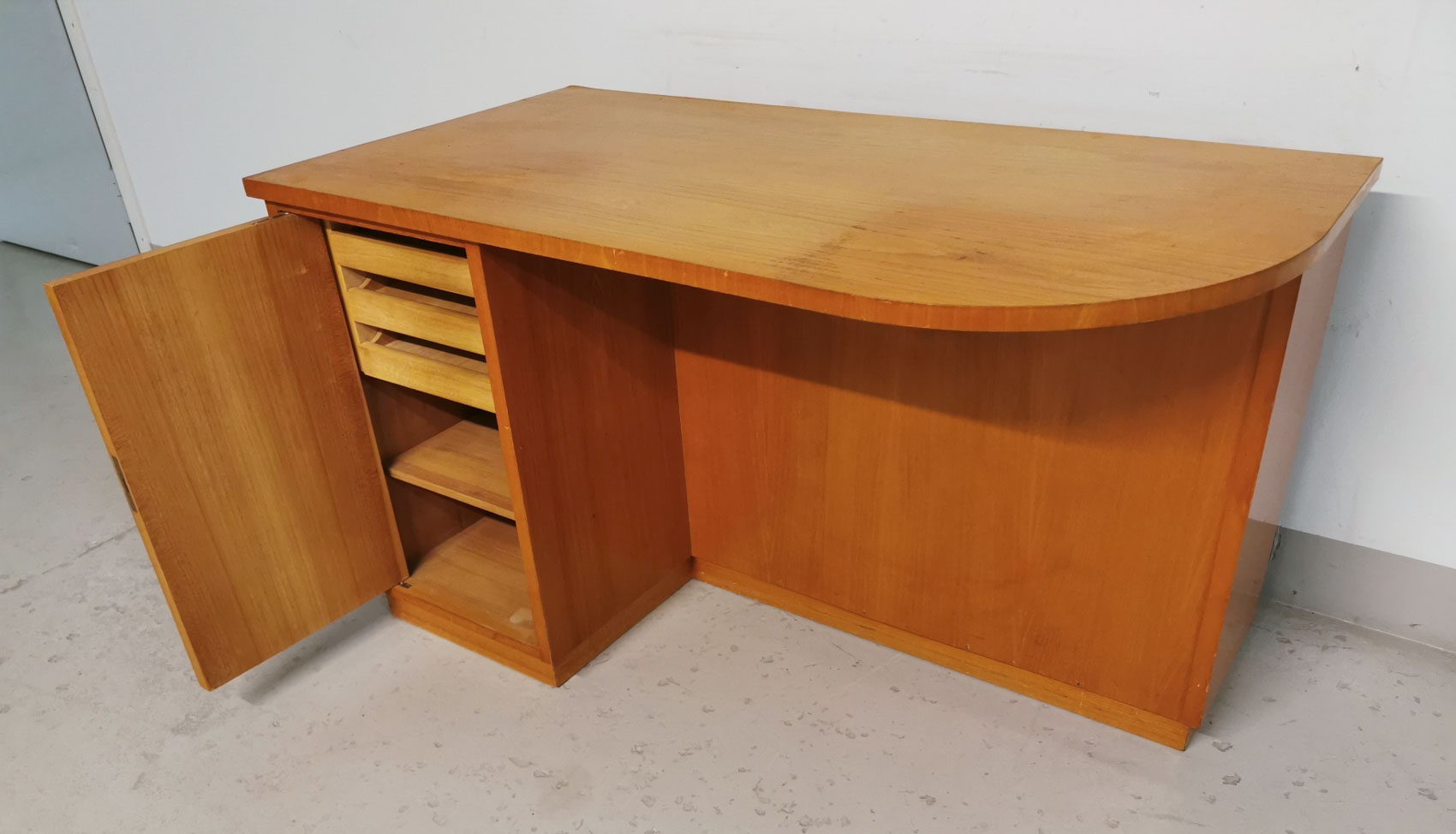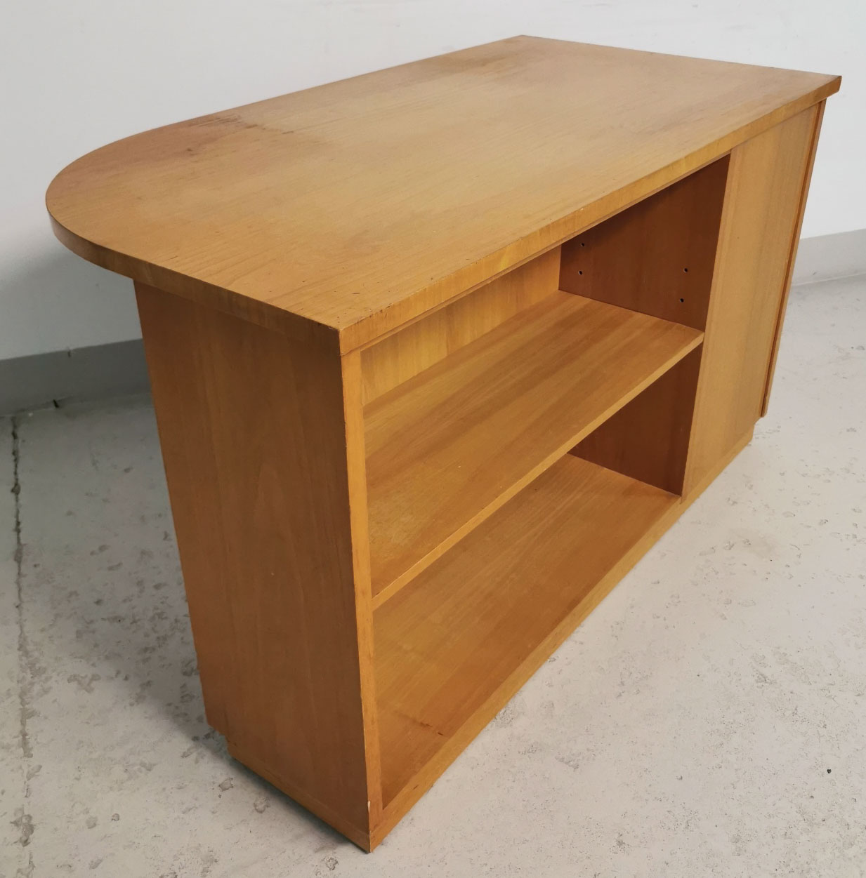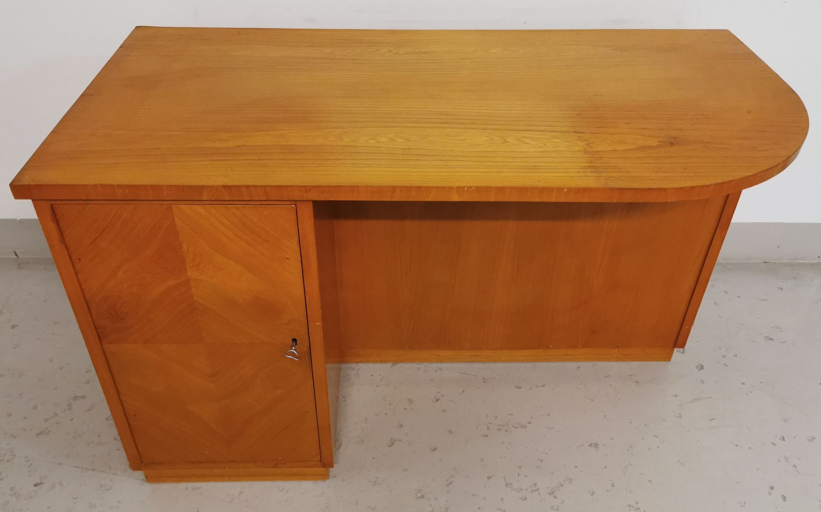 Kirjoituspöytä noin 1950 luvulta, takana kirjahylly, edessä lukollinen kaappi.