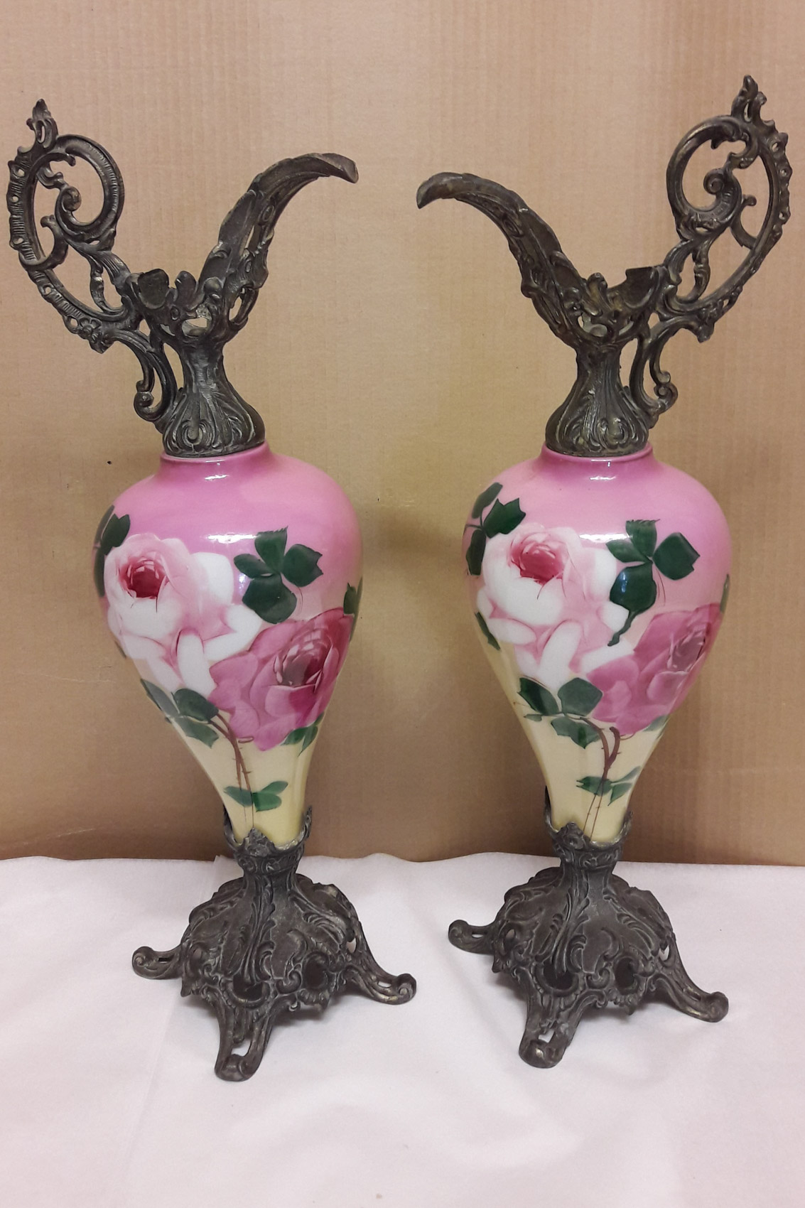 Näyttävät ruusuaiheiset koriste kannut-uurnat, posliini, metalli