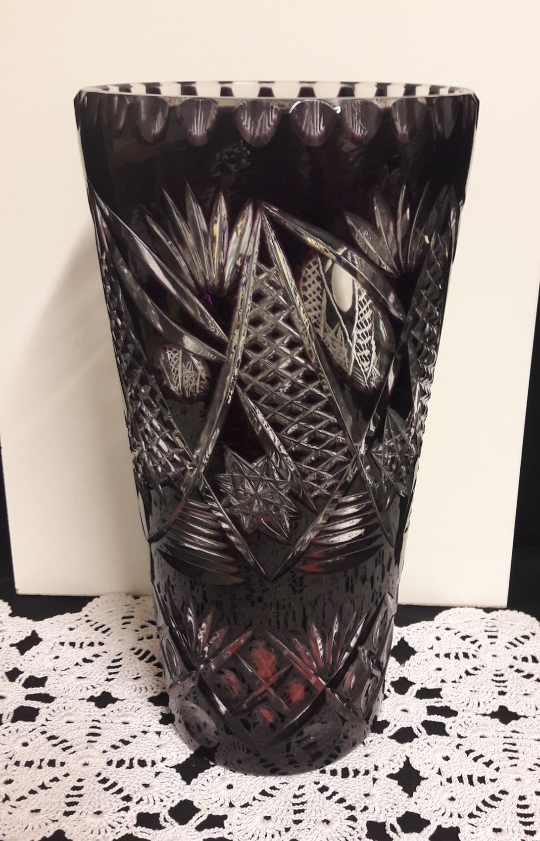 Iso laadukas tummanpunainen kristallimaljakko, syvät upeat hionnat maljakossa.