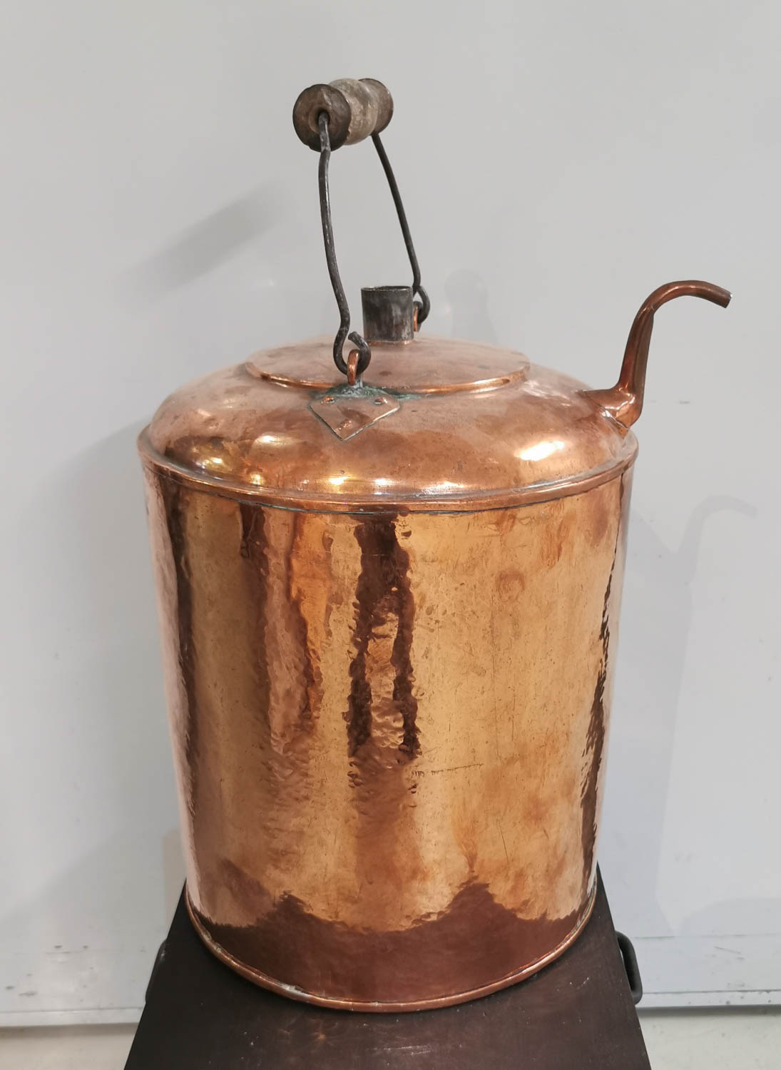 Kupariastia, kaatonokalla, pieni täyttöaukko keskellä, esim letkulle, 1800-luvulta, halkaisija 28cm korkeus 35cm
