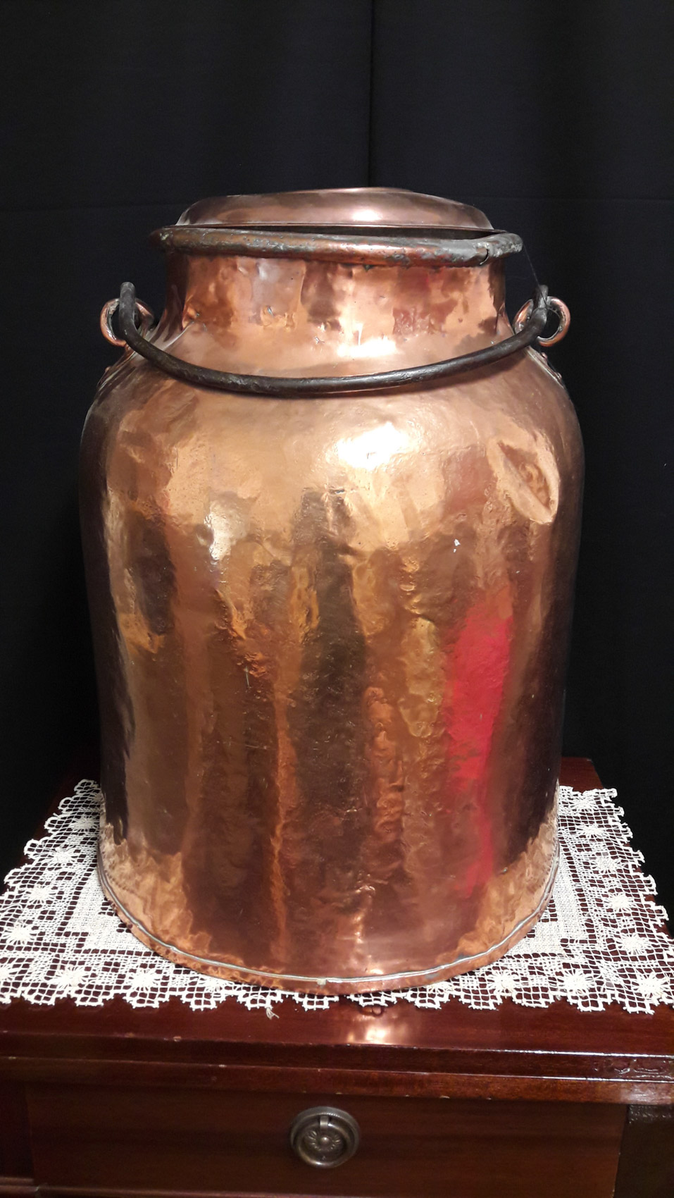 Isonkokoinen kannellinen kupariastia, noin 1800 luvun puoliväli, korkeus 43cm halkaisija 33cm , tilavuus noin 30 litra