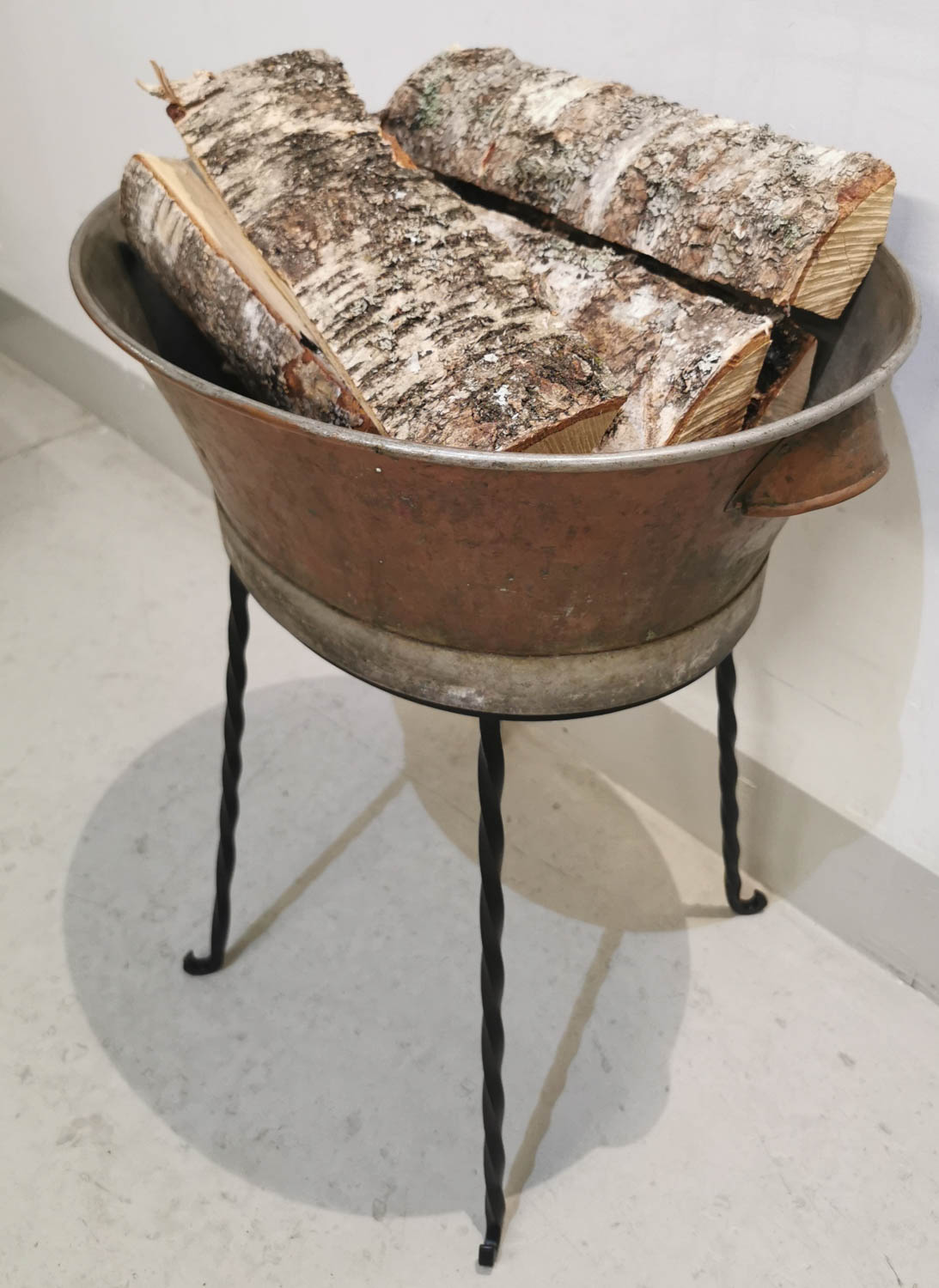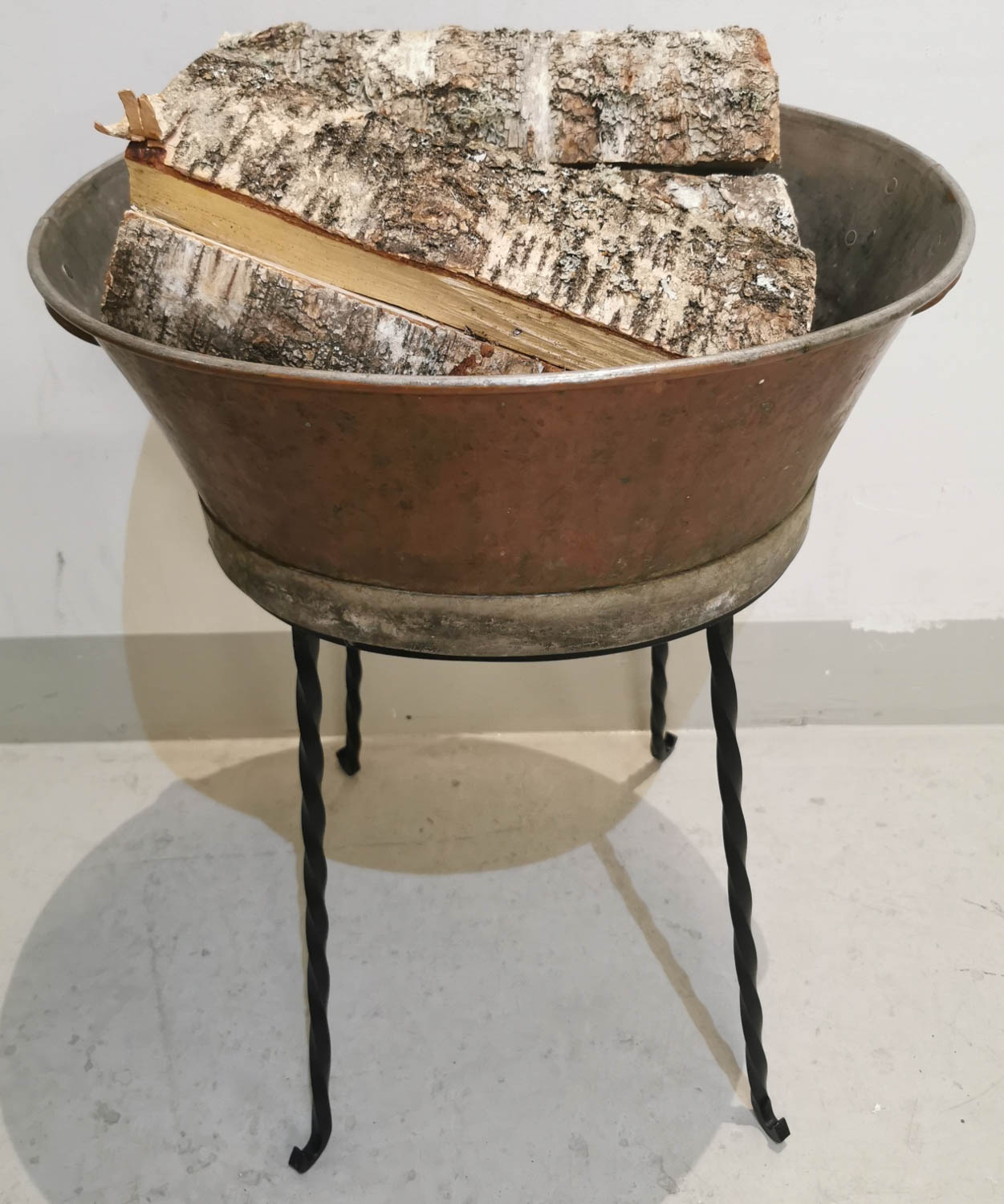 Kuparinen pesusoikko, 1800/1900 -luvun vaihde, sopii takkapuille, tai kukille, ym 44 x 37cm korkeus 60cm