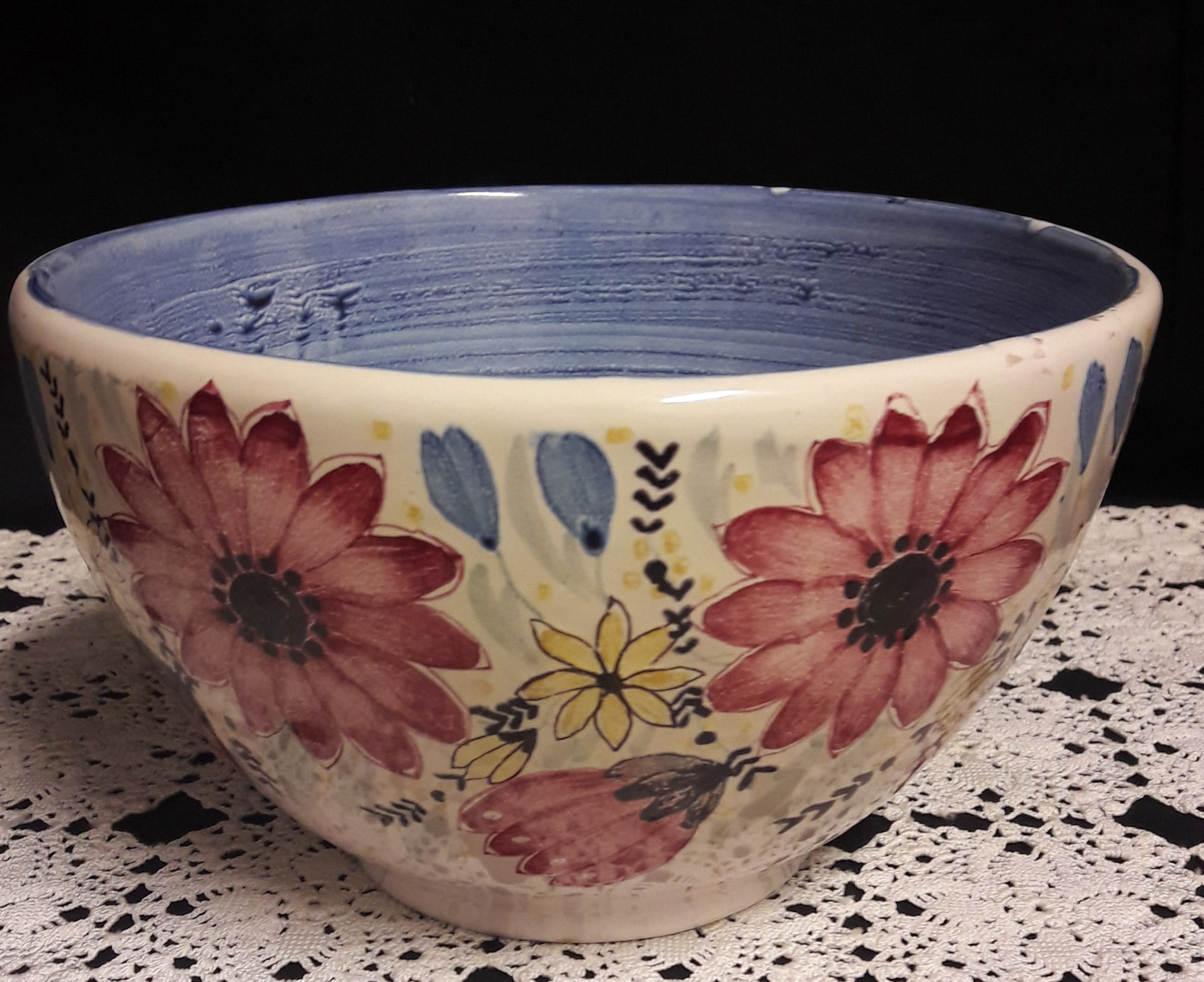 Kupittaan Savi, kulho, sisältä sininen, käsin maalattu kauniilla erivärisillä kukkasilla, korkeus 10cm halkaisija 17.5cm