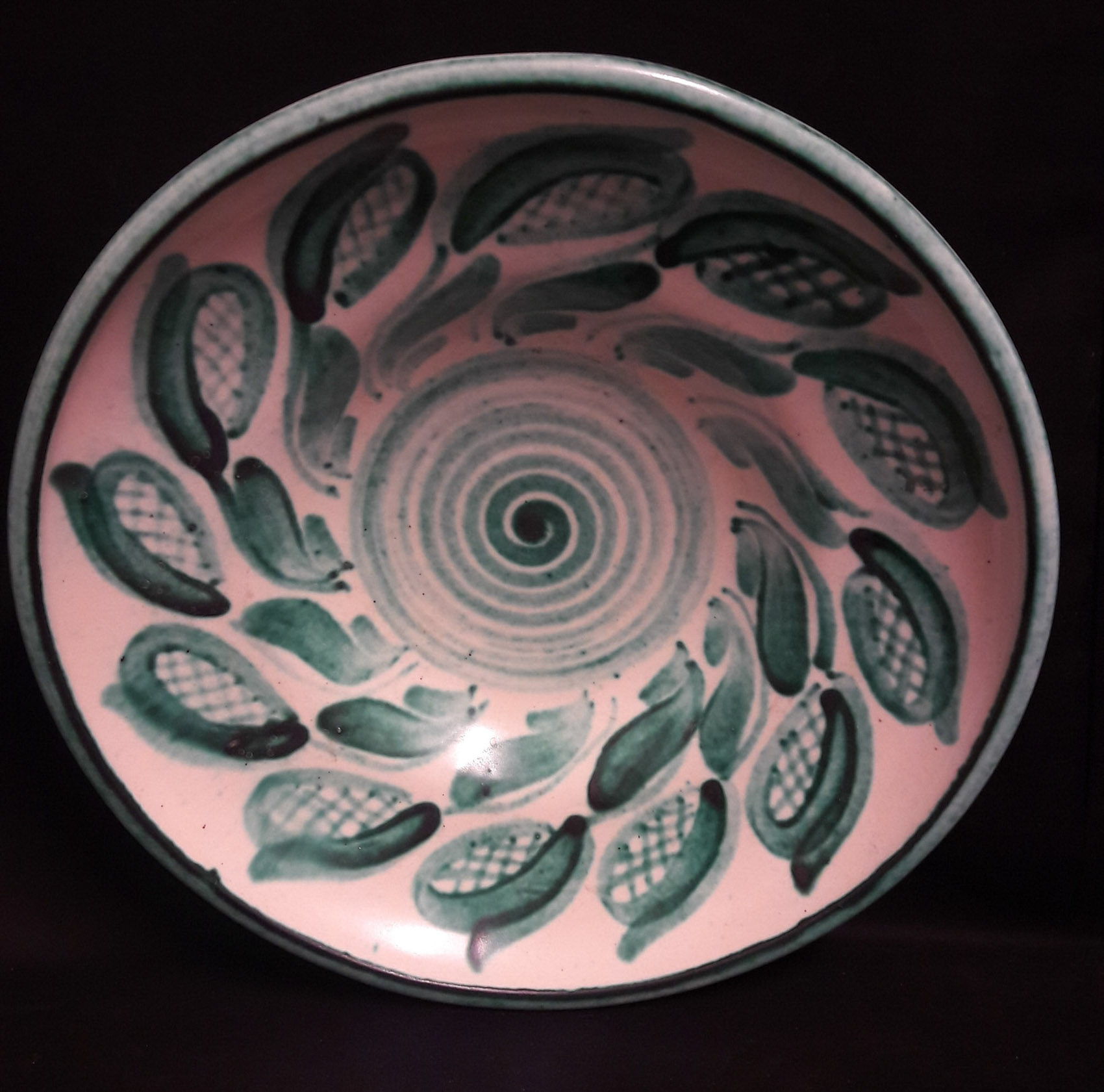 Kupittaan Savi, isompi, syvä lautanen-kulho, käsin maalattu, korkeus 7cm, halkaisija 27cm.