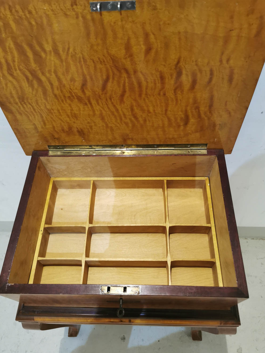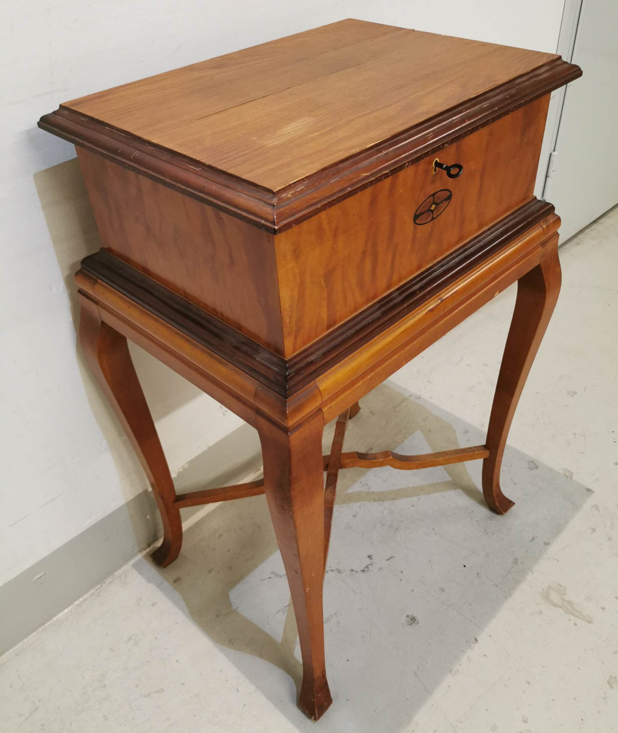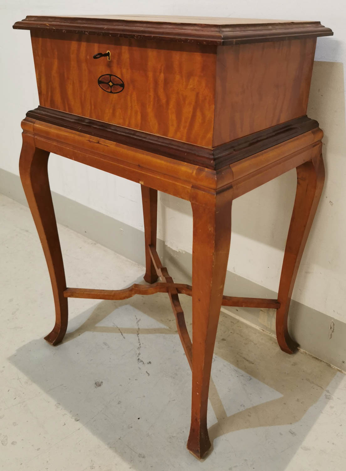 Jalallinen lukittava laatikosto, kauniilla intarsiakuviolla, 1930-40 -luvulta, 50 x 39cm. Korkeus 76cm