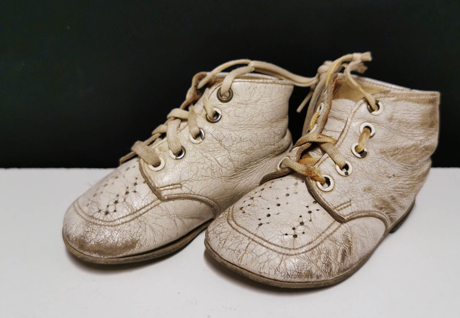 Valkoiset lasten kengät, 1900 luvun alkupuoli, koko ei tiedossa, pituus 12 cm