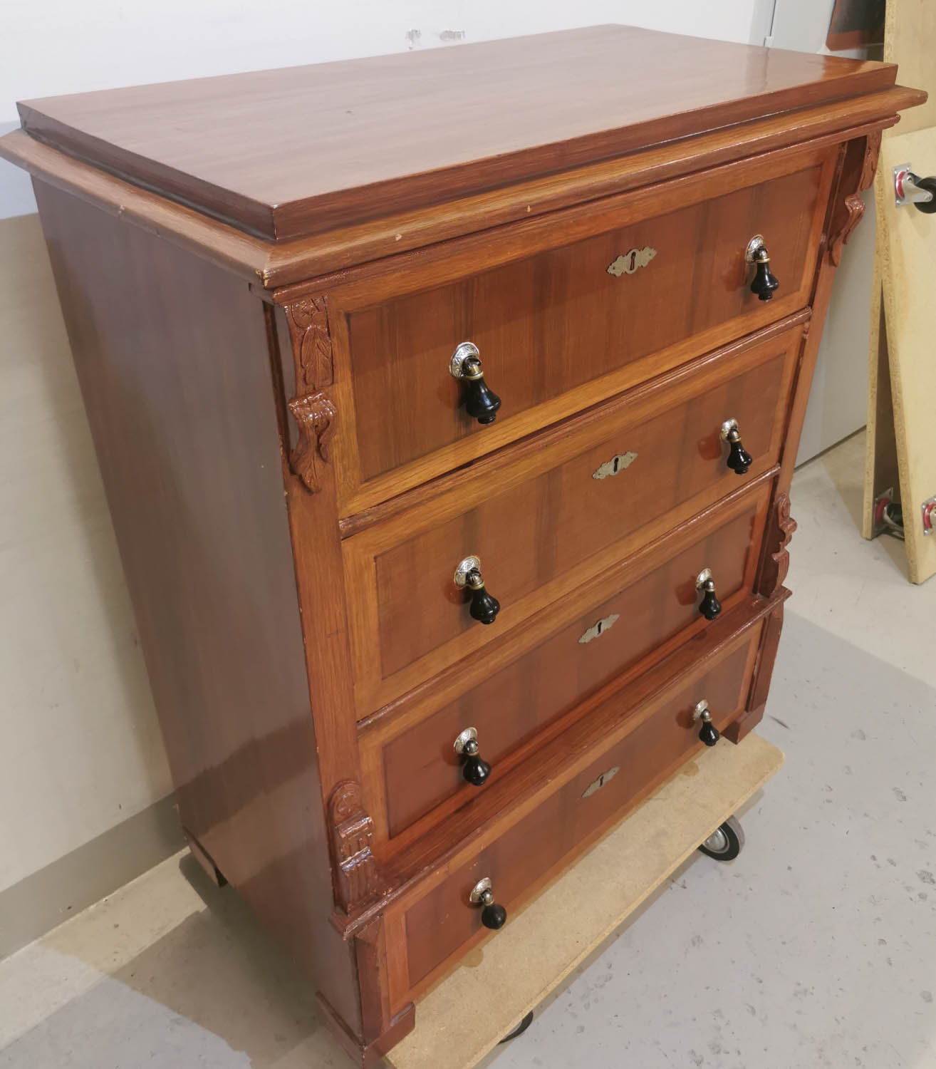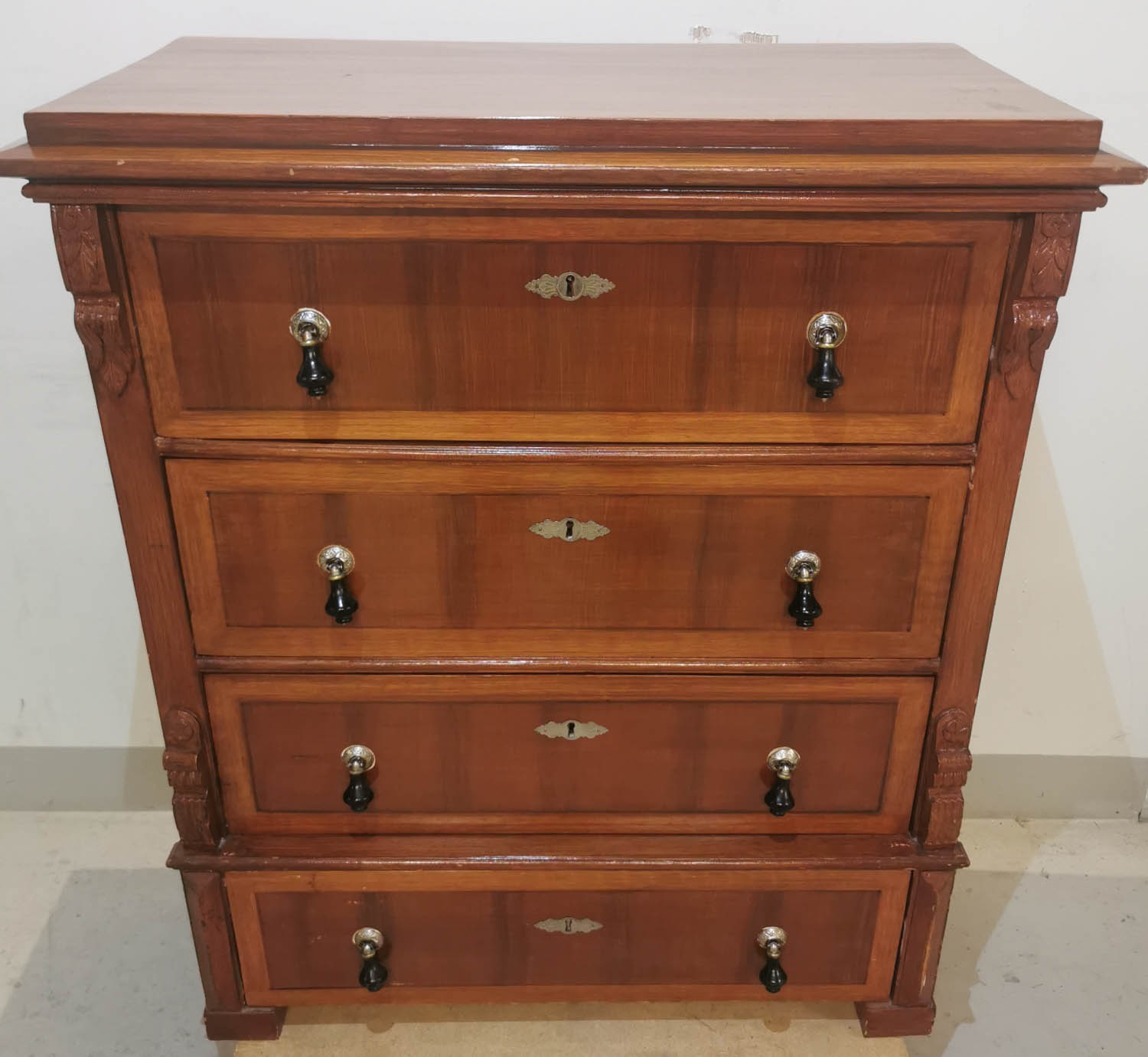 Ootrattu lipasto 1800-luvun lopulta, laatikoita 4kpl, puiset mustat vetimet, iänmukaista kulumaa, 91x47cm korkeus 107cm