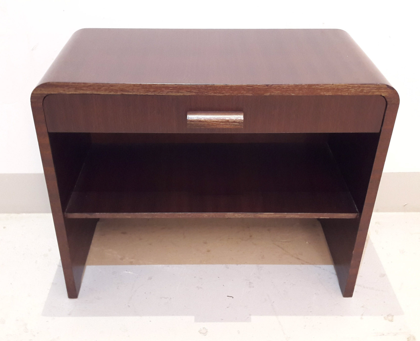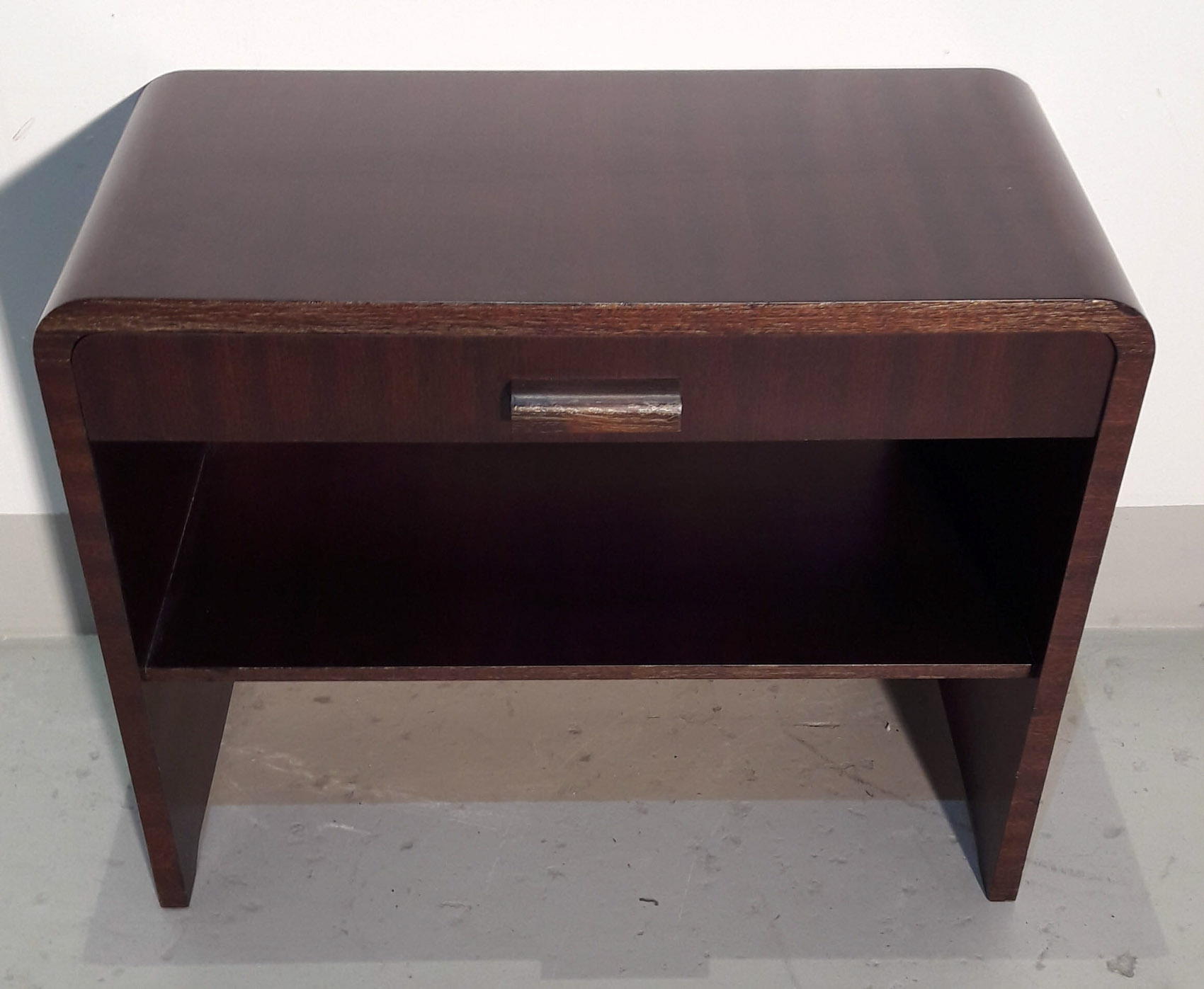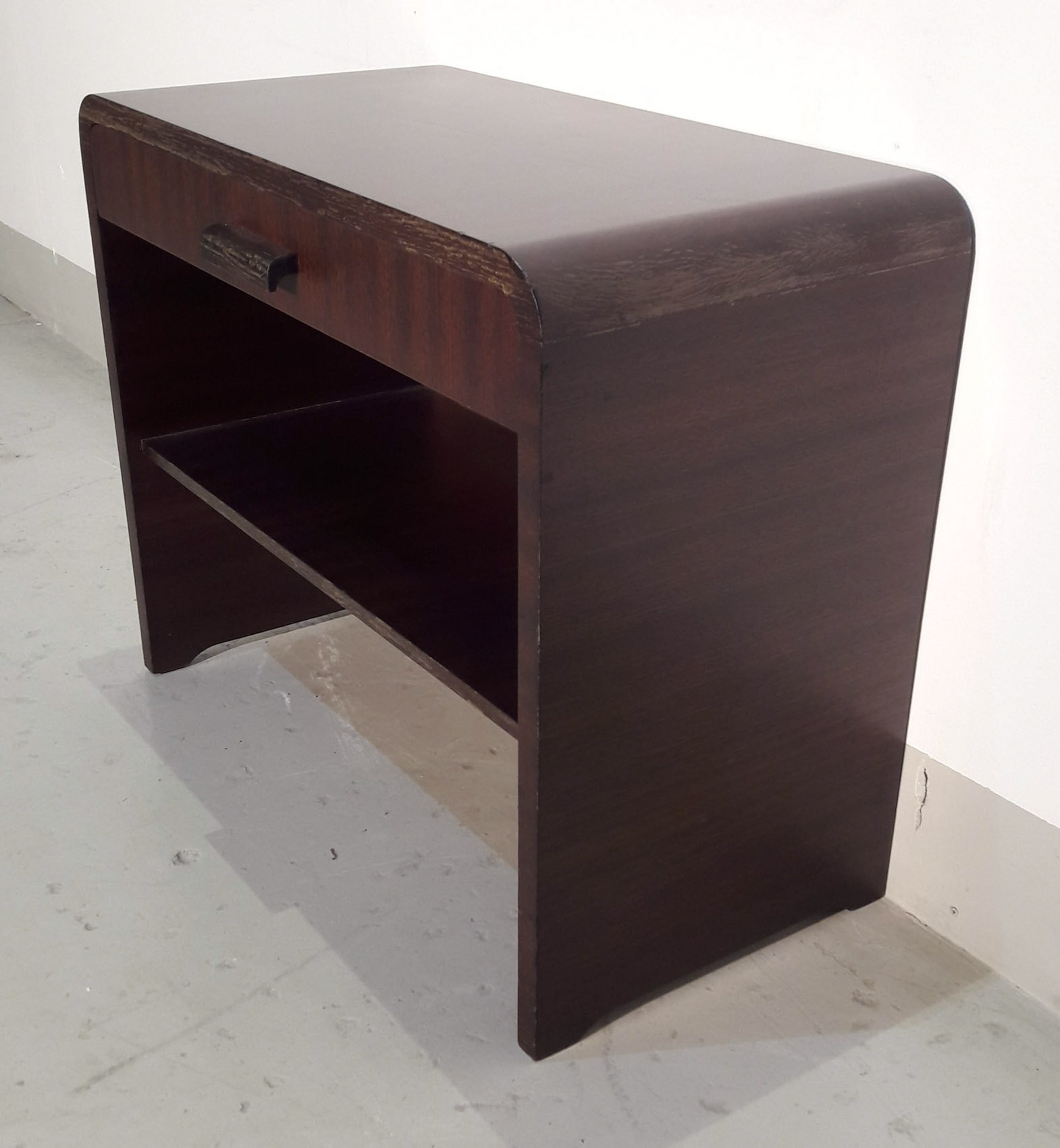 Tumma kunnostettu radiopöytä, noin 1940-50 luvun vaihteesta, taso ja 1 laatikko.