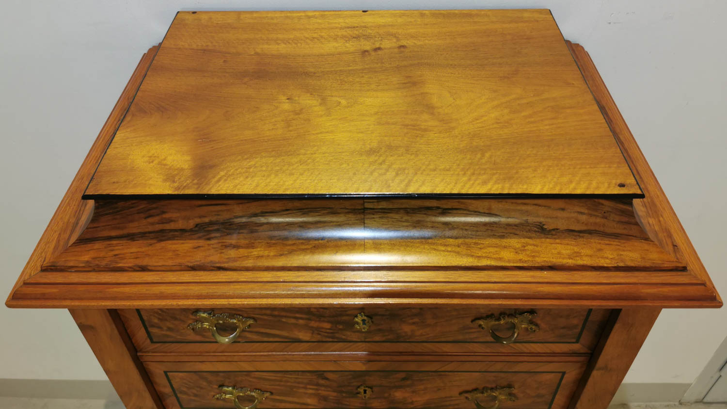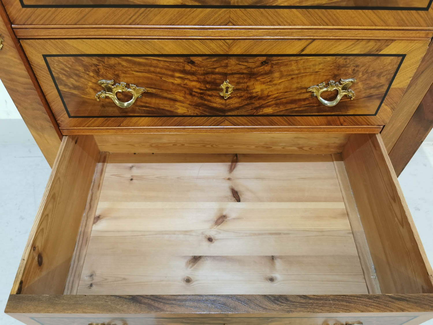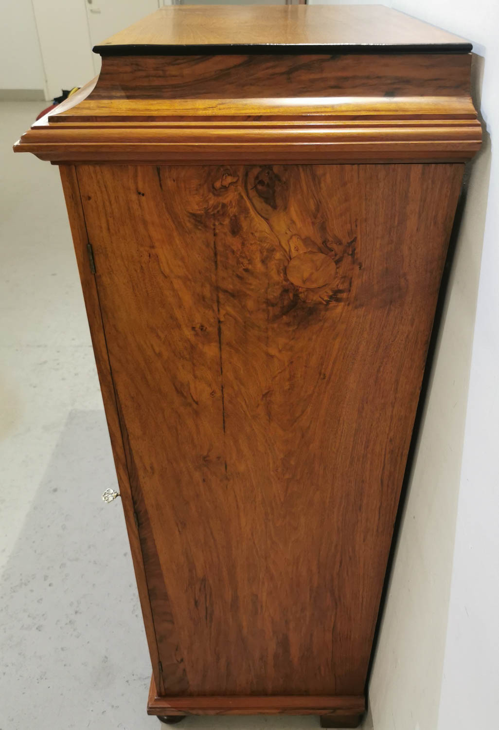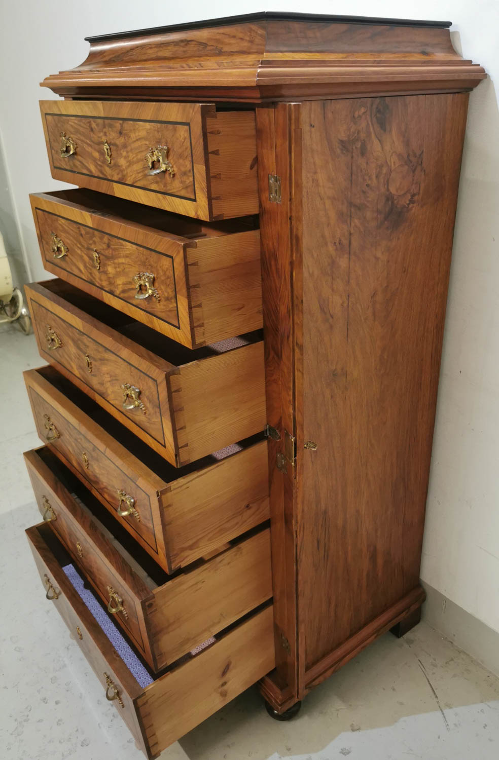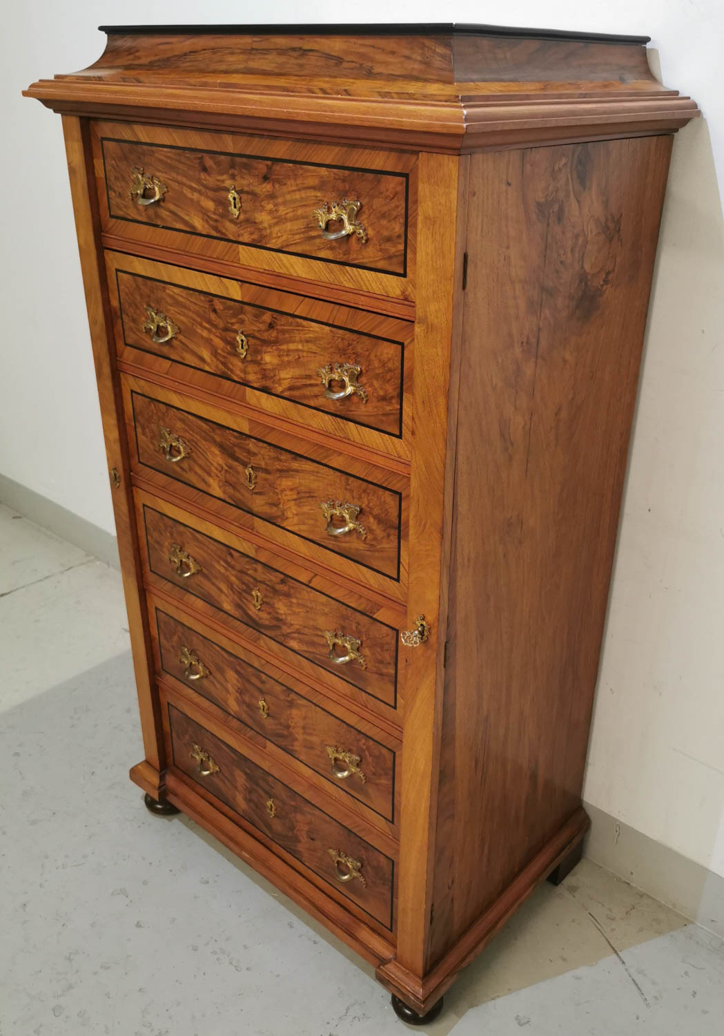 Lipasto, pähkinä/juuri, 1800-luvun lopulta, laatikoita 6 kpl, ns. keskuslukitus, lähes uudenveroinen, ei mitään mainittavia virheitä, kolhuja, ym, ei hajuja, 82×53 K 147cm
