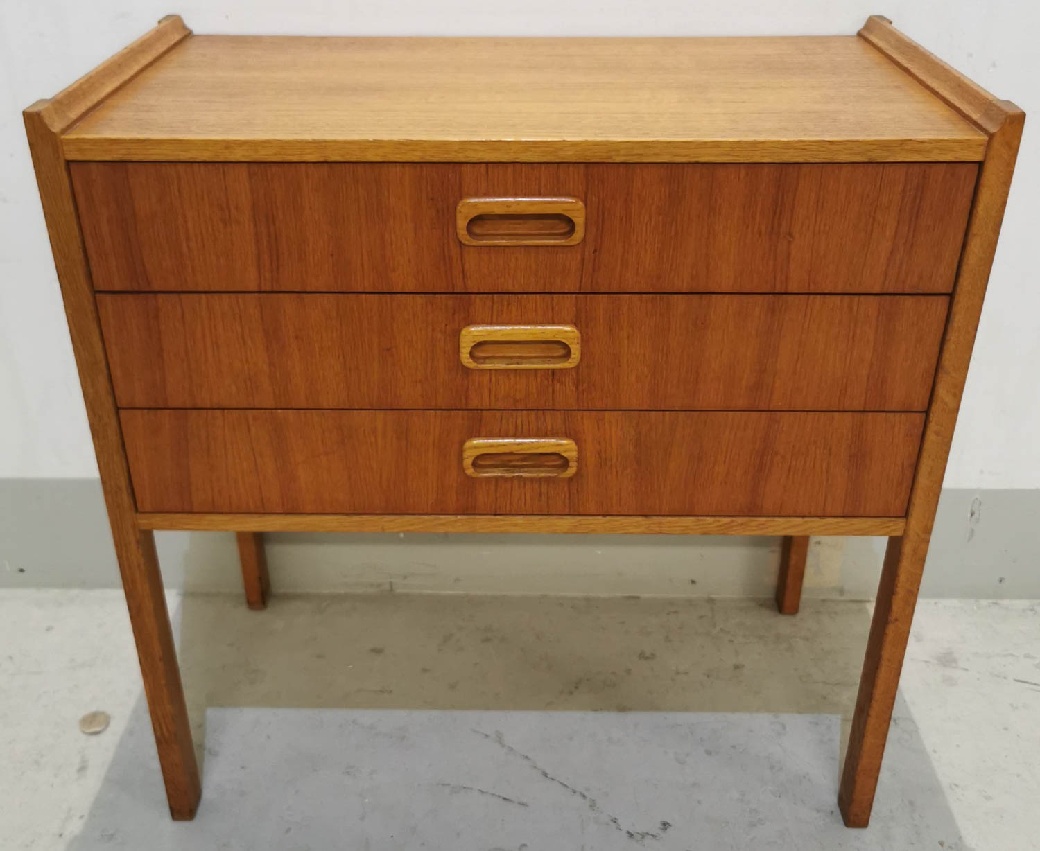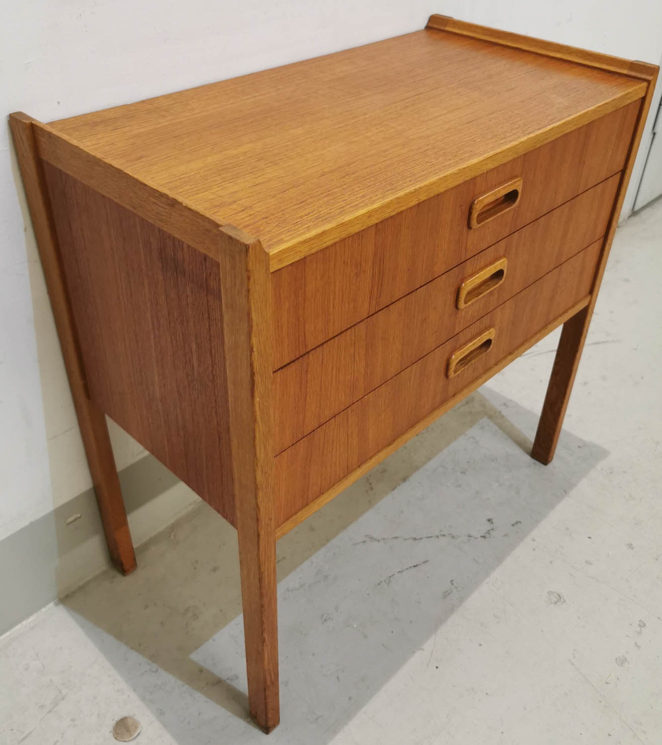 Lipasto, teak, 1950-60 -luvulta, siisti ja hyväkuntoinen, laatikoita 3 kpl, 55 x 29cm korkeus 56cm