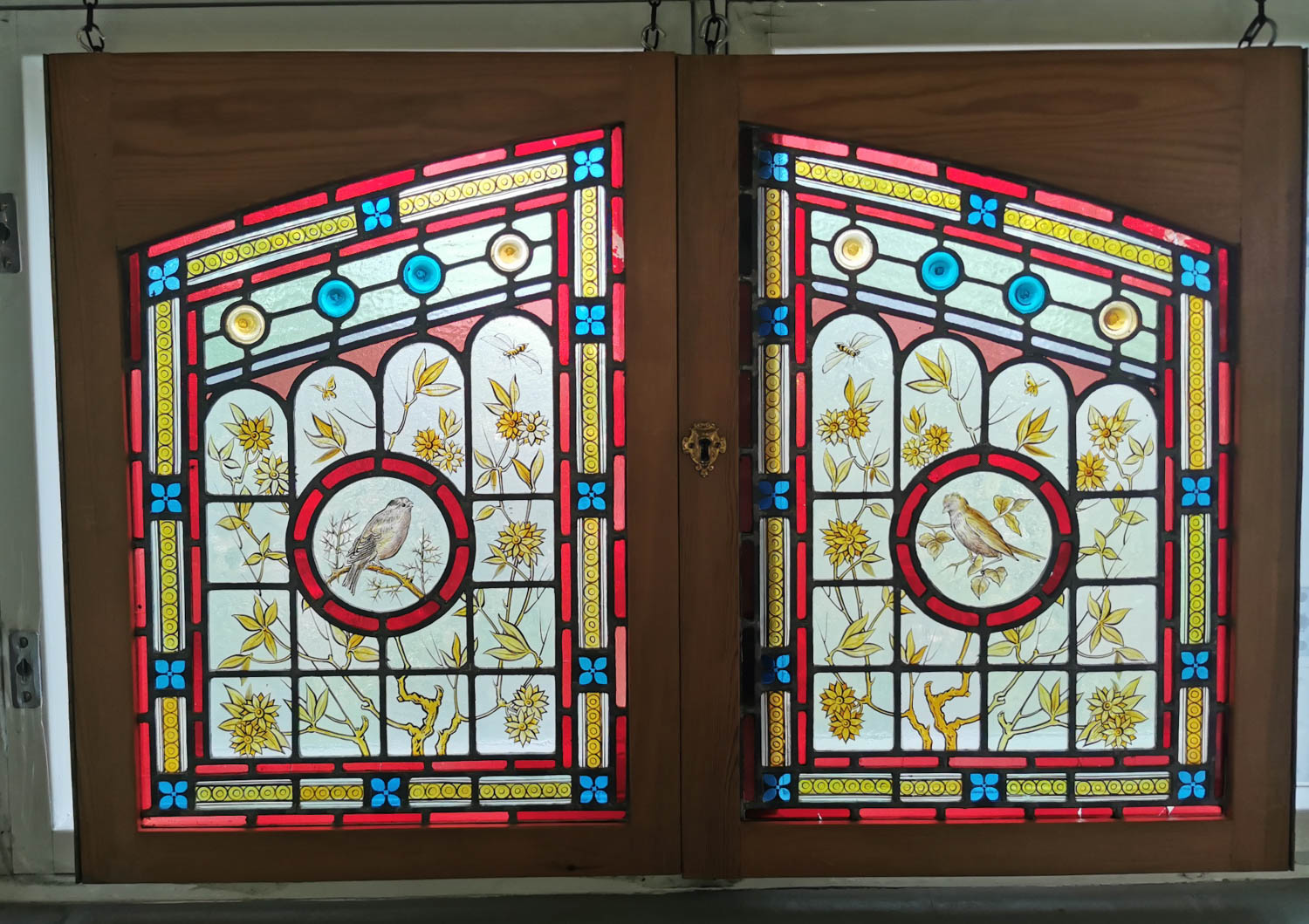 Todella näyttävät lyijylasiovet, lukko paikalla, pianosaranat molemmissa oveissa, leveys 47 korkeus 67cm yhden oven mitta
