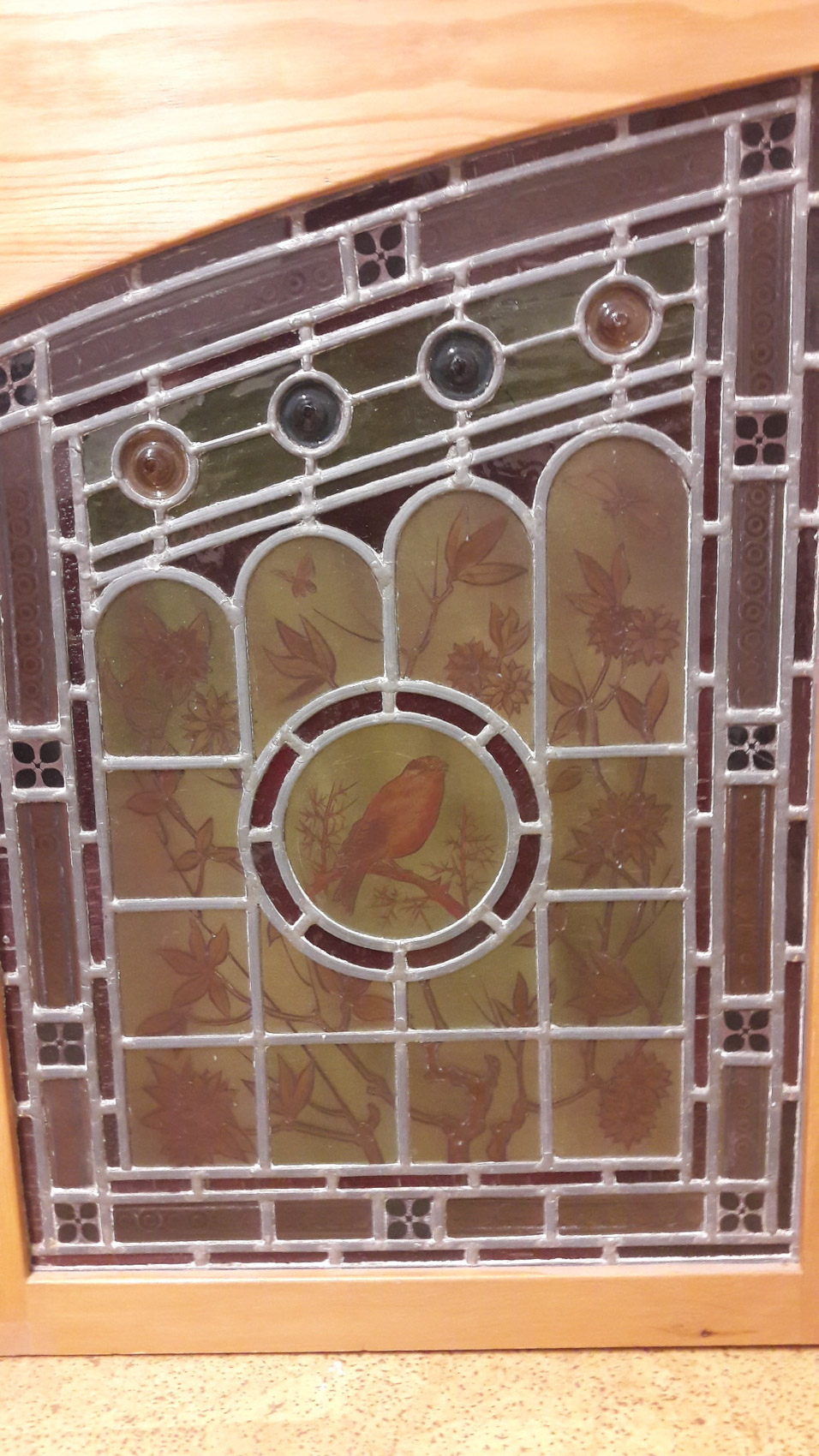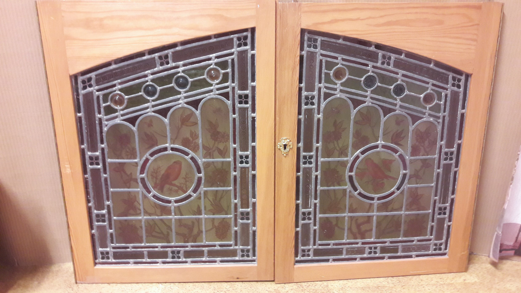 Todella näyttävät lyijylasiovet. Oven runko mäntyä, näyttävä pari. K63 L47, mitta on yhdestä ovesta, lukko paikalla sekä lukon messinkihela, pianosaranat kummassakin ovessa.