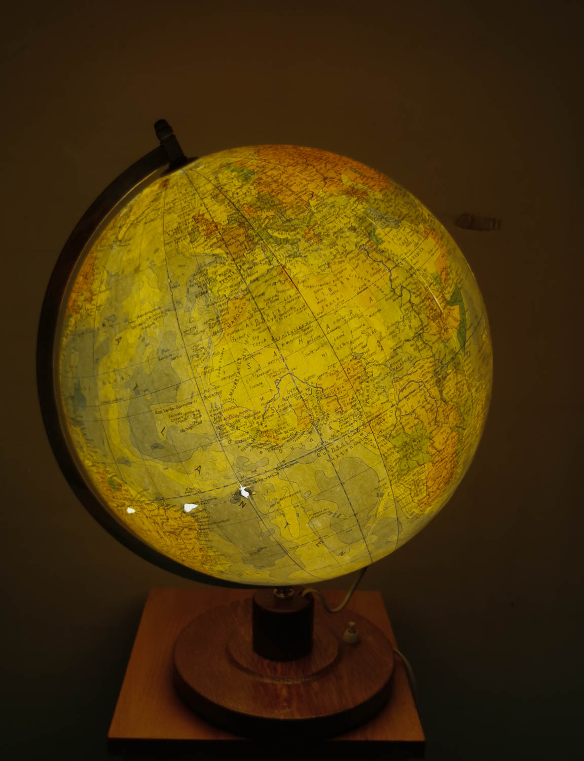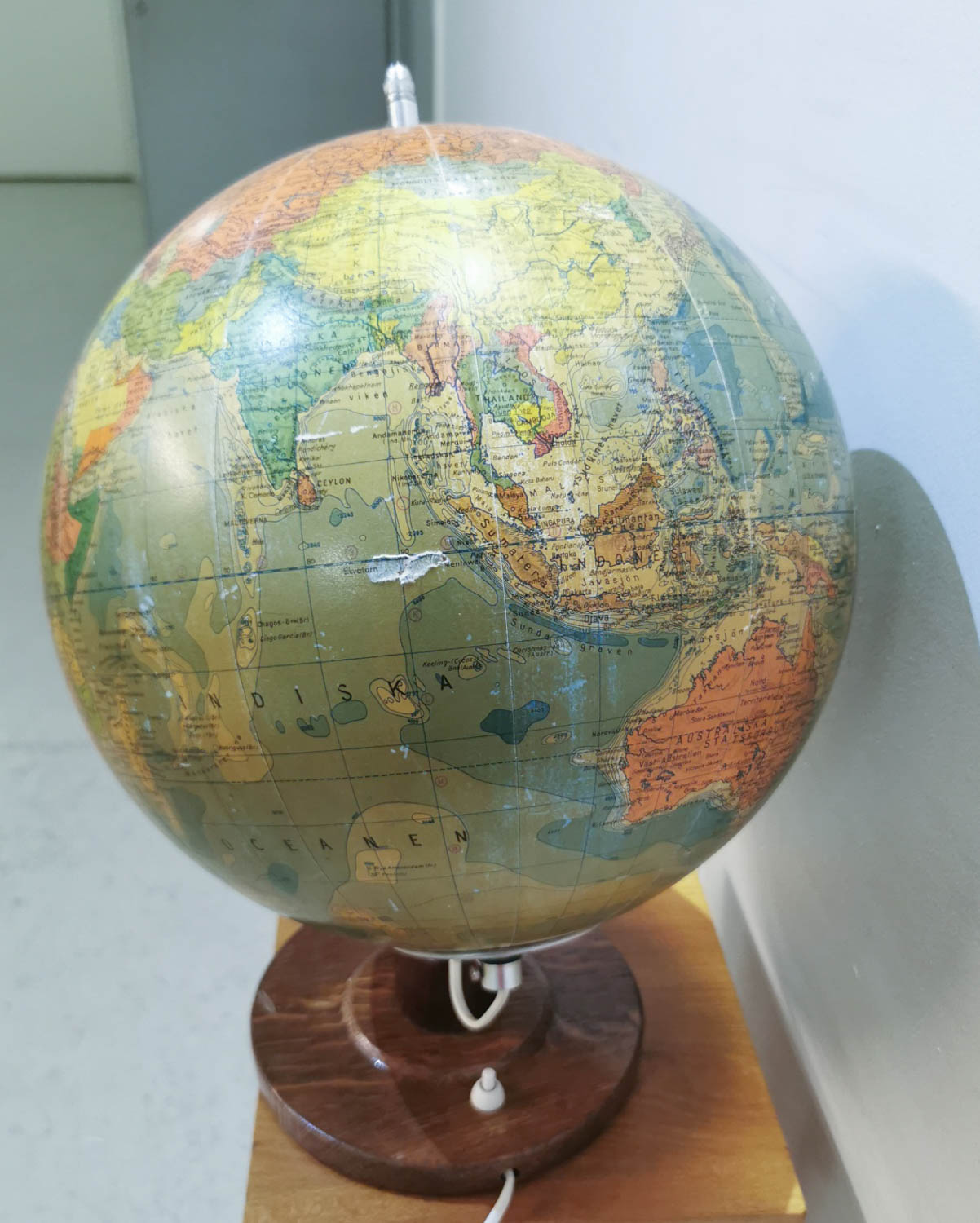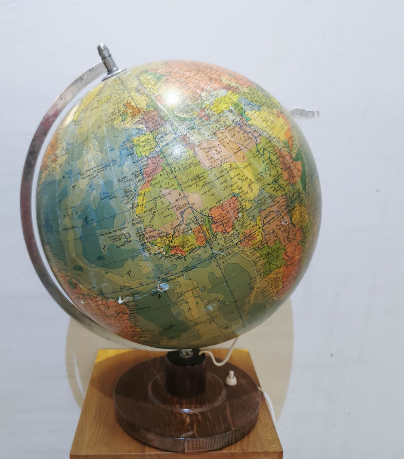 Maapallo, valolla, puinen jalusta, 1940-50 -luvulta, halkaisija 35 cm, korkeus 45 cm, kulumaa, käytön jälkiä.