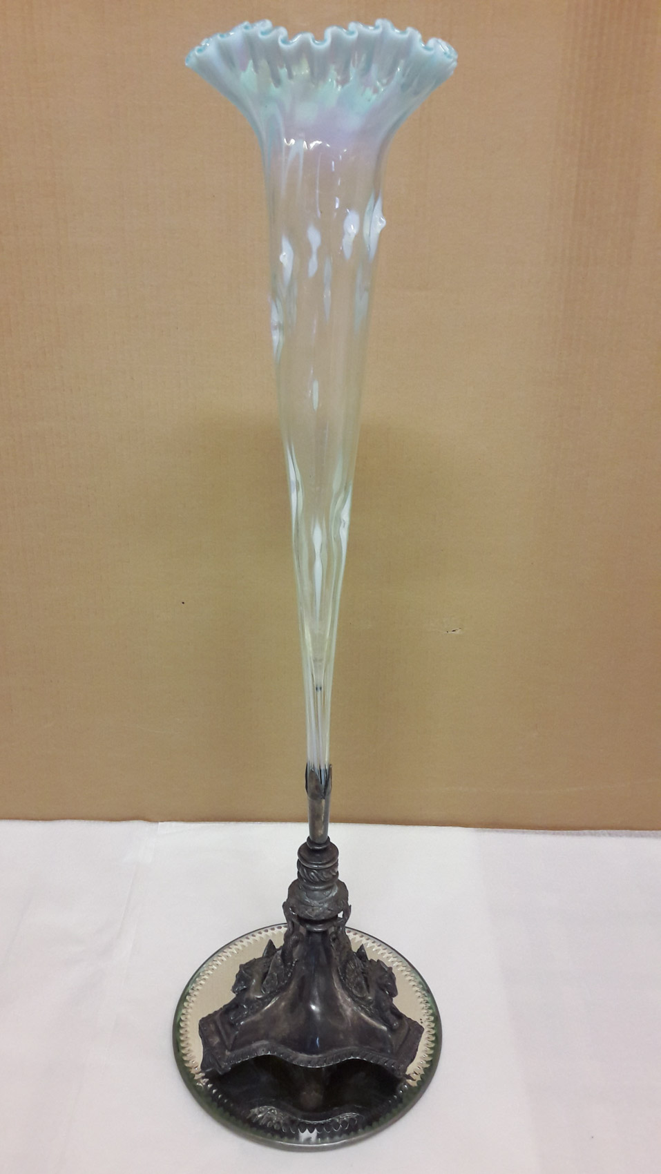 Korkea yhden ruusun maljakko, mahdollisesti Murano, 1900 luvun alkupuoli, metallinen upea jalka