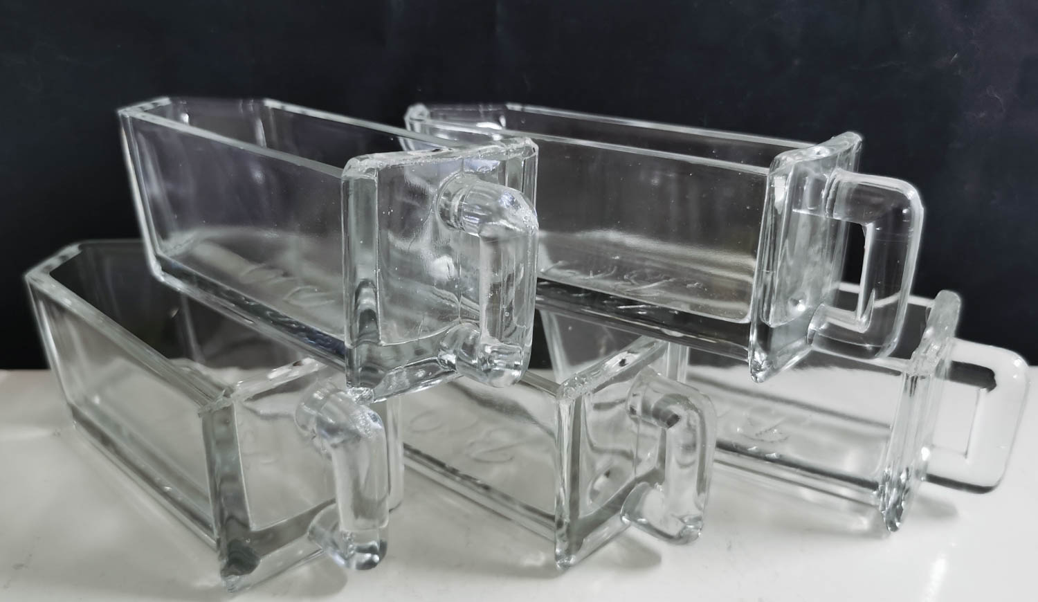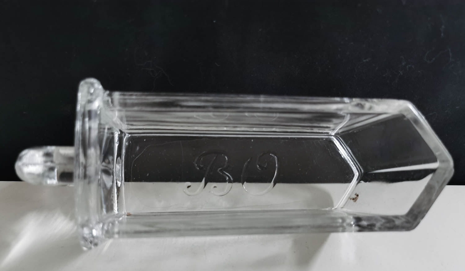 Maustehyllyn lasiset maustekulhot, pöhjassa merkintä BO Pituus 14cm + kahva, korkeus 5cm Leveys 5 cm