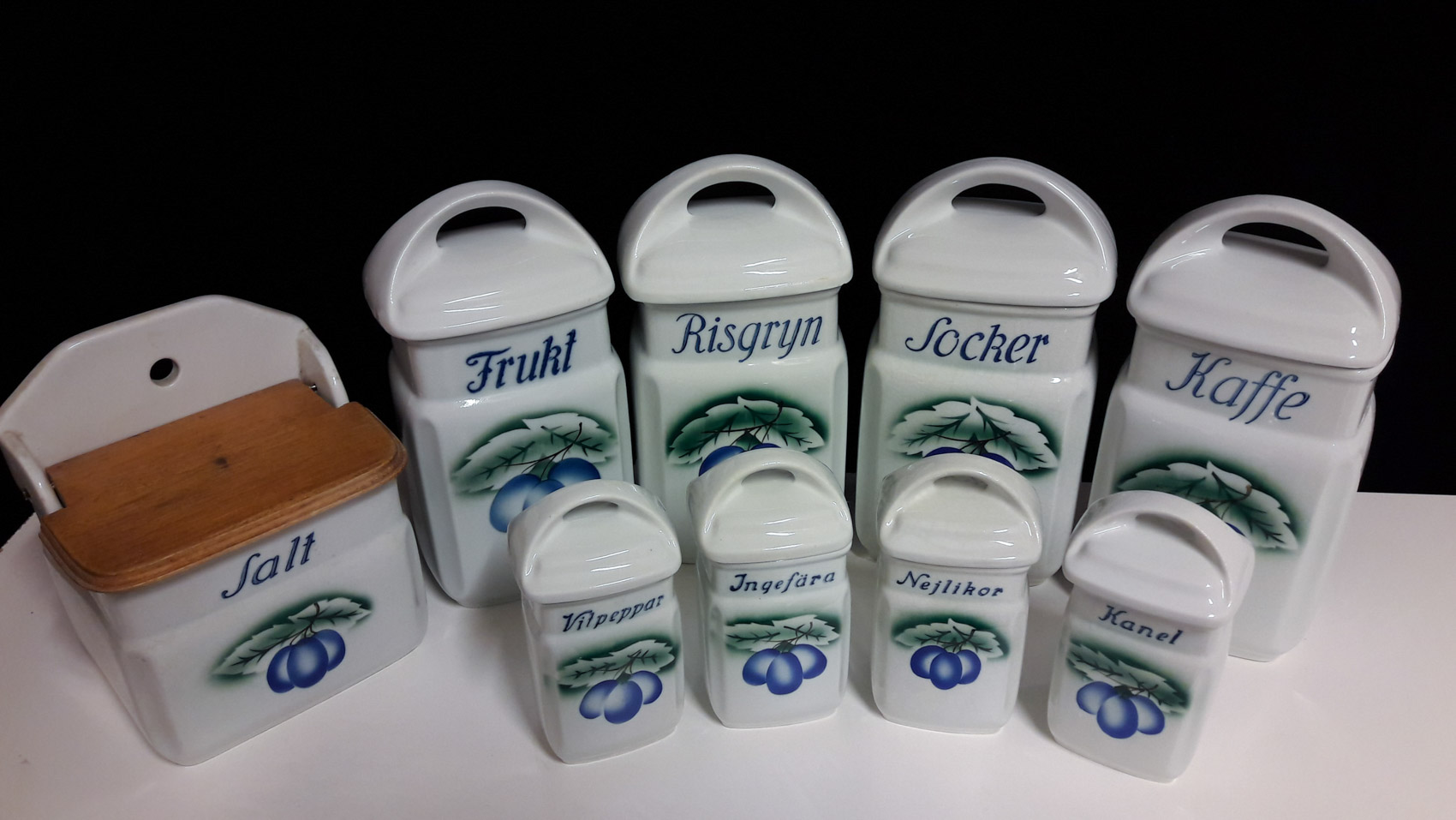 Maustepurkit, luumukuviolla, osassa purkeissa Arabian piippuleimaa, 1932-49, osaa ilman leimaa, Hinta 65€ – 120€ kpl.