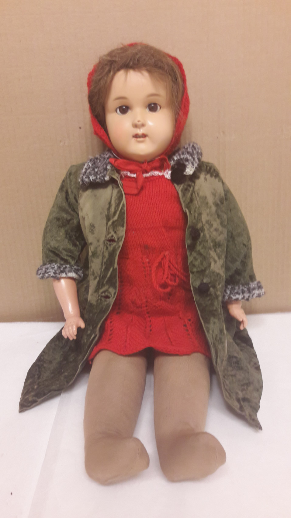 Nukke, aivan 1900 luvun alku, sekä vanhat vaatteet, pituus 52cm