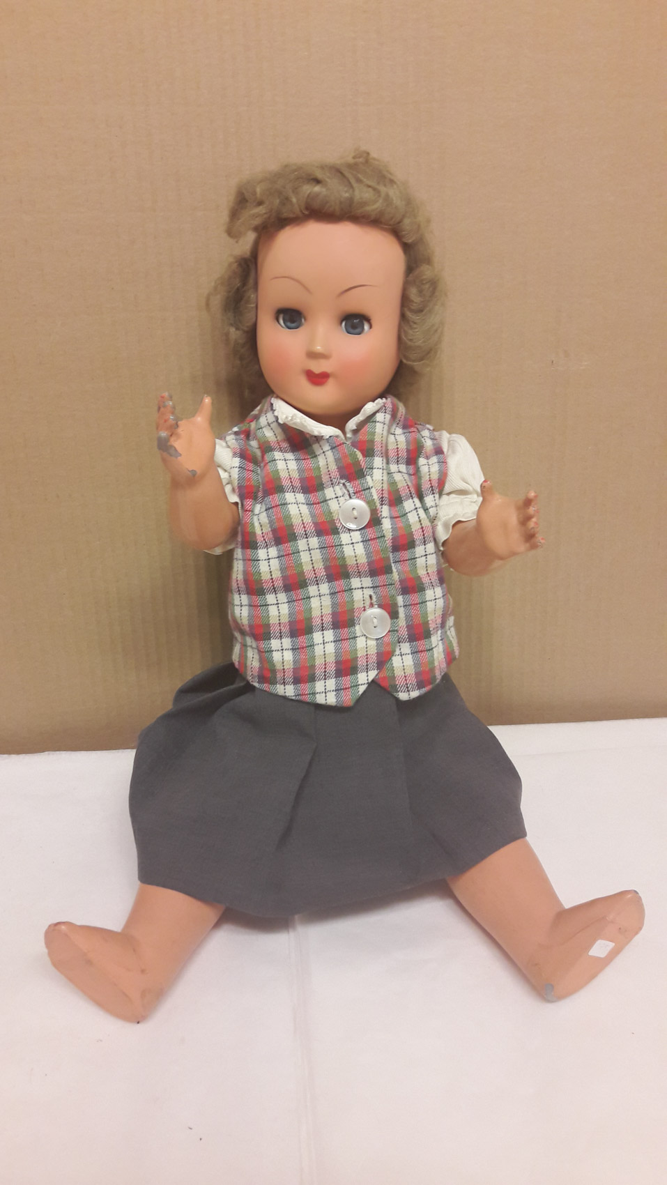 Nukke, 1900 luvun alkupuoli, harmaa hame, ja ruudullinen pusero, valkoinen paita, pituus 38cm