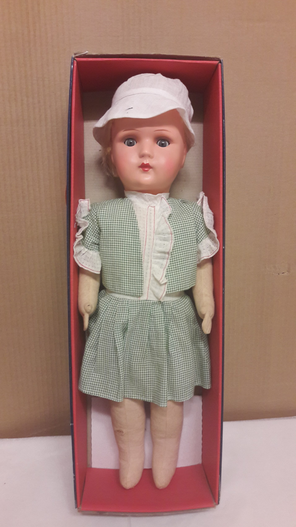 Nukke, vuodelta 1935, niskassa iso K, valkoinen alusasu, vihreää jakkuhame, valkoinen lakki, pehmeä vartalo, liikkuvat silmät, pituus 45cm