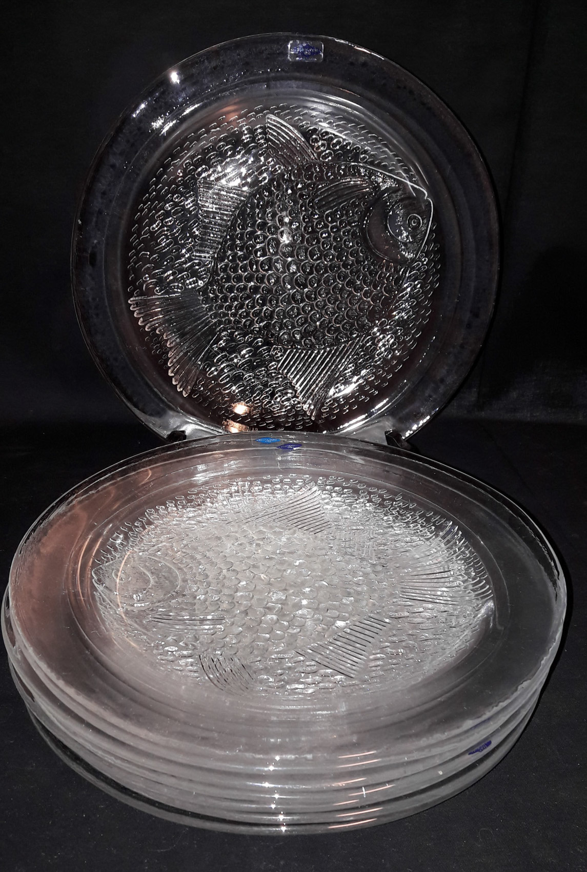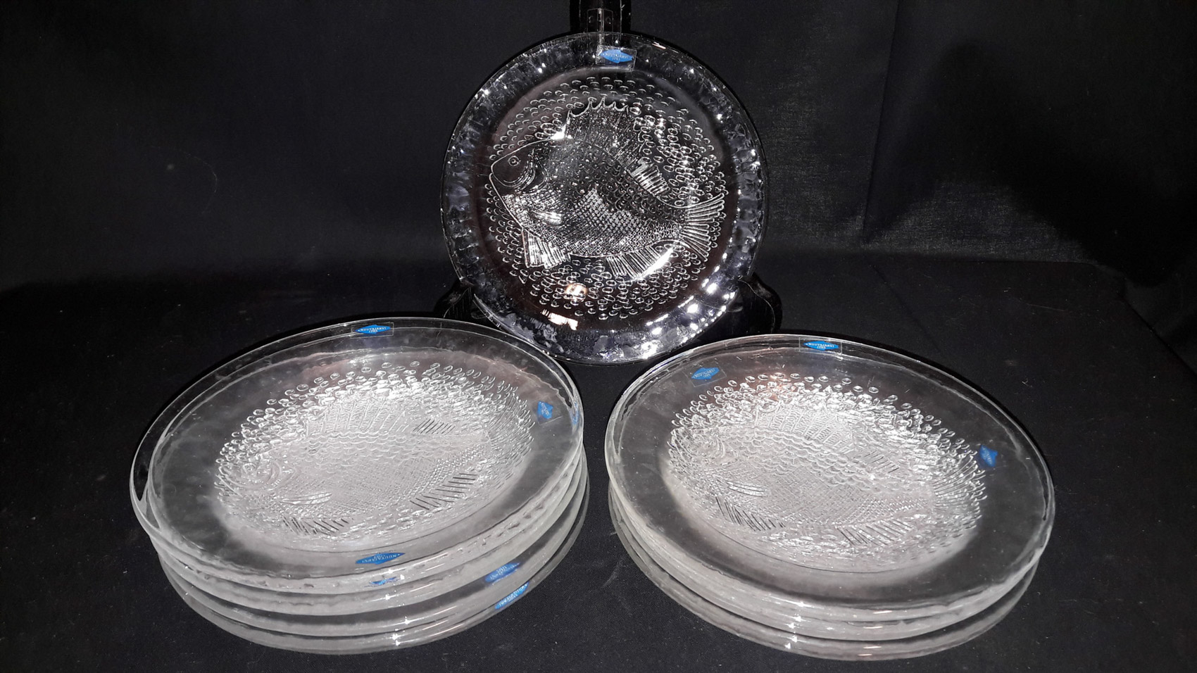 Kalalautaset Nuutajärvi, halkaisija 26cm, 8kpl, sekä 14kpl halkaisija 16.5cm, tarjoiluastia 43×29.5cm, 23 osaa =250€